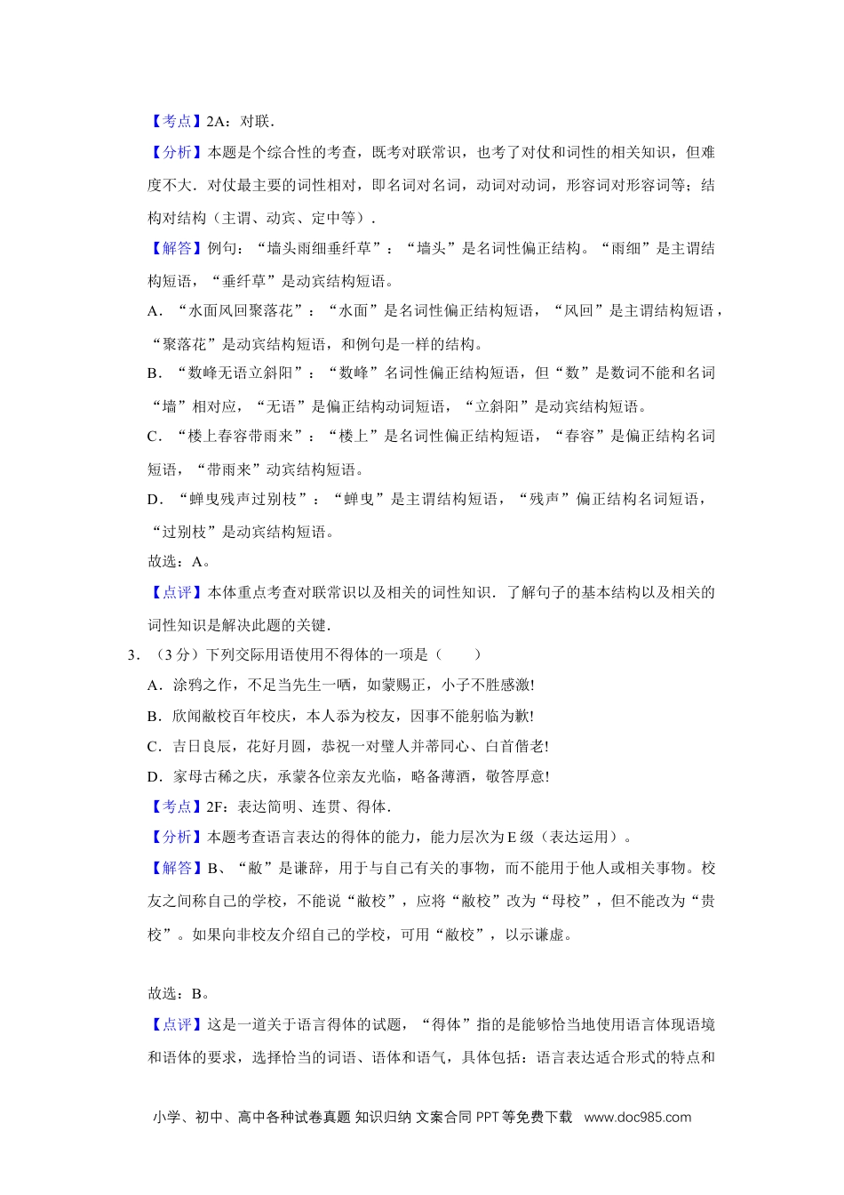 2014年江苏省高考语文试卷解析版参考答案与试题解析一、语言文字运用(15分)1.(3分)在下面一段话空缺处依次填人词语,最恰当的一组是()最使我艳羡的还是园林艺术家化平淡为神奇的_______.某些树木当植当伐;某些花卉当疏当密;何处须巧借地形,顺势筑坡;何处又宜少见轩敞,__________:所有这一切都煞费心血,但又不露惨淡经营的痕迹,正像一帧名作脱稿前画师那奇绝而_________的点睛之笔。A.用心别树一帜浑成B.匠心别树一帜饱满C.匠心别有洞天浑成D.用心别有洞天饱满【考点】13:字义、词义辨析;19:词语(熟语)使用.菁优网版权所有【分析】解答此题的关键是掌握相似、相近词语在意思上的细微差别,正确辨别他们的感情色彩、修饰对象、使用范围等.解答时联系上下文,从词语与语境的语意关系、搭配关系等方面筛选,再运用排除法排除不符合句意的选项.【解答】匠心,一指文学艺术上的构思,二指工匠的心思,常指文学艺术方面创造性的构思。用心,指集中注意力;使用心力;专心。别有洞天:洞中另有一个天地。形容风景奇特,引人入胜。也谓尘世之外,另有仙境。别树一帜:比喻另创一家或另创局面。浑成:(1)。天然生成。(2)。常形容文学艺术作品等自然,浑然一体,不见雕凿的痕迹。饱满(1)丰满;充实(2)充满感情的。依据语段中的“艺术家”“神奇”“煞费心血”“不露痕迹”“奇绝”等字眼,第一空应选填“匠心”一词,突出“巧”字;“园林”是风景胜地,所以排除“别树一帜”;“点睛之笔”不能用“饱满”一词来修饰,因为“点睛之笔”所用之笔墨少而恰到好处,不是描绘。故选:C。【点评】此题主要考查正确使用词语(成语)的能力.在平时的复习中应养成规范使用汉语言文字的习惯,不要被一些媒体的错误用法所误导.2.(3分)下列诗句与“墙头雨细垂纤草”对仗工整的一项是()A.水面风回聚落花B.数峰无语立斜阳C.楼上春容带雨来D.蝉曳残声过别枝小学、初中、高中各种试卷真题知识归纳文案合同PPT等免费下载www.doc985.com【考点】2A:对联.菁优网版权所有【分析】本题是个综合性的考查,既考对联常识,也考了对仗和词性的相关知识,但难度不大.对仗最主要的词性相对,即名词对名词,动词对动词,形容词对形容词等;结构对结构(主谓、动宾、定中等).【解答】例句:“墙头雨细垂纤草”:“墙头”是名词性偏正结构。“雨细”是主谓结构短语,“垂纤草”是动宾结构短语。A.“水面风回聚落花”:“水面”是名词性偏正结构短语,“风回”是主谓结构短语,“聚落花”是动宾结构短语,和例句是一样的结构。B.“数峰无语立斜阳”:“数峰”名词性偏正结构短语,但“数”是数词不能和名词“墙”相对应,“无语”是偏正结构动词短语,“立斜阳”是动宾结构短语。C.“楼上春容带雨来”:“楼上”是名词性偏正结构短语,“春容”是偏正结构名词短语,“带雨来”动宾结构短语。D.“蝉曳残声过别枝”:“蝉曳”是主谓结构短语,“残声”偏正结构名词短语,“过别枝”是动宾结构短语。故选:A。【点评】本体重点考查对联常识以及相关的词性知识.了解句子的基本结构以及相关的词性知识是解决此题的关键.3.(3分)下列交际用语使用不得体的一项是()A.涂鸦之作,不足当先生一哂,如蒙赐正,小子不胜感激!B.欣闻敝校百年校庆,本人忝为校友,因事不能躬临为歉!C.吉日良辰,花好月圆,恭祝一对璧人并蒂同心、白首偕老!D.家母古稀之庆,承蒙各位亲友光临,略备薄酒,敬答厚意!【考点】2F:表达简明、连贯、得体.菁优网版权所有【分析】本题考查语言表达的得体的能力,能力层次为E级(表达运用)。【解答】B、“敝”是谦辞,用于与自己有关的事物,而不能用于他人或相关事物。校友之间称自己的学校,不能说“敝校”,应将“敝校”改为“母校”,但不能改为“贵校”。如果向非校友介绍自己的学校,可用“敝校”,以示谦虚。故选:B。【点评】这是一道关于语言得体的试题,“得体”指的是能够恰当地使用语言体现语境和语体的要求,选择恰当的词语、语体和语气,具体包括:语言表达适合形式的特点和小学、初中、高中各种试卷真题知识归纳文案合同PPT等免...
