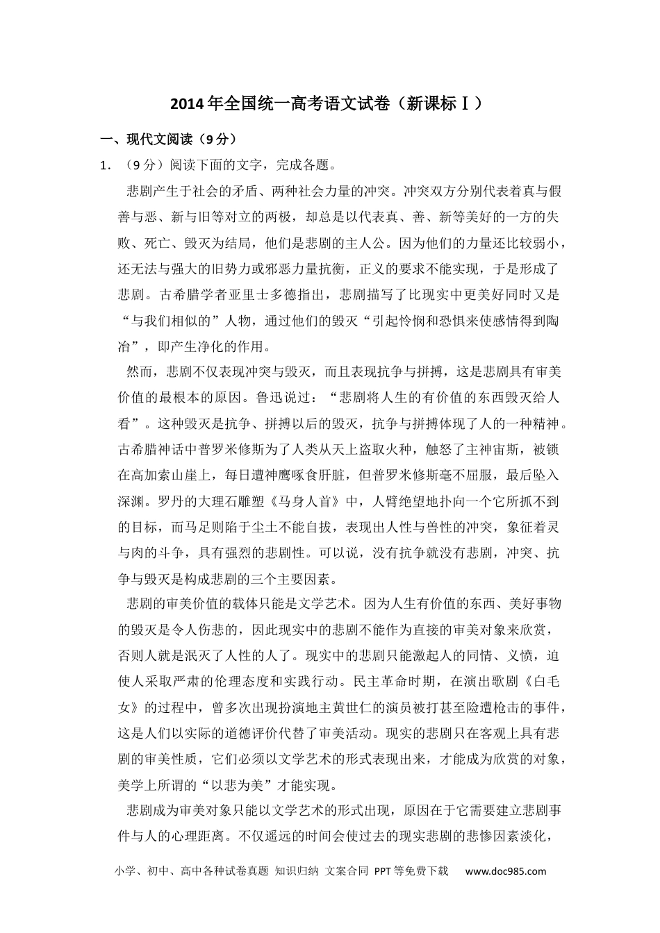 小学、初中、高中各种试卷真题知识归纳文案合同PPT等免费下载www.doc985.com2014年全国统一高考语文试卷(新课标Ⅰ)一、现代文阅读(9分)1.(9分)阅读下面的文字,完成各题。悲剧产生于社会的矛盾、两种社会力量的冲突。冲突双方分别代表着真与假善与恶、新与旧等对立的两极,却总是以代表真、善、新等美好的一方的失败、死亡、毁灭为结局,他们是悲剧的主人公。因为他们的力量还比较弱小,还无法与强大的旧势力或邪恶力量抗衡,正义的要求不能实现,于是形成了悲剧。古希腊学者亚里士多德指出,悲剧描写了比现实中更美好同时又是“与我们相似的”人物,通过他们的毁灭“引起怜悯和恐惧来使感情得到陶冶”,即产生净化的作用。然而,悲剧不仅表现冲突与毁灭,而且表现抗争与拼搏,这是悲剧具有审美价值的最根本的原因。鲁迅说过:“悲剧将人生的有价值的东西毁灭给人看”。这种毁灭是抗争、拼搏以后的毁灭,抗争与拼搏体现了人的一种精神。古希腊神话中普罗米修斯为了人类从天上盗取火种,触怒了主神宙斯,被锁在高加索山崖上,每日遭神鹰啄食肝脏,但普罗米修斯毫不屈服,最后坠入深渊。罗丹的大理石雕塑《马身人首》中,人臂绝望地扑向一个它所抓不到的目标,而马足则陷于尘土不能自拔,表现出人性与兽性的冲突,象征着灵与肉的斗争,具有强烈的悲剧性。可以说,没有抗争就没有悲剧,冲突、抗争与毁灭是构成悲剧的三个主要因素。悲剧的审美价值的载体只能是文学艺术。因为人生有价值的东西、美好事物的毁灭是令人伤悲的,因此现实中的悲剧不能作为直接的审美对象来欣赏,否则人就是泯灭了人性的人了。现实中的悲剧只能激起人的同情、义愤,迫使人采取严肃的伦理态度和实践行动。民主革命时期,在演出歌剧《白毛女》的过程中,曾多次出现扮演地主黄世仁的演员被打甚至险遭枪击的事件,这是人们以实际的道德评价代替了审美活动。现实的悲剧只在客观上具有悲剧的审美性质,它们必须以文学艺术的形式表现出来,才能成为欣赏的对象,美学上所谓的“以悲为美”才能实现。悲剧成为审美对象只能以文学艺术的形式出现,原因在于它需要建立悲剧事件与人的心理距离。不仅遥远的时间会使过去的现实悲剧的悲惨因素淡化,小学、初中、高中各种试卷真题知识归纳文案合同PPT等免费下载www.doc985.com就是很近的时间间隔也可以使人不陷入现实。这里还有一个空间的间隔,悲剧艺术展现的毕竟是一个人们不熟悉或有点陌生的空间,这就使人们不容易介入其中,而能够客观、超然地看待。当然,在欣赏中审美主体可以“审美地”加入悲剧冲突,体验悲剧客体的巨大和狂暴、悲剧主体的抗争和悲痛,从而感受到强烈的震撼和刺激,获得悲剧感和审美愉悦。悲剧表现的不是人生的欢乐或全然的幸福,而是悲剧主体对待痛苦和死亡的方式,这是人类社会和人类活动中十分重要、严肃的一面。悲剧在表现对伟大和崇高的人的摧毁的同时,更表现出无法摧毁的人的伟大和崇高。(摘编自王晓旭《美的奥秘》)(1)下列各项中,其性质不属于原文所论悲剧的一项是A.在梁山伯与祝英台的故事中,祝英台女扮男装外出求学,为追求爱情自由,面对封建势力的巨大压力,拒绝委曲求全,最后触碑殉情,化成蝴蝶。B.老舍笔下的祥子,纯朴善良,勤劳能干,有着骆驼般坚韧的精神度的沉重打击之后,沦为自甘堕落的行尸走肉。在饱受旧社会、旧制的沉重打击之后,沦为自甘堕落的行尸走肉。C.在电影《狼牙山五壮士》中,五位八路军战士为了掩护大部队撤退及当地群众安全转移,阻击了3000多名日寇的多次进攻,弹尽粮绝之后,跳下悬崖。D.在甲午海战中,清军致远舰在中弹累累、舰身倾斜、弹药耗尽的情况下,开足马力,冲向日本吉野舰,最后被鱼雷击中,沉人海中,200多名官兵壮烈殉国。(2)下列理解,不符合原文意思的一项是A.在悲剧冲突中,代表真、善、新等美好的一方总是以失败、死亡、毁灭为结局,他们是悲剧的主人公,即悲剧主体,而其对立面则是悲剧客体。B.在罗丹的《马身人首》雕塑中,人首和人臂是人、灵和人性的象征,马身和马足则是兽、肉和兽性的象征,兽性和人性的矛盾构成了人间的悲剧。C.当悲剧以文学艺术的形式出现,悲剧...