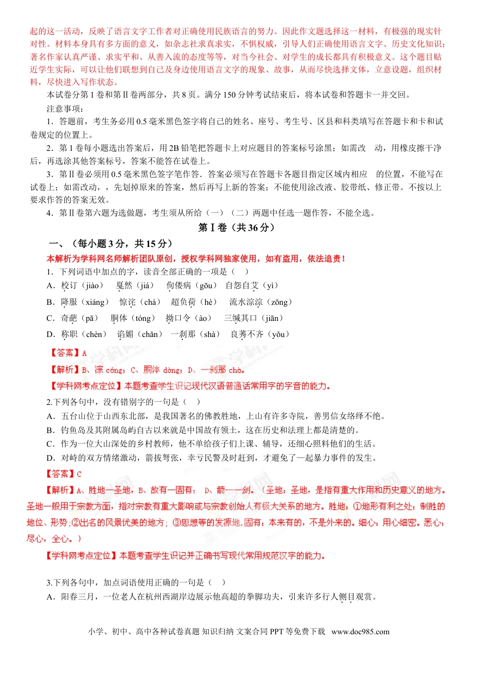 【学科网试卷总评】本题考查学生今年的试题与往年试题保持内容、形式、难度、区分度的连续性与稳定性。考试内容,符合《考试说明》的要求,注重考查考生的语文基本知识和基本能力,并注重对考生的语文应用能力和审美、探究能力的考查。”试题不超纲,难易适中。在语文基本知识和基本能力方面,第一题考查常用字的读音、常用字字形、常用词(包括成语)、标点符号的正确使用和辨析病句。本题内容与往年基本一致,但是今年这一题选材语文特征典型,相关句子内容活泼健康,趣味横生,除了考试功能外,有很好的可读性。一般论述类、文学类文本、实用类文本三篇现代文阅读材料,从选材内容、文体基本保持往年的思路。古文、古代诗歌也是如此。同时试卷中也有出新之处,例如第2题考查常用字的使用,出新之处是将错字放在句子中,一方面符合错字使用的常见情形,一方面对考生形成了一定的迷惑。如“五台山位于山西东北部,是我国著名的佛教胜地,山上有许多寺院,善男信女络绎不绝。”“胜地”对同音词“圣地”的误用,必须依赖具体语言环境才能鉴别,可以更好地考查考生的语言功底和分析问题的能力。第16题填写关联词语,这是比较新的考法,用以检测考生的逻辑能力;第18题给“创造”下定义,这也是一种新考法,它介于归纳概括信息与表达之间,可以考查考生阅读、提炼、概括、表达等综合能力。整个试卷中现代文的论述类、文学类、实用类与古文、古诗的选材对试卷风格影响很大。论述类选择的是关于中国艺术境界的论述,全文以中国画为据,文字秀美,论证过程清晰。文学类选取的是余华的《活着》,生活气息浓郁,人物性格鲜明。实用类选取的是沈从文的《定和是个音乐迷》,包含着民国作家的深邃、含蓄和恣纵。古文另辟蹊径,选择明代最优秀的散文家宋濂的《看松庵记》,第一次把古代“记”体引入高考试卷中,可以拓展学生关于古文文体的认知。古诗选择晚清江湜的写景抒情诗,其意境之优美,一点也不亚于唐宋诗词。这些选材都表现了尝试与出新,给人耳目一新的感觉。在设题方面出现了新的亮点。往年的试题较多在语句、文字上做无谓的缠绕。今年试题关注了论述文阅读规律,从文体方面加进了设问,如论点、论据、论证方法等,增加了试题的科学性。试题从选材到设题都凸显了语文的本体特征。语言类主要考查了考生的语言识记能力,又在选材中关注了材料的典型性与人文色彩。例如第2题考查正确使用字词,其中的D项材料为:“对峙的双方情绪激动,箭拔弩张,幸亏民警及时赶到,才避免了一起暴力事件的发生。”这是个错项,“箭拔弩张”中的“箭”应为“剑”。这个词的误用较为常见,但错误也是明显的。如果对中国汉语成语并列结构的构成略有了解,与“弩”对应的一定是“剑”而不是“箭”。第3题考查词语的正确使用,其中D项“此前中国航空西南分公司一直与四川航空公司鼎足而立,所占市场份额相差无几。”这个语料考“鼎足而立”的使用。既然鼎足,一定是指三种事物并列,而语料中指出的只有两家,用鼎足而立是错误的。再如第五题中的第18题让考生从一段话中提取信息,限定字数,完成定义,对逻辑思维有很好的考查效果。文学类文本选择余华的著名作品《活着》。此小说寓意深刻丰富,形象生动突出,描写简洁准确,有很高的文学审美水平。试题从小说文体出发,引导考生分析形象,鉴赏关键语句,探究小说寓意的能力,考查了考生的文学审美能力,突出了文体特征。实用类文本《定和是个音乐迷》文体鲜明,传主张定和是现当代著名音乐家,其对音乐追求的人生历程对青年人有很深刻的启发教导作用;行文极富沈氏个性。设题突出了传记文体的特征,全面而富有层次。文言文阅读《看松庵记》内容上文化品格很高;行文漂亮精萃,难易适当,是一篇难得的文学色彩鲜明的好文。江湜的写景抒情诗《山寺夜起》明白如话,景色优美,情感单纯。总之,今年的语文试卷从各方面凸显语文的本体特征。今年的试卷从总体风格凸显了人文精神,比较集中表现于作文命题上。往年的材料作文,或选取名人名言,或选取具有象征意义的诗句格言,今年的作文题针对当前语言运用中出现的问题,从《咬文嚼字》中提炼出材料,此材料有较强...