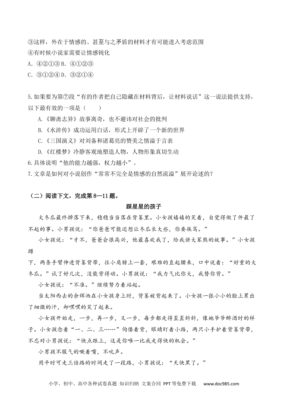 小学、初中、高中各种试卷真题知识归纳文案合同PPT等免费下载www.doc985.com2020年春季高考上海语文一积累应用1.(1)溯洄从之,_______。《蒹葭》(2)_______,善假于物也。《劝学》(3)《山坡羊·潼关怀古》中“,”以比拟手法描绘潼关的险峻地势,极富动感。2.学生想写一幅书法作品送给老师挂在书房,合适的是(老骥伏枥,志在千里)二阅读(一)小说家的情感流溢①优秀的艺术品包括小说常常向人们呈现一种自然而然的状态,仿佛鸟儿的吟唱。但是不管幸还是不幸,人不是鸟,人的吟唱,比如小说写作,常常并不完全是情感的自然流溢。②众所周知,人的情感是有选择性的,面对材料,会排斥与之不合的东西。这种情形,就像机敏的蚂蚁,伸出探测器,找到适合它的食物。所谓的适合,是指材料对具有感受能力的心灵能产生情感上的共鸣。这是情感流溢在小说创作过程中的一般功能。换个角度看,对材料的选择和组织,既是小说家情感的一个功能,也是对情感的检验。当我们读小说时,有时会感到某些部分游离在外。这或者是由于作者对所表述的情感体验不够,或者,尽管在一开始对情感也有所感受,却没有在小说中维持下去,由一串不相关的情感以及由此带来的材料,对作品形成了干扰。③对材料进行有力的选择,将它从数量众多、时空隔离的万物中抽取出来,并将所抽取出来的东西凝聚成一个作品,这一作品是广袤世界和丰富内心的缩影。④我们的世界和内心辽阔而复杂,它坚硬的偶然性和非常态,时时凶悍地超出我们既有的逻辑框架。与此相应,小说中的材料也会由多种外力纠合在一起。材料的多样性,小说各部分材料的选择和结合,往往并不完全表现为逻辑上的必然。小学、初中、高中各种试卷真题知识归纳文案合同PPT等免费下载www.doc985.com⑤因此,抱着既有的一成不变的情感,只选择和运用与之匹配的材料,可以写成一篇合格的小说,对一篇优秀的小说而言却并不充分。这就对小说情感的流溢提出了额外的要求。⑥小说中的情感并不应该是被作者直接表现出来的东西。小说没有情感,也许会有工艺,但没有艺术。如果直接强烈地显现,尽管有情感而且很强烈,其结果也往往不是艺术。小说的笔触不知不觉地带有了某种固定的顺序和连贯性,这貌似完满的表达,却异化为另一种意义上的“逻辑必然”。⑦小说写作不完全是情感的自然流溢,还因为人的行为都受到某种意图的引导。不过,如果小说家目的性太强,就会妨碍他的情感,进而干扰他所运用的材料。当读者感到作者在操纵材料以求得一种事先确定的效果时,读者也会心生反感。读者接受某个喜剧或悲剧,是因为这是材料本身所有的,而不是作者把自己的目的强加给读者的。有的作者把自己隐藏在材料的背后,让材料说话,这样的作品往往更容易打动人心。在这个意义上,我们可以说,小说家的能力越小,他的权力就越大,反过来,他的能力越强,他的权力就越小。⑧但是创作目的又必然存在,那小说家该如何面对这一困境呢?作者创作的情感和读者阅读被激发的情感,都由世界万象引起,并与材料混合在一起。我们厌恶文学中意图的强势入侵,相反,如果实现了材料与情感的有机结合,我们就能接受小说中意图的传递。怜悯或道义之类的意图,可以找到供它燃烧的材料,熔化一切,集合成一个有生命的整体。3.根据文意,与第②段画线句中加点词对应正确的一项是()。(2分)这种情形,就像机敏的蚂蚁,伸出探测器,找到适合它的食物。A.情感眼光材料B.作者情感材料C.作品情感材料D.材料作品情形4.第⑤段□处填入的句子语序正确的是()①留出够的裂缝和空隙⾜②或将其有意遮蔽小学、初中、高中各种试卷真题知识归纳文案合同PPT等免费下载www.doc985.com③这样,外在于情感的、甚与之盾的材料才有可能进考虑范围⾄⽭⼊④有时候说家需要让情感钝化⼩A.④②①③B.④①②③C.③①②④D.③②①④5.如果要为第⑦段“有的作者把自己隐藏在材料背后,让材料说话”这一说法提供支持,以下最有效的一项是()A.《聊斋志异》故事离奇,也不避讳对社会的批判B.《水浒传》成功运用白话,形式上开辟了一个新的世界C.《三国演义》对刘备和诸葛亮的赞美之情溢于言表D.《红楼梦》冷静客观地塑...