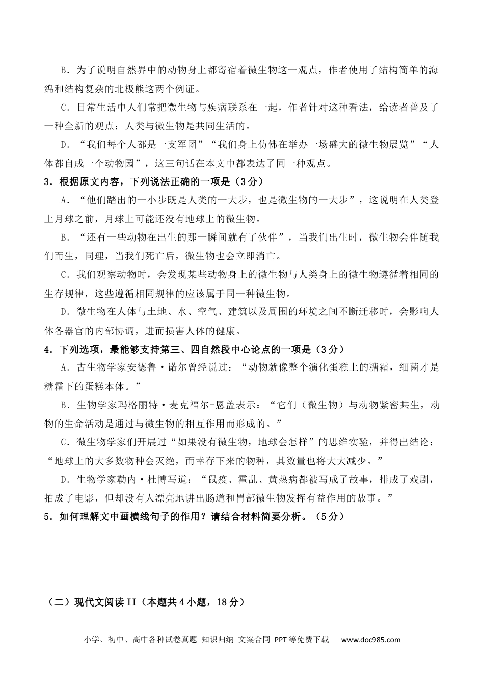 小学、初中、高中各种试卷真题知识归纳文案合同PPT等免费下载www.doc985.com2020年新高考Ⅱ卷(海南)试题一、现代文阅读(35分)(一)现代文阅读I(本题共5小题,17分)阅读下面的文字,完成1~5题。巴巴看起来一点儿也不害怕。它不怕把它团团围住的兴奋的小孩,而是十分镇定地接受着加州夏日烈阳的炙烤。这种漫不经心的态度是能说得通的,因为它就生活在既安全又轻松的环境中。巴巴是一只肚皮雪白的穿山甲,这种惹人喜爱的动物约莫一只小猫那么大。它脸颊边缘的一圈毛好似山羊胡,粉色的脸颊下方是一截尖尖的、没有牙齿的口鼻——十分适合吸食蚂蚁和白蚁。它最具特色的是覆满头、身、四肢和尾巴的鳞片,这些浅橙色的鳞片层层叠叠,形成了一件防御力极强的外套。构成这些鳞片的成分和你的指甲一样,都是角蛋白。巴巴是圣迭戈动物园的形象大使,它性格温顺,训练得当,能参与各类公众活动。动物园的工作人员常常把巴巴带到福利院、儿童医院等地方,为患病的孩子带去快乐,并向他们普及关于各类珍稀动物的科学知识。此时,罗布·奈特正用棉签轻轻擦拭它的脸部边缘,奈特是一名研究微观生命的学者,他研究细菌和其他微生物,特别着迷存在于动物体内或体表的微生物。开展研究前,他首先得收集它们,收集蝴蝶的人会用网兜和罐子,奈特的工具则是棉签。他把棉签伸进巴巴的鼻孔,仅仅转上几秒钟,就足以让白色棉签头上沾满来自穿山甲体内的微生物。巴巴不仅是一只穿山甲,也是一个携带丰富微生物的聚合体:一些微生物生活在它的体内,绝大多数分布在肠道内,还有一些附着在它的脸部、肚子、爪子和鳞片表面。其实人类身上也寄宿着微生物,地球上的所有生物都一样——唯一的例外,是科学家在实验室无菌环境下极其小心地培育出来的极少数动物。我们身上仿佛在举办一场盛大的微生物展览,展品统称为微生物组。它们生活在我们的皮肤表面、身体内部,甚至是细胞内部。其中大部分是细菌,也有一些是其他的微小生命体,例如真菌(比如酵母菌)和古菌——后者的身份至今保持神秘,还有数量多到难以估量的病毒。海绵是结构很简单的动物,其静态的身体从来不超过几个细胞那么厚,即使如此,它们的周围也寄宿着活跃的微生物。有时候,通过显微镜都几乎看不到海绵的本体,因为它的上面覆满了微生物。北极熊漫步在北极的冰原之上,举目四周除了冰块别无其他,可实际上,它们身上仍紧紧簇拥着微生物。当尼尔·阿姆斯特朗和巴兹·奥尔德林登上月球时,小学、初中、高中各种试卷真题知识归纳文案合同PPT等免费下载www.doc985.com他们踏出的一小步既是人类的一大步,也是微生物的一大步。奥逊·威尔斯曾经说过:“我们孤独地出生,孤独地活着,又孤独地死去。”这句话并不正确。纵使我们“孑然一身”,也绝对不孤独,我们与许多生命体共同生活在一起。一些动物在还是未受精的卵子时就被微生物占据并在其中繁衍,还有一些动物在出生的那一瞬间就有了伙伴。在我们的生命历程中,微生物从未缺席:我们吃东西时,它们也吃;我们旅行时,它们也结伴而行;我们死后,它们消化我们。对于我们每个人而言,人体都自成一个动物园。我们观察白蚁、海绵时,也相当于在观察自身。它们身上的微生物或许与我们不同,但是都遵循相同的生存规律。珊瑚礁里的微生物因为经历污染和过度捕捞而变得杀气腾腾,人类肠道中的菌群在不健康的食物或抗生素的侵袭下也会让人发生奔涌的腹泻。老鼠肠道中的微生物会左右它们的行为,而我们自己肠道内的伙伴也可能潜移默化地影响我们的大脑。没有一个物种独自生存着,所有生命都居于布满微生物的环境之中,持久地往来、互动。微生物也会在动物之间迁移,在人体与土地、水、空气、建筑以及周围的环境之间跋涉,它们使我们彼此相连,也使我们与世界相连。我们在观察父母与朋友时,看到的都是由无数细胞组成的个体:由一颗独立的大脑指导行为,通过基因组调控生命活动。但这只是一个便于理解的假想系统。事实上,我们每个人都是一支军团,从来都是“我们”,而不是“我”。忘记奥逊·威尔斯口中的“孤独”吧,请听从沃尔特·惠特曼的诗句:“我辽阔博大,我包罗万象。”(摘编自埃德·扬《我包...