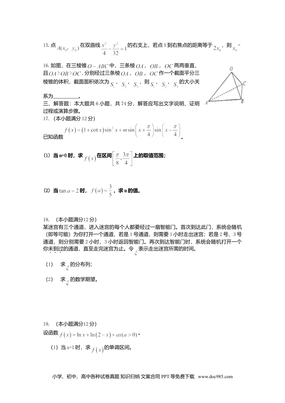 2010年江西高考理科数学真题Ⅰ第卷一、选择题:本大题共12小题,每个小题5分,共60分。在每个小题给出的四个选项中,有一项是符合题目要求的。1.已知(x+i)(1-i)=y,则实数x,y分别为()A.x=-1,y=1B.x=-1,y=2C.x=1,y=1D.x=1,y=22.若集合,,则=()A.B.C.D.3.不等式的解集是()A.B.C.D.4.()A.B.C.2D.不存在5.等比数列中,,=4,函数,则()A.B.C.D.6.展开式中不含项的系数的和为()A.-1B.0C.1D.27.E,F是等腰直角△ABC斜边AB上的三等分点,则()A.B.C.D.8.直线与圆相交于M,N两点,若,则k的取值范围是小学、初中、高中各种试卷真题知识归纳文案合同PPT等免费下载www.doc985.comA.B.C.D.9.给出下列三个命题:①函数与是同一函数;②若函数与的图像关于直线对称,则函数与的图像也关于直线对称;③若奇函数对定义域内任意x都有,则为周期函数。其中真命题是A.①②B.①③C.②③D.②10.过正方体的顶点A作直线L,使L与棱,,所成的角都相等,这样的直线L可以作A.1条B.2条C.3条D.4条11.一位国王的铸币大臣在每箱100枚的硬币中各掺入了一枚劣币,国王怀疑大臣作弊,他用两种方法来检测。方法一:在10箱子中各任意抽查一枚;方法二:在5箱中各任意抽查两枚。国王用方法一、二能发现至少一枚劣币的概率分别为和,则A.=B.<C.>D。以上三种情况都有可能12.如图,一个正五角星薄片(其对称轴与水面垂直)匀速地升出水面,记t时刻五角星露出水面部分的图形面积为,则导函数的图像大致为二、填空题:本大题共4小题,每小题4分,共16分。请把答案填在答题卡上。13.已知向量,满足,,与的夹角为60°,则14.将6位志愿者分成4组,其中两个各2人,另两个组各1人,分赴世博会的四个不同场馆服务,不同的分配方案有种(用数字作答)。小学、初中、高中各种试卷真题知识归纳文案合同PPT等免费下载www.doc985.com15.点在双曲线的右支上,若点A到右焦点的距离等于,则=16.如图,在三棱锥中,三条棱,,两两垂直,且>>,分别经过三条棱,,作一个截面平分三棱锥的体积,截面面积依次为,,,则,,的大小关系为。三、解答题:本大题共6小题,共74分,解答应写出文字说明、证明过程或演算步骤。17.(本小题满分12分)已知函数。(1)当m=0时,求在区间上的取值范围;(2)当时,,求m的值。18.(本小题满分12分)某迷宫有三个通道,进入迷宫的每个人都要经过一扇智能门。首次到达此门,系统会随机(即等可能)为你打开一个通道,若是1号通道,则需要1小时走出迷宫;若是2号、3号通道,则分别需要2小时、3小时返回智能门。再次到达智能门时,系统会随机打开一个你未到过的通道,直至走完迷宫为止。令表示走出迷宫所需的时间。(1)求的分布列;(2)求的数学期望。19.(本小题满分12分)设函数。(1)当a=1时,求的单调区间。小学、初中、高中各种试卷真题知识归纳文案合同PPT等免费下载www.doc985.com(2)若在上的最大值为,求a的值。20.(本小题满分12分)如图△BCD与△MCD都是边长为2的正三角形,平面MCD平面BCD,AB平面BCD,。(1)求点A到平面MBC的距离;(2)求平面ACM与平面BCD所成二面角的正弦值。21.(本小题满分12分)设椭圆,抛物线。(1)若经过的两个焦点,求的离心率;(2)设A(0,b),,又M、N为与不在y轴上的两个交点,若△AMN的垂心为,且△QMN的重心在上,求椭圆和抛物线的方程。22.(本小题满分14分)证明以下命题:(1)对任一正整a,都存在整数b,c(b<c),使得成等差数列。(2)存在无穷多个互不相似的三角形△,其边长为正整数且成等差数列。小学、初中、高中各种试卷真题知识归纳文案合同PPT等免费下载www.doc985.com