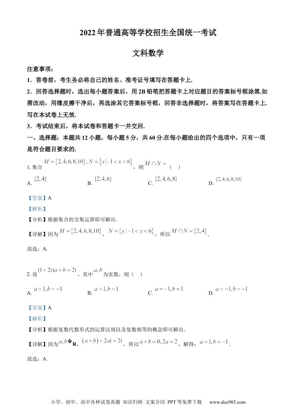 小学、初中、高中各种试卷真题知识归纳文案合同PPT等免费下载www.doc985.com2022年普通高等学校招生全国统一考试文科数学注意事项:1.答卷前,考生务必将自己的姓名、准考证号填写在答题卡上.2.回答选择题时,选出每小题答案后,用2B铅笔把答题卡上对应题目的答案标号框涂黑.如需改动,用橡皮擦干净后,再选涂其它答案标号框,回答非选择题时,将答案写在答题卡上.写在本试卷上无效.3.考试结束后,将本试卷和答题卡一并交回.一、选择题:本题共12小题,每小题5分,共60分.在每小题给出的四个选项中,只有一项是符合题目要求的.1.集合,则()A.B.C.D.【答案】A【解析】【分析】根据集合的交集运算即可解出.【详解】因为,,所以.故选:A.2.设,其中为实数,则()A.B.C.D.【答案】A【解析】【分析】根据复数代数形式的运算法则以及复数相等的概念即可解出.【详解】因为R,,所以,解得:.故选:A.小学、初中、高中各种试卷真题知识归纳文案合同PPT等免费下载www.doc985.com3.已知向量,则()A.2B.3C.4D.5【答案】D【解析】【分析】先求得,然后求得.【详解】因为,所以.故选:D4.分别统计了甲、乙两位同学16周的各周课外体育运动时长(单位:h),得如下茎叶图:则下列结论中错误的是()A.甲同学周课外体育运动时长的样本中位数为7.4B.乙同学周课外体育运动时长的样本平均数大于8C.甲同学周课外体育运动时长大于8的概率的估计值大于0.4D.乙同学周课外体育运动时长大于8的概率的估计值大于0.6【答案】C【解析】【分析】结合茎叶图、中位数、平均数、古典概型等知识确定正确答案.【详解】对于A选项,甲同学周课外体育运动时长的样本中位数为,A选项结论正确.对于B选项,乙同学课外体育运动时长的样本平均数为:,小学、初中、高中各种试卷真题知识归纳文案合同PPT等免费下载www.doc985.comB选项结论正确.对于C选项,甲同学周课外体育运动时长大于的概率的估计值,C选项结论错误.对于D选项,乙同学周课外体育运动时长大于的概率的估计值,D选项结论正确.故选:C5.若x,y满足约束条件则的最大值是()A.B.4C.8D.12【答案】C【解析】【分析】作出可行域,数形结合即可得解.【详解】由题意作出可行域,如图阴影部分所示,转化目标函数为,上下平移直线,可得当直线过点时,直线截距最小,z最大,小学、初中、高中各种试卷真题知识归纳文案合同PPT等免费下载www.doc985.com所以.故选:C.6.设F为抛物线的焦点,点A在C上,点,若,则()A.2B.C.3D.【答案】B【解析】【分析】根据抛物线上的点到焦点和准线的距离相等,从而求得点的横坐标,进而求得点坐标,即可得到答案.【详解】由题意得,,则,即点到准线的距离为2,所以点的横坐标为,不妨设点在轴上方,代入得,,所以.故选:B7.执行下边的程序框图,输出的()小学、初中、高中各种试卷真题知识归纳文案合同PPT等免费下载www.doc985.comA.3B.4C.5D.6【答案】B【解析】【分析】根据框图循环计算即可.【详解】执行第一次循环,,,;执行第二次循环,,,;执行第三次循环,,,,此时输出.故选:B小学、初中、高中各种试卷真题知识归纳文案合同PPT等免费下载www.doc985.com8.如图是下列四个函数中的某个函数在区间的大致图像,则该函数是()A.B.C.D.【答案】A【解析】【分析】由函数图像的特征结合函数的性质逐项排除即可得解.【详解】设,则,故排除B;设,当时,,所以,故排除C;设,则,故排除D.故选:A.9.在正方体中,E,F分别为的中点,则()A.平面平面B.平面平面C.平面平面D.平面平面小学、初中、高中各种试卷真题知识归纳文案合同PPT等免费下载www.doc985.com【答案】A【解析】【分析】证明平面,即可判断A;如图,以点为原点,建立空间直角坐标系,设,分别求出平面,,的法向量,根据法向量的位置关系,即可判断BCD.【详解】解:在正方体中,且平面,又平面,所以,因为分别为的中点,所以,所以,又,所以平面,又平面,所以平面平面,故A正确;选项BCD解法一:如图,以点为原点,建立空间直角坐标系,设,则,,则,,设平面的法向量为,小学、初中、高中各种试卷真题知识归纳文案合同PPT等免费下载www.doc985.com...