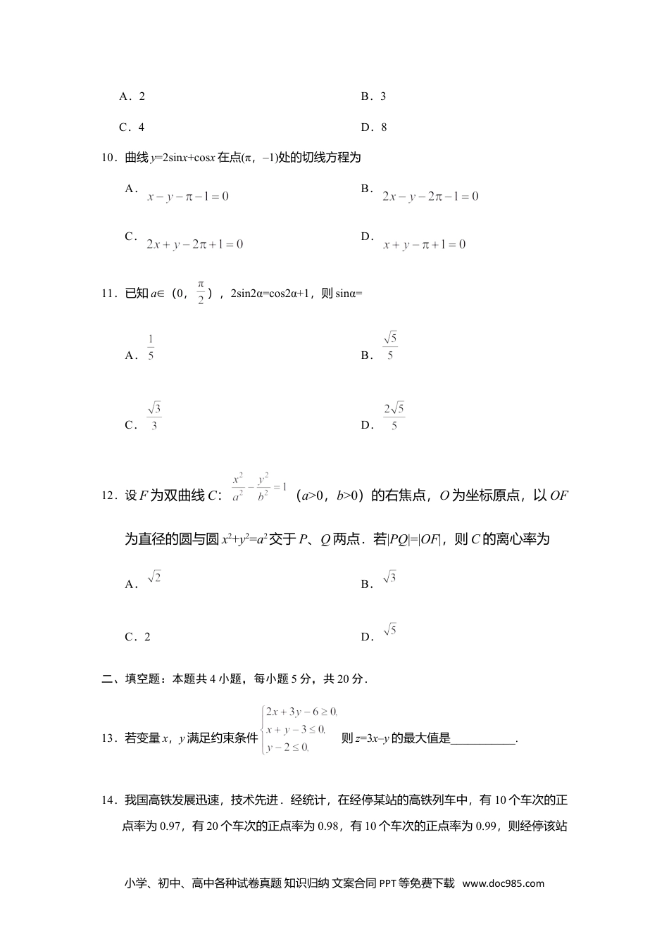 绝密★启用前2019Ⅱ年全国统一高考数学试卷(文科)(新课标)一、选择题:本题共12小题,每小题5分,共60分.在每小题给出的四个选项中,只有一项是符合题目要求的.1.已知集合,,则A∩B=A.(–1,+∞)B.(–∞,2)C.(–1,2)D.2.设z=i(2+i),则=A.1+2iB–.1+2iC.1–2iD–.1–2i3.已知向量a=(2,3),b=(3,2),则|a–b|=A.B.2C.5D.504.生物实验室有5只兔子,其中只有3只测量过某项指标,若从这5只兔子中随机取出3只,则恰有2只测量过该指标的概率为A.B.C.D.5“”.在一带一路知识测验后,甲、乙、丙三人对成绩进行预测.小学、初中、高中各种试卷真题知识归纳文案合同PPT等免费下载www.doc985.com甲:我的成绩比乙高.乙:丙的成绩比我和甲的都高.丙:我的成绩比乙高.成绩公布后,三人成绩互不相同且只有一个人预测正确,那么三人按成绩由高到低的次序为A.甲、乙、丙B.乙、甲、丙C.丙、乙、甲D.甲、丙、乙6.设f(x)为奇函数,且当x≥0时,f(x)=,则当x<0时,f(x)=A.B.C.D.7.设α,β为两个平面,则α∥β的充要条件是A.α内有无数条直线与β平行B.α内有两条相交直线与β平行C.α,β平行于同一条直线D.α,β垂直于同一平面8.若x1=,x2=是函数f(x)=(>0)两个相邻的极值点,则=A.2B.C.1D.9.若抛物线y2=2px(p>0)的焦点是椭圆的一个焦点,则p=小学、初中、高中各种试卷真题知识归纳文案合同PPT等免费下载www.doc985.comA.2B.3C.4D.810.曲线y=2sinx+cosx在点(π–,1)处的切线方程为A.B.C.D.11.已知a∈(0,),2sin2α=cos2α+1,则sinα=A.B.C.D.12.设F为双曲线C:(a>0,b>0)的右焦点,O为坐标原点,以OF为直径的圆与圆x2+y2=a2交于P、Q两点.若|PQ|=|OF|,则C的离心率为A.B.C.2D.二、填空题:本题共4小题,每小题5分,共20分.13.若变量x,y满足约束条件则z=3x–y的最大值是___________.14.我国高铁发展迅速,技术先进.经统计,在经停某站的高铁列车中,有10个车次的正点率为0.97,有20个车次的正点率为0.98,有10个车次的正点率为0.99,则经停该站小学、初中、高中各种试卷真题知识归纳文案合同PPT等免费下载www.doc985.com高铁列车所有车次的平均正点率的估计值为___________.15.的内角A,B,C的对边分别为a,b,c.已知bsinA+acosB=0,则B=___________.16.中国有悠久的金石文化,印信是金石文化的代表之一.印信的形状多为长方体、正方“”体或圆柱体,但南北朝时期的官员独孤信的印信形状是半正多面体(图1).半正多面体是由两种或两种以上的正多边形围成的多面体.半正多面体体现了数学的对称美.图2是一个棱数为48的半正多面体,它的所有顶点都在同一个正方体的表面上,且此正方体的棱长为1.则该半正多面体共有________个面,其棱长为_________.(本题第一空2分,第二空3分.)三、解答题:共70分。解答应写出文字说明、证明过程或演算步骤。第17~21题为必考题,每个试题考生都必须作答.第22、23题为选考题,考生根据要求作答.(一)必考题:共60分。17.(12分)如图,长方体ABCD–A1B1C1D1的底面ABCD是正方形,点E在棱AA1上,BE⊥EC1.小学、初中、高中各种试卷真题知识归纳文案合同PPT等免费下载www.doc985.com(1)证明:BE⊥平面EB1C1;(2)若AE=A1E,AB=3,求四棱锥的体积.18.(12分)已知是各项均为正数的等比数列,.(1)求的通项公式;(2)设,求数列的前n项和.19.(12分)某行业主管部门为了解本行业中小企业的生产情况,随机调查了100个企业,得到这些企业第一季度相对于前一年第一季度产值增长率y的频数分布表.的分组企业数22453147(1)分别估计这类企业中产值增长率不低于40%的企业比例、产值负增长的企业比例;(2)求这类企业产值增长率的平均数与标准差的估计值(同一组中的数据用该组区间的中点值为代表).(精确到0.01)附:.20.(12分)已知是椭圆的两个焦点,P为C上一点,O为坐标原点.小学、初中、高中各种试卷真题知识归纳文案合同PPT等免费下载www.doc985.com(1)若为等边三角形,求C的离心率;(2)如果存在点P,使得,且的面积等于16,求b的值和a的取值范围.21.(12...