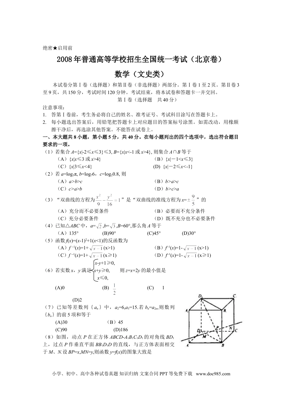 绝密★启用前2008年普通高等学校招生全国统一考试(北京卷)数学(文史类)本试卷分第Ⅰ卷(选择题)和第Ⅱ卷(非选择题)两部分。第Ⅰ卷1至2页。第Ⅱ卷3至9页,共150分,考试时间120分钟。考试结束,将本试卷和答题卡一并交回。第Ⅰ卷(选择题共40分)注意事项:1.答第Ⅰ卷前,考生务必将自己的姓名、准考证号、考试科目涂写在答题卡上。2.每小题选出答案后,用铅笔把答题卡上对应题目的答案标号涂黑。如需改动,用橡颇擦干净后,再选涂其他答案。不能答在试卷上。一、本大题共8小题,第小题5分,共40分。在每小题列出的四个选项中,选出符合题目要求的一项。(1)若集合A={x|-2≤x≤3}≤3,B={x|x<-1或x>4},则集合A∩B等于(A){x|x≤3或x>4}(B){x|-1<x≤3}(C){x|3≤x<4}(D){x|-2≤x<-1}(2)若a=log3π,b=log76,c=log20.8,则(A)a>b>c(B)b>a>c(C)c>a>b(D)b>c>a(3)“双曲线的方程为”是“双曲线的准线方程为x=”的(A)充分而不必要条件(B)必要而不充分条件(C)充分必要条件(D)既不充分也不必要条件(4)已知△ABC中,a=,b=,B=60°,那么角A等于(A)135°(B)90°(C)45°(D)30°(5)函数f(x)=(x-1)2+1(x<1)的反函数为(A)f--1(x)=1+(x>1)(B)f--1(x)=1-(x>1)(C)f--1(x)=1+(x≥1)(D)f--1(x)=1-(x≥1)x-y+1≥0,(6)若实数x,y满足x+y≥0,则z=x+2y的最小值是x≤0,(A)0(B)(C)1(D)2(7)已知等差数列{an}中,a2=6,a5=15.若bn=a2n,则数列{bn}的前5项和等于(A)30(B)45(C)90(D)186(8)如图,动点P在正方体ABCD-A1B1C1D1的对角线BD1上,过点P作垂直平面BB1D1D的直线,与正方体表面相交于M、N.设BP=x,MN=y,则函数y=f(x)的图象大致是小学、初中、高中各种试卷真题知识归纳文案合同PPT等免费下载www.doc985.com绝密★使用完毕前2008年普通高等学校校招生全国统一考试数学(文史类)(北京卷)第Ⅱ卷(共110分)注意事项:1.用钢笔或圆珠笔将答案直接写在试卷上。2.答卷前将密封线内的项目填写清楚。题号二三总分151617181920分数二、填空题:本大题共6小题,每小题5分,共30分。把答案填在题中横线上。(9)若角a的终边经过点P(1,-2),则tan2a的值为.(10)不等式的解集是.(11)已知向量a与b的夹角为120°,且|a|=|b|=4,那么a·b的值为.(12)若展开式中常数项为;各项系数之和为.(用数字作答)(13)如图,函数f(x)的图象是折线段ABC,其中A,B,C的坐标分别为(0,4),(2,0),(6,4),则f(f(0))=;函数f(x)在x=1处的导数f′(1)=.(14)已知函数f(x)=x2-cosx,对于[-]上的任意x1,x2,有如下条件:①x1>x2;②x21>x22;③|x1|>x2.其中能使f(x1)>f(x2)恒成立的条件序号是.三、解答题:本大题共6小题,共80分。解答应写出文字说明。演算步骤或证明过程。(15)(本小题共13分)小学、初中、高中各种试卷真题知识归纳文案合同PPT等免费下载www.doc985.com已知函数的最小正周期为π.(Ⅰ)求ω的值;(Ⅱ)求函数f(x)在区间[0,]上的取值范围.(16)(本小题共14分)如图,在三棱锥P-ABC中,AC=BC=2,∠ACB=90°,AP=BP=AB,PC⊥AC.(Ⅰ)求证:PC⊥AB;(Ⅱ)求二面角B-AP-C的大小.(17)(本小题共13分)已知函数是奇函数.(Ⅰ)求a,c的值;(Ⅱ)求函数f(x)的单调区间.(18)(本小题共13分)甲、乙等五名奥运志愿者被随机地分到A,B,C,D四个不同的岗位服务,每个岗位至少有一名志愿者.(Ⅰ)求甲、乙两人同时参加A岗位服务的概率;(Ⅱ)求甲、乙两人不在同一个岗位服务的概率。小学、初中、高中各种试卷真题知识归纳文案合同PPT等免费下载www.doc985.com(19)(本小题共14分)已知△ABC的顶点A,B在椭圆上,C在直线l:y=x+2上,且AB∥l.(Ⅰ)当AB边通过坐标原点O时,求AB的长及△ABC的面积;(Ⅱ)当∠ABC=90°,且斜边AC的长最大时,求AB所在直线的方程.(20)(本小题共13分)数列{an}满足(Ⅰ)当a2=-1时,求λ及a3的值;(Ⅱ)数列{an}是否可能为等差数列?若可能,求出它的通项公式;若不可能,说明理由;(Ⅲ)求λ的取值范围,使得存在正整数m,当n>m时总有an<0.小学、初中、高中各种试卷真题知识归纳文案合同PPT等免费下载www.doc985.com绝密★考试...