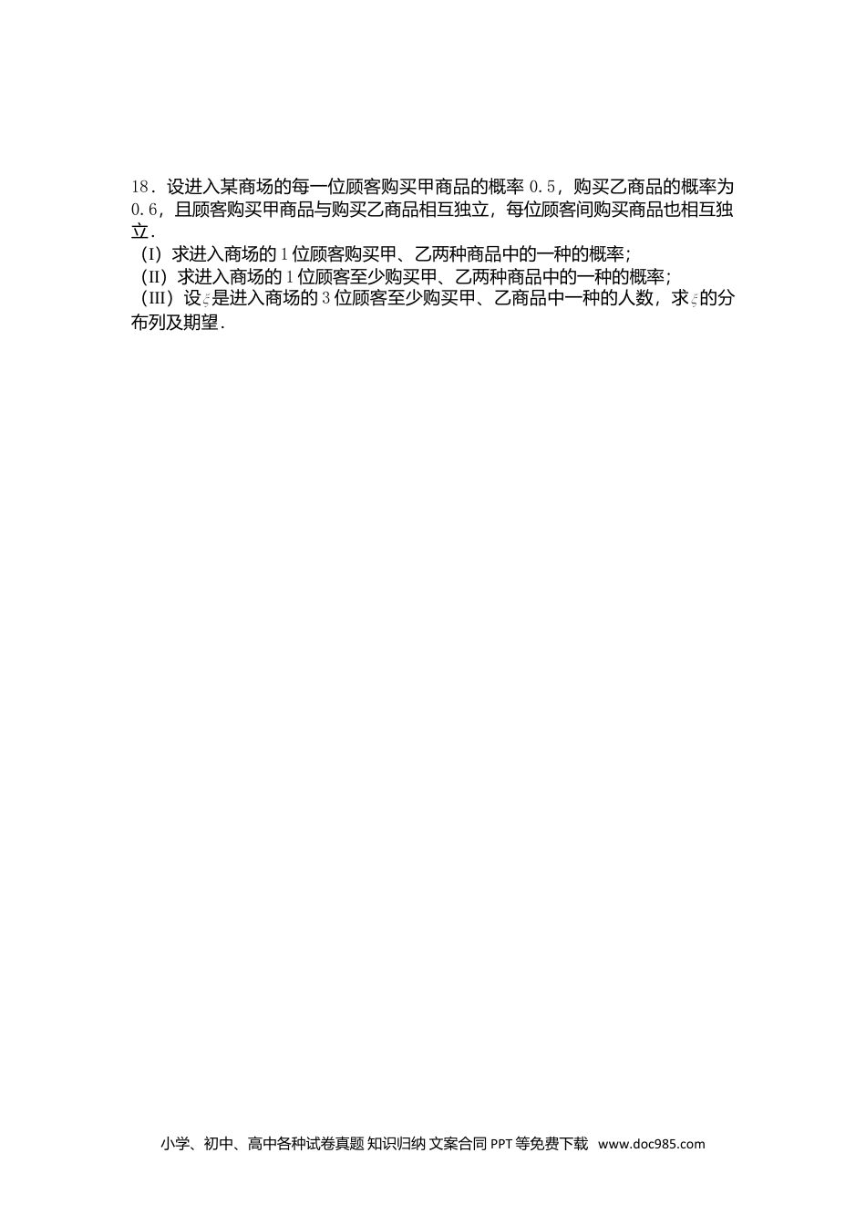 2008年普通高等学校招生全国统一考试(四川卷)理科数学(非延考卷)说明:2008年是四川省高考自主命题的第三年,因突遭特大地震灾害,四川六市州40县延考,本卷为非延考卷.一、选择题:()1.若集合,,,则()A.B.C.D.2.复数()A.4B.4C.4D.43.()A.B.C.D.4.直线绕原点逆时针旋转,再向右平移1个单位后所得的直线为()A.B.C.D.5.若,,则的取值范围是()A.B.C.D.6.从包括甲、乙共10人中选4人去参加公益活动,要求甲、乙至少有1人参加,则不同的选法有()A.70B.112C.140D.1687.已知等比数列中,,则该数列前三项和的取值范围是()A.B.C.D.8.设、是球的半径上的两点,且,分别过、、作垂直于的面截球得三个圆,则这三个圆的面积之比为()A.3:5:6B.3:6:8C.5:7:9D.5:8:99.设直线平面,过平面外一点且与、都成角的直线有且只有()A.1条B.2条C.3条D.4条10.设,其中,则函数是偶函数的充分必要条件是小学、初中、高中各种试卷真题知识归纳文案合同PPT等免费下载www.doc985.com()A.B.C.D.11.定义在上的函数满足:,,则()A.B.C.D.12.设抛物线的焦点为,准线与轴相交于点,点在上且,则的面积为()A.4B.8C.16D.32二、填空题:()13.的展开式中项的系数是14.已知直线,圆,则圆上各点到直线的距离的最小值是15.已知正四棱柱的一条对角线长为,且与底面所成的角的余弦值为,则该正四棱柱的体积是.16.设等差数列的前项和为,,,则的最大值是.三、解答题:()解答应写出文字说明,证明过程或演算步骤.17.求函数的最大值和最小值.小学、初中、高中各种试卷真题知识归纳文案合同PPT等免费下载www.doc985.com18.设进入某商场的每一位顾客购买甲商品的概率0.5,购买乙商品的概率为0.6,且顾客购买甲商品与购买乙商品相互独立,每位顾客间购买商品也相互独立.Ⅰ()求进入商场的1位顾客购买甲、乙两种商品中的一种的概率;Ⅱ()求进入商场的1位顾客至少购买甲、乙两种商品中的一种的概率;Ⅲ()设是进入商场的3位顾客至少购买甲、乙商品中一种的人数,求的分布列及期望.小学、初中、高中各种试卷真题知识归纳文案合同PPT等免费下载www.doc985.com19.如图,面面,四边形与都是直角梯形,,,.Ⅰ()求证:、、、四点共面;Ⅱ()若,求二面角的大小.小学、初中、高中各种试卷真题知识归纳文案合同PPT等免费下载www.doc985.comBACDEF20.设数列满足:.Ⅰ()当时,求证:是等比数列;Ⅱ()求通项公式.小学、初中、高中各种试卷真题知识归纳文案合同PPT等免费下载www.doc985.com21.设椭圆的左、右焦点分别是、,离心率,右准线上的两动点、,且.Ⅰ()若,求、的值;Ⅱ()当最小时,求证与共线.小学、初中、高中各种试卷真题知识归纳文案合同PPT等免费下载www.doc985.comNMOx1F2F22.已知是函数的一个极值点.(Ⅰ)求的值;(Ⅱ)求函数的单调区间;(Ⅲ)当直线与函数的图像有3个交点,求的取值范围.小学、初中、高中各种试卷真题知识归纳文案合同PPT等免费下载www.doc985.com