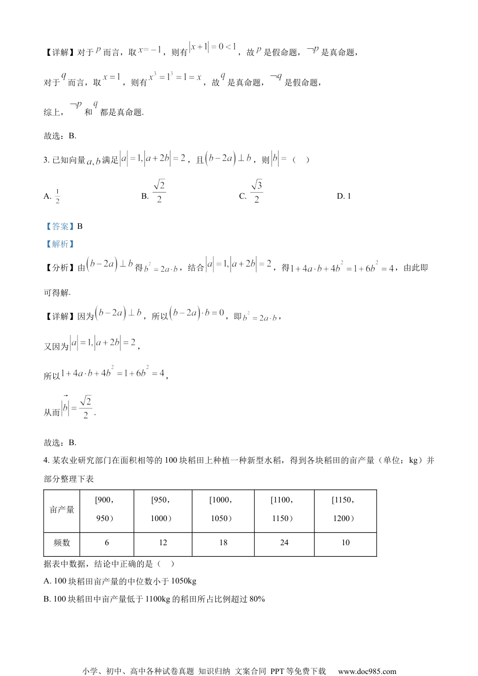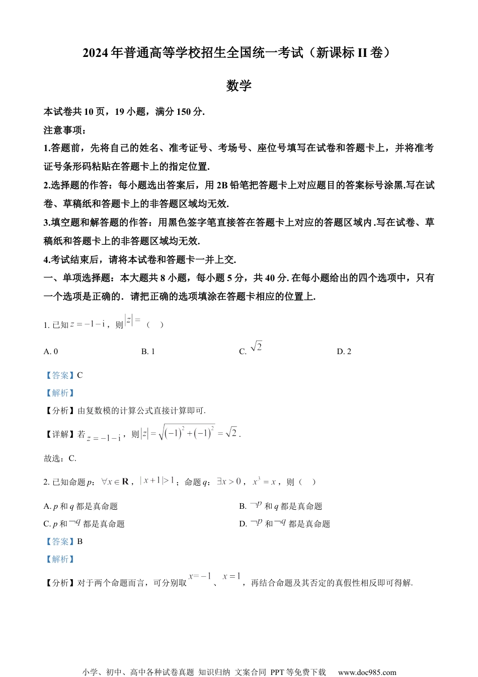 小学、初中、高中各种试卷真题知识归纳文案合同PPT等免费下载www.doc985.com2024年普通高等学校招生全国统一考试(新课标II卷)数学本试卷共10页,19小题,满分150分.注意事项:1.答题前,先将自己的姓名、准考证号、考场号、座位号填写在试卷和答题卡上,并将准考证号条形码粘贴在答题卡上的指定位置.2.选择题的作答:每小题选出答案后,用2B铅笔把答题卡上对应题目的答案标号涂黑.写在试卷、草稿纸和答题卡上的非答题区域均无效.3.填空题和解答题的作答:用黑色签字笔直接答在答题卡上对应的答题区域内.写在试卷、草稿纸和答题卡上的非答题区域均无效.4.考试结束后,请将本试卷和答题卡一并上交.一、单项选择题:本大题共8小题,每小题5分,共40分.在每小题给出的四个选项中,只有一个选项是正确的.请把正确的选项填涂在答题卡相应的位置上.1.已知,则()A.0B.1C.D.2【答案】C【解析】【分析】由复数模的计算公式直接计算即可.【详解】若,则.故选:C.2.已知命题p:,;命题q:,,则()A.p和q都是真命题B.和q都是真命题C.p和都是真命题D.和都是真命题【答案】B【解析】【分析】对于两个命题而言,可分别取、,再结合命题及其否定的真假性相反即可得解.小学、初中、高中各种试卷真题知识归纳文案合同PPT等免费下载www.doc985.com【详解】对于而言,取,则有,故是假命题,是真命题,对于而言,取,则有,故是真命题,是假命题,综上,和都是真命题.故选:B.3.已知向量满足,且,则()A.B.C.D.1【答案】B【解析】【分析】由得,结合,得,由此即可得解.【详解】因为,所以,即,又因为,所以,从而.故选:B.4.某农业研究部门在面积相等的100块稻田上种植一种新型水稻,得到各块稻田的亩产量(单位:kg)并部分整理下表亩产量[900,950)[950,1000)[1000,1050)[1100,1150)[1150,1200)频数612182410据表中数据,结论中正确的是()A.100块稻田亩产量的中位数小于1050kgB.100块稻田中亩产量低于1100kg的稻田所占比例超过80%小学、初中、高中各种试卷真题知识归纳文案合同PPT等免费下载www.doc985.comC.100块稻田亩产量的极差介于200kg至300kg之间D.100块稻田亩产量的平均值介于900kg至1000kg之间【答案】C【解析】【分析】计算出前三段频数即可判断A;计算出低于1100kg的频数,再计算比例即可判断B;根据极差计算方法即可判断C;根据平均值计算公式即可判断D.【详解】对于A,根据频数分布表可知,,所以亩产量的中位数不小于,故A错误;对于B,亩产量不低于的频数为,所以低于的稻田占比为,故B错误;对于C,稻田亩产量的极差最大为,最小为,故C正确;对于D,由频数分布表可得,亩产量在的频数为,所以平均值为,故D错误.故选;C.5.已知曲线C:(),从C上任意一点P向x轴作垂线段,为垂足,则线段的中点M的轨迹方程为()A.()B.()C.()D.()【答案】A【解析】小学、初中、高中各种试卷真题知识归纳文案合同PPT等免费下载www.doc985.com【分析】设点,由题意,根据中点的坐标表示可得,代入圆的方程即可求解.【详解】设点,则,因为为的中点,所以,即,又在圆上,所以,即,即点的轨迹方程为.故选:A6.设函数,,当时,曲线与恰有一个交点,则()A.B.C.1D.2【答案】D【解析】【分析】解法一:令,分析可知曲线与恰有一个交点,结合偶函数的对称性可知该交点只能在y轴上,即可得,并代入检验即可;解法二:令,可知为偶函数,根据偶函数的对称性可知的零点只能为0,即可得,并代入检验即可.【详解】解法一:令,即,可得,令,原题意等价于当时,曲线与恰有一个交点,注意到均为偶函数,可知该交点只能在y轴上,可得,即,解得,小学、初中、高中各种试卷真题知识归纳文案合同PPT等免费下载www.doc985.com若,令,可得因为,则,当且仅当时,等号成立,可得,当且仅当时,等号成立,则方程有且仅有一个实根0,即曲线与恰有一个交点,所以符合题意;综上所述:.解法二:令,原题意等价于有且仅有一个零点,因为,则为偶函数,根据偶函数的对称性可知的零点只能为0,即,解得,若,则,又因为当且仅当时,等号成立,可得,当且仅当时,等号成立,即有且仅有一个零点0,...