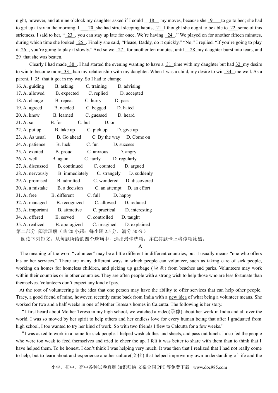 2008年高考四川卷第一卷第一部分英语知识运用(共两节,满分55分)第一节单项填空(共15小题:每小题1分,满分15分)从A、B、C、D四个选项中,选出可以填入空白处的最佳选项,并在答题卡上将该项涂黑。例:Itisgenerallyconsideredunwisetogiveachild____heorshewants.A.howeverB.whateverC.whicheverD.whenever答案是B。1.Ihaven’tseenAnnfor____longthatI’veforgottenwhatshelookslike.A.suchB.veryC.soD.too2.Youhaveto________achoice.Areyougoingtoleavethejoborstay?A.decideB.getC.doD.make3.Althoughbadlyhurtintheaccident,thedriverwas_____abletomakeaphonecall.A.stillB.evenC.alsoD.ever4.Formanycitiesintheworld,thereisnoroomtospreadoutfurther,_______NewYorkisanexample.A.forwhichB.inwhichC.ofwhichD.fromwhich5.---Let’sgoforawalkinthegarden.---_______,butIneedtodothewashing-up.A.No,thankyouB.That’srightC.GoodideaD.Notatall6.Thereweresomechairsleftover_____everyonehadsatdown.A.whenB.untilC.thatD.where7.Thetelephone_______,butbythetimeIgotindoors,itstopped.A.hadrungB.wasringingC.ringsD.hasrung8.IntheUnitedStates,thereisalways____flowofpeopletoareasof______countrywheremorejobscanbefound.A.a;theB.the;aC.the;theD.a;a9.Iusedtoquarrelalotwithmyparents,butnowwe________fine.A.lookoutB.stayupC.carryonD.getalong10.Althoughthis________soundlikeasimpletask,greatcareisneededA.mustB.mayC.shallD.should11.Themanagerbelievespriceswillnotrisebymorethan_____fourpercentA.anyotherB.theotherC.anotherD.other12.Insomeplaceswomenareexpectedtoearnmoney_______menworkathomeandraisetheirchildren.A.butB.whileC.becauseD.though13.---CanyoushowmeMr.Jaffer’soffice,please?---_____.ButIdon’tknowifheisinatthemoment.A.ThanksB.GoonC.SureD.Youarewelcome14.Wehadananxiouscoupleofweeks_____fortheresultsoftheexperiment.A.waitB.tobewaitingC.waitedD.waiting15.Acoughisusuallynothingtoworryaboutunlessitlastsfortendays___.A.ormoreB.insteadC.atmostD.only第二节完形填空(共20小题:每小题2分,满分40分)阅读下面短文,从短文后各题所给的四个选项中,选出可以填入空白处的最佳选项,并在答题卡上将该项涂黑。OnenightIdecidedtospendsometimebuildingahappierandcloserrelationshipwithmydaughter.Forseveralweeksshehadbeen16metoplaychess(棋)withher,soIsuggestedagameandsheeagerly___17__.Itwasaschool小学、初中、高中各种试卷真题知识归纳文案合同PPT等免费下载www.doc985.comnight,however,andatnineo’clockmydaughteraskedifIcould__18__mymoves,becauseshe19___togotobed;shehadtogetupatsixinthemorning.I___20shehadstrictsleepinghabits,21Ithoughtsheoughttobeableto22someofthisstrictness.Isaidtoher,“23,youcanstayuplateforonce.We’rehaving24.”Weplayedonforanotherfifteenminutes,duringwhichtimeshelooked25.Finallyshesaid,“Please,Daddy,doitquickly.”“No,”Ireplied.“Ifyou’regoingtoplayit26,you’regoingtoplayitslowly.”Andsowe27foranothertenminutes,until__28mydaughterburstintotears,and29thatshewasbeaten.ClearlyIhadmade30.Ihadstartedtheeveningwantingtohavea31timewithmydaughterbuthad32mydesiretowintobecomemore33thanmyrelationshipwithmydaughter.WhenIwasachild,mydesiretowin34mewell.Asaparent,I35thatitgotinmyway.SoIhadtochange.16.A.guidingB.askingC.trainingD.advising17.A.allowedB.expectedC.repliedD.accepted18.A.changeB.repeatC.hurryD.pass19.A.agreedB.neededC.beggedD.hated20.A.knewB.learnedC.guessedD.heard21.A.soB.forC.butD.or22.A.putupB.takeupC.pickupD.giveup23.A.AsusualB.GoaheadC.BythewayD.Comeon24.A.patienceB.luckC.funD.success25.A.excitedB.proudC.anxiousD.angry26.A.wellB.againC.fairlyD.regul...