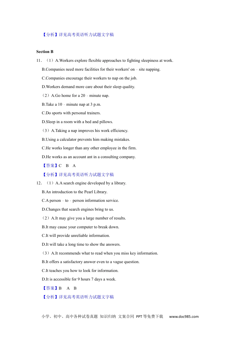 小学、初中、高中各种试卷真题知识归纳文案合同PPT等免费下载www.doc985.com2021年上海市高考英语试卷参考答案与试题解析ListeningComprehensionSectionA1.A.Sheisapolicewoman.B.Sheisashopassistant.C.Sheisateacher.D.Sheisadoctor.【答案】D【分析】详见高考英语听力试题文字稿2.A.HelivesneartheEastLake.B.Heisnotinterestedinthatschool.C.Hehasnotdecidedwhatmajortochoose.D.HewantstoapplytoEastLakeCollege.【答案】B【分析】详见高考英语听力试题文字稿3.A.Comforttheman.B.Findthemanajob.C.Keepthemancompany.D.Evaluatetheman'swork.【答案】A【分析】详见高考英语听力试题文字稿4.A.Thetitleofapainter.B.Acatalogue.C.Thehistoryofthe18thcentury.D.Aworkofart.【答案】D【分析】详见高考英语听力试题文字稿5.A.Shewillgotoworkonfoot.B.Shewillgetoffatheroffice.C.Shewilltakeanothermeansoftransport.D.Shewillwaitforthemanatthenextcrossroads.小学、初中、高中各种试卷真题知识归纳文案合同PPT等免费下载www.doc985.com【答案】C【分析】详见高考英语听力试题文字稿6.A.PrepareforthetestonChapter9.B.ReadaloudChapter9.C.ExplaintheassignmentofChapter9.D.TalkaboutChapter9.【答案】D【分析】详见高考英语听力试题文字稿7.A.Hewillcalloffthenextconference.B.Hecan'tcontactthewomanbyemail.C.Hewillhavehiscomputerfixedtomorrow.D.Hecan'tdecideonthedatefortheconference.【答案】B【分析】详见高考英语听力试题文字稿8.A.Shehasputawaytheboy'sshoes.B.Shewillwashtheboy'sshoes.C.Theboyneedn'tgotoschooltoday.D.Theboycan'tgettoschoolontime.【答案】C【分析】详见高考英语听力试题文字稿9.A.Packthefreepizzas.B.Preparelunchbyherself.C.WorkatPizzaKitchen.D.Gotoahealthclubtoloseweight.【答案】B【分析】详见高考英语听力试题文字稿10.A.Hewillgetthereservationdone.B.NotwinroomisavailableinMarch.C.Hewillcallthewomanatalatertime.D.Thewomanshouldchangeherschedule.【答案】A小学、初中、高中各种试卷真题知识归纳文案合同PPT等免费下载www.doc985.com【分析】详见高考英语听力试题文字稿SectionB11.(1)A.Workersexploreflexibleapproachestofightingsleepinessatwork.B.Companiesneedmorefacilitiesfortheirworkers'onsitenapping.﹣C.Companiesencouragetheirworkerstonaponthejob.D.Workersdemandmorecareabouttheirsleepquality.(2)A.Gohomefora20minutenap.﹣B.Takea10minutenapat3p.m.﹣C.Dosportswithpersonaltrainers.D.Sleepinaroomwithabedandpillows.(3)A.Takinganapimproveshisworkefficiency.B.Usingacalculatorpreventshimmakingmistakes.C.Heworkslongerthananyotheremployeeinthefirm.D.Heworksasanaccountantinaconsultingcompany.【答案】CBA【分析】详见高考英语听力试题文字稿12.(1)A.Asearchenginedevelopedbyalibrary.B.AnintroductiontothePearlLibrary.C.Apersontopersoninformationservice.﹣﹣D.Changesthatsearchenginesbringtous.(2)A.Itmaygiveyoualargenumberofresults.B.Itmaycauseyourcomputertobreakdown.C.Itwillprovideunreliableinformation.D.Itwilltakealongtimetoshowtheanswers.(3)A.Itrecommendswhattoreadwhenyoumisskeyinformation.B.Itoffersasatisfactoryanswereventoavaguequestion.C.Itteachesyouhowtolookforinformation.D.Itisaccessiblefor9hours7daysaweek.【答案】BAB【分析】详见高考英语听力试题文字稿小学、初中、高中各种试卷真题知识归纳文案合同PPT等免费下载www.doc985.com13.(1)A.Whatbenefitssummerjobshave.B.Howthewomancanfindasummerjob.C.Whichsummercampsuitsthewoman.D.Howtheycansucceedinaninterview.(2)A.Itwillgiveherusefulexperience.B.Itwillbeabetterpaidjob.﹣C.Itwillenablehertokeepincontactwithhim.D.Itwillsecureafulltimejobforher.﹣(3)A.Itisheldeveryweek.B.Itopensfor9hours.C.Participantsshouldn'tdr...