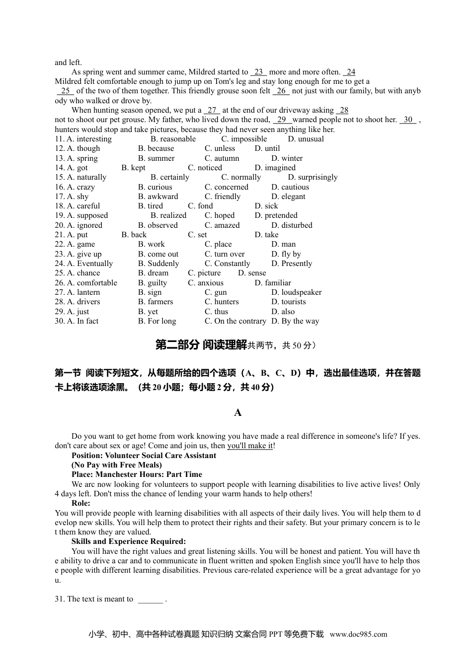 2014年四川省高考英语试题第I卷(选择题共90分)注意事项:1.必须使用2B铅笔在答题卡上将所选答案对应的标号涂黑。2.第I卷共两部分,计90分。第一部分英语知识运用第一节单项选择(共10小题;每小题1分,共10分)从A、B、C、D四个选项中国,选出可以填入空白处的最佳选项,并在答题卡上将该项涂黑。1.She'dlivedinLondonandManchester,butsheliked______andmovedtoCambridge.A.bothB.neitherC.noneD.either2.Grandmapointedtothehospitalandsaid,"That's______Iwasborn."A.whenB.howC.whyD.where3.WasitbecauseJackcamelateforschool______Mr.Smithgotangry?A.whyB.whoC.whereD.that4.Untilnow,wehaveraised50.000poundsforthepoorchildren.______isquiteunexpected.A.thatB.whichC.whoD.it5.Themanagerwassatisfiedtoseemanynewproducts______aftergreateffort.A.havingdevelopedB.todevelopC.developedD.develop6.Istillremembermyhappychildhoodwhenmymother______takemetoDisneylandatweekends.A.mightB.mustC.wouldD.should7.—Ihopetotakethecomputercourse.—Goodidea.____moreaboutit,visitthiswebsite.A.TofindoutB.FindingoutC.TobefindingoutD.Havingfoundout8.I'llbeoutforsometime.______anythingimportanthappens,callmeupimmediately.A.IncaseB.AsifC.EventhoughD.Nowthat9.She______someone,soInoddedtoherandwentaway.A.phonedB.hadphonedC.wasphoningD.hasphoned10.—Howaboutdinnertonight?It'sonme.—______.A.YouarewelcomeB.Oh,I'dliketoC.Well,I'mafraidsoD.That'sallright第二节完形填空(共20小题;每小题1.5分,共30分)阅读下面短文,从短文后各题所给的所给选项(A、B、C、D)中,选出可以填入空白处的最佳选项,并在答题卡上将该项涂黑。Myhusband,Tom,hasalwaysbeengoodwithanimals,butIwasstillamazedwhenhebefriendedafemalegrouse(松鸡).It's11foragrousetohaveanycontact(接触)withpeople.Infact,they'rehardtospot,12theyusuallyflyoffwhentheyhearhumansapproaching.Thisgrousecameintoourlivesin13.Tomwasworkingoutinthefieldwhenhe14herwalkingaroundattheedgeofthefield.Shewas15unafraidandseemedtobe16aboutwhathewasdoing.Tomsawthe17birdseveraltimes,andshegotmorecomfortablearoundhim.Wequicklygrew18ofthebirdanddecidedtocallherMildred.Oneday,asTomwasworking,Mildredcamewithinafewfeetofhimtowatch.Tom19hedidn'tseeherandkeptworkingtoseewhatshewoulddonext.Apparently,shedidn'tliketobe20.She'drunupandpeck(啄)atTom'shands,then21offtoseewhathewoulddo.Thiswentonforabout20minutes,untilMildredbecametiredofthe22小学、初中、高中各种试卷真题知识归纳文案合同PPT等免费下载www.doc985.comandleft.Asspringwentandsummercame,Mildredstartedto23moreandmoreoften.24MildredfeltcomfortableenoughtojumpuponTom'slegandstaylongenoughformetogeta25ofthetwoofthemtogether.Thisfriendlygrousesoonfelt26notjustwithourfamily,butwithanybodywhowalkedordroveby.Whenhuntingseasonopened,weputa27attheendofourdrivewayasking28nottoshootourpetgrouse.Myfather,wholiveddowntheroad,29warnedpeoplenottoshoother.30,hunterswouldstopandtakepictures,becausetheyhadneverseenanythinglikeher.11.A.interestingB.reasonableC.impossibleD.unusual12.A.thoughB.becauseC.unlessD.until13.A.springB.summerC.autumnD.winter14.A.gotB.keptC.noticedD.imagined15.A.naturallyB.certainlyC.normallyD.surprisingly16.A.crazyB.curiousC.concernedD.cautious17.A.shyB.awkwardC.friendlyD.elegant18.A.carefulB.tiredC.fondD.sick19.A.supposedB.realizedC.hopedD.pretended20.A.ignoredB.observedC.amazedD.disturbed21.A.putB.backC.setD.take22.A.gameB.workC.placeD.man23.A.giveupB.comeoutC.turnoverD.flyby24.A.EventuallyB.SuddenlyC.ConstantlyD.Presently25.A.chanceB.dreamC.pictureD.sense26.A.comfortableB....