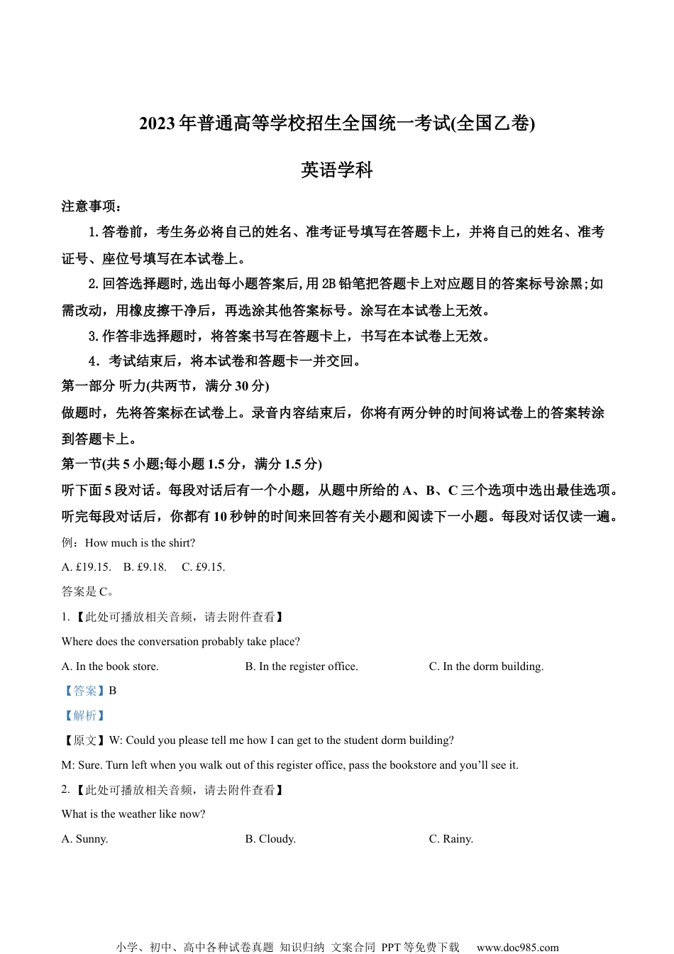小学、初中、高中各种试卷真题知识归纳文案合同PPT等免费下载www.doc985.com2023年普通高等学校招生全国统一考试(全国乙卷)英语学科注意事项:1.答卷前,考生务必将自己的姓名、准考证号填写在答题卡上,并将自己的姓名、准考证号、座位号填写在本试卷上。2.回答选择题时,选出每小题答案后,用2B铅笔把答题卡上对应题目的答案标号涂黑;如需改动,用橡皮擦干净后,再选涂其他答案标号。涂写在本试卷上无效。3.作答非选择题时,将答案书写在答题卡上,书写在本试卷上无效。4.考试结束后,将本试卷和答题卡一并交回。第一部分听力(共两节,满分30分)做题时,先将答案标在试卷上。录音内容结束后,你将有两分钟的时间将试卷上的答案转涂到答题卡上。第一节(共5小题;每小题1.5分,满分1.5分)听下面5段对话。每段对话后有一个小题,从题中所给的A、B、C三个选项中选出最佳选项。听完每段对话后,你都有10秒钟的时间来回答有关小题和阅读下一小题。每段对话仅读一遍。例:Howmuchistheshirt?A.£19.15.B.£9.18.C.£9.15.答案是C。1.【此处可播放相关音频,请去附件查看】Wheredoestheconversationprobablytakeplace?A.Inthebookstore.B.Intheregisteroffice.C.Inthedormbuilding.【答案】B【解析】【原文】W:CouldyoupleasetellmehowIcangettothestudentdormbuilding?M:Sure.Turnleftwhenyouwalkoutofthisregisteroffice,passthebookstoreandyou’llseeit.2.【此处可播放相关音频,请去附件查看】Whatistheweatherlikenow?A.Sunny.B.Cloudy.C.Rainy.小学、初中、高中各种试卷真题知识归纳文案合同PPT等免费下载www.doc985.com【答案】A【解析】【原文】M:Wecouldn’taskforabetterday,couldwe,Barbara?W:Iknow,Steve.Thereisn’tacloudinthesky.Ilovethistimeofyear.M:Me,too.Theflowersarebeautifulbutcallingforrainthough.3.【此处可播放相关音频,请去附件查看】Whatdoesthemanwanttodoontheweekend?A.Dosomegardening.B.Haveabarbecue.C.Gofishing.【答案】C【解析】【原文】M:Wegotanyplansthisweekend?W:Wemightstartwithourvegetablegarden,thenthebarbecue.M:Soundsfun,butIstillwanttogofishingwithGeorge.4.【此处可播放相关音频,请去附件查看】Whatarethespeakerstalkingabout?A.Anewoffice.B.Achangeoftheirjobs.C.Aformercolleague.【答案】C【解析】【原文】M:Lisa,IsawJackthismorning.W:Youmeantheformerdesignerofourcompany?What’shedoingthesedays?M:Hesaidhe’sgotanewjobasanartreporter.5.【此处可播放相关音频,请去附件查看】WhatdoweknowaboutAndrew?A.He’soptimistic.B.He’sactive.C.He’sshy.【答案】B【解析】【原文】W:Doyouoftengotothestudentunion,Andrew?M:Prettymuch.OnceinawhileImeetfriendsthereandIspendalotoftimeorganizingactivitiesindifferentclubsorassociations.第二节(共15小题;每小题1.5分,满分22.5分)听下面5段对话或独白。每段对话或独白后有几个小题,从题中所给的A、B、C三个选项中选出最佳选项。听每段对话或独白前,你将有时间阅读各个小题,每小题5秒钟;听完后,各小学、初中、高中各种试卷真题知识归纳文案合同PPT等免费下载www.doc985.com小题将给出5秒钟的作答时间,每段对话或独白读两遍。听下面一段较长对话,回答以下小题。【此处可播放相关音频,请去附件查看】6.Whichofthefollowingdoesthewomandislike?A.Thebedroom.B.Thesittingroom.C.Thekitchen.7.Whatdoesthewomansuggesttheydonext?A.Gotoanotheragency.B.Seesomeotherflats.C.Visittheneighbours.【答案】6.C7.B【解析】【原文】W:Whatdoyouthink,Terry?M:Well,ithasonemorebedroomthanthelastflat.Andthesittingroomisbig.W:Butthereisnotenoughcupboardspaceinthekitchen.M:It’scheaperthanthelastonewesaw.Anditisinagoodneighborhood.W:Well,maybewe’llhavetoseeiftheagenthasanythingelsetoshowus.听下面一段较长对话,回答以下小题。【此处可播放相关音频,请去附件查看】8.Whatisthemandoing?A.He’smakingaphonecall.B.He’schairingameeting.C.H...