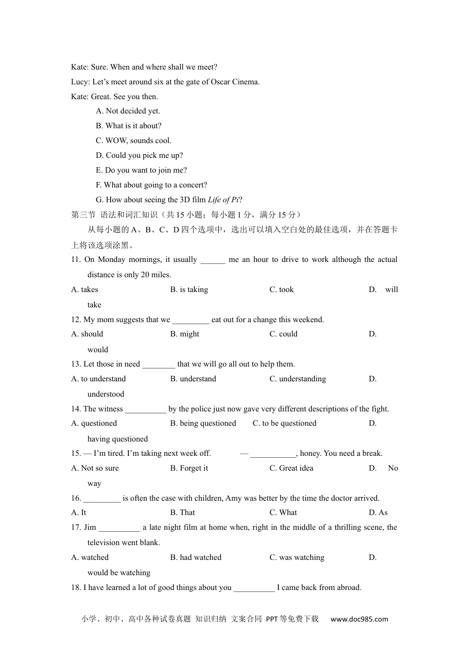 小学、初中、高中各种试卷真题知识归纳文案合同PPT等免费下载www.doc985.com2013年普通高等学校招生全国统一考试(陕西卷)英语试题第一部分:英语知识运用(共四节,满分55分)第一节语音知识(共5小题;每小题1分,满分5分)从每小题的A、B、C、D四个选项中,找出其划线部分与所给单词的划线部分读音相同的选项,并在答题卡上将该选项涂黑。1.laughA.daughterB.neighborC.enoughD.though2.citizenA.uncleB.oceanC.rescueD.percent3.completeA.sceneB.electC.studentD.respect4.alarmA.rewardB.dollarC.towardsD.farmer5.dailyA.bargainB.saidC.curtainD.explain第二节情景对话(共5小题;每小题1分,满分5分)根据对话情境和内容,从对话后所给的选项中选出能填入每一空白处的最佳选项,并在答题卡上将该选项涂黑。选项中有两个为多余选项。Lucy:Hi,Kate.Whatareyoudoingtonight?Kate:6Anysuggestions?Lucy:7I’mplanningitfordays.Kate:A3Dfilm?Whostars?Lucy:SuraiSharma,ahandsomeyoungactor.Kate:Oh!8Lucy:AnIndianboy’sunusualexperiencewithatigeratsea.Kate:9Whattimeisiton?Lucy:Halfpastsix.10小学、初中、高中各种试卷真题知识归纳文案合同PPT等免费下载www.doc985.comKate:Sure.Whenandwhereshallwemeet?Lucy:Let’smeetaroundsixatthegateofOscarCinema.Kate:Great.Seeyouthen.A.Notdecidedyet.B.Whatisitabout?C.WOW,soundscool.D.Couldyoupickmeup?E.Doyouwanttojoinme?F.Whataboutgoingtoaconcert?G.Howaboutseeingthe3DfilmLifeofPi?第三节语法和词汇知识(共15小题;每小题1分,满分15分)从每小题的A、B、C、D四个选项中,选出可以填入空白处的最佳选项,并在答题卡上将该选项涂黑。11.OnMondaymornings,itusually______meanhourtodrivetoworkalthoughtheactualdistanceisonly20miles.A.takesB.istakingC.tookD.willtake12.Mymomsuggeststhatwe_________eatoutforachangethisweekend.A.shouldB.mightC.couldD.would13.Letthoseinneed________thatwewillgoallouttohelpthem.A.tounderstandB.understandC.understandingD.understood14.Thewitness__________bythepolicejustnowgaveverydifferentdescriptionsofthefight.A.questionedB.beingquestionedC.tobequestionedD.havingquestioned15.—I’mtired.I’mtakingnextweekoff.—___________,honey.Youneedabreak.A.NotsosureB.ForgetitC.GreatideaD.Noway16._________isoftenthecasewithchildren,Amywasbetterbythetimethedoctorarrived.A.ItB.ThatC.WhatD.As17.Jim__________alatenightfilmathomewhen,rightinthemiddleofathrillingscene,thetelevisionwentblank.A.watchedB.hadwatchedC.waswatchingD.wouldbewatching18.Ihavelearnedalotofgoodthingsaboutyou__________Icamebackfromabroad.小学、初中、高中各种试卷真题知识归纳文案合同PPT等免费下载www.doc985.comA.sinceB.untilC.beforeD.when19.MarcoPoloissaidtohavesailedon_________PacificOceanonhiswaytoJavain_________thirteenthcentury.A.the;aB.a;不填C.不填;theD.the;the20.Itremainstobeseen_________thenewlyformedcommittee’spolicycanbeputintopractice.A.thatB.whichC.whatD.whether21.Thechildren__________lostinthewoods;otherwise,theywouldhavebeenatthelakesidecampasscheduled.A.musthavegotB.mustgetC.shouldhavegotD.shouldget22.AlthoughRosemaryhadsufferedfromaseriousillnessforyears,shelost_________ofherenthusiasmforlife.A.someB.neitherC.noneD.all23.—Shallwegoforadrinkatoneo’clockthisafternoon?—__________.Willtwoo’clockbeOK?A.Sure,it’suptoyouB.Sure,noproblemC.Sorry,Ican’tmakeitD.Sorry,I’mnotavailabletoday24.Themanagerwantstoseechangeinthecompany,andIamsurehewill__________.A.inparticularB.inturnC.inchargeD.intime25.Myunclehasn’tbeenabletoquitsmoking,butatleasthehas_________.A.cutoutB.cutdownC.cutupD.cutoff第四节完形填空(共20小题;每小题1.5分,满分30分)阅读下面短文...