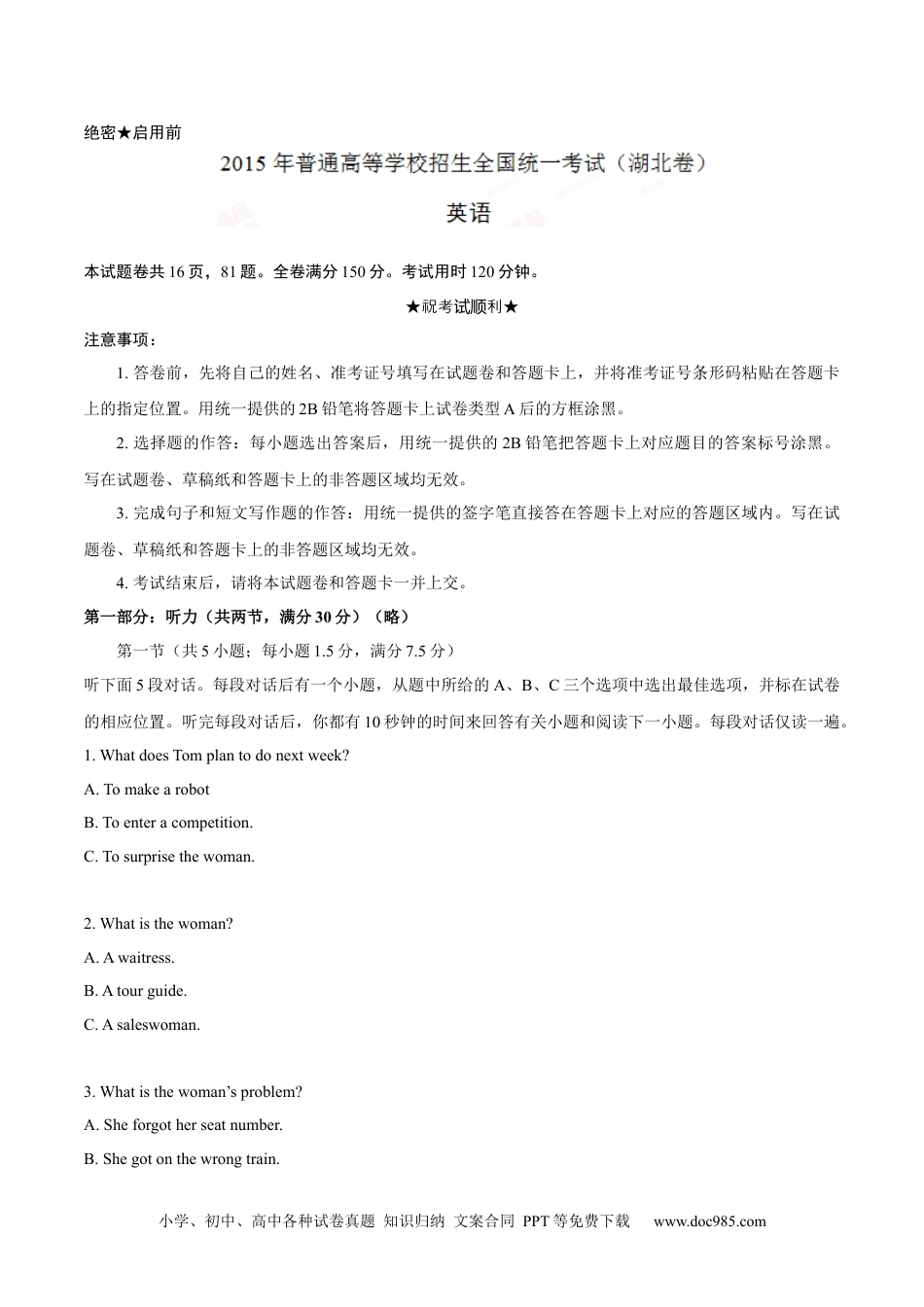 小学、初中、高中各种试卷真题知识归纳文案合同PPT等免费下载www.doc985.com绝密★启用前本试题卷共16页,81题。全卷满分150分。考试用时120分钟。★祝考利试顺★注意事项:1.答卷前,先将自己的姓名、准考证号填写在试题卷和答题卡上,并将准考证号条形码粘贴在答题卡上的指定位置。用统一提供的2B铅笔将答题卡上试卷类型A后的方框涂黑。2.选择题的作答:每小题选出答案后,用统一提供的2B铅笔把答题卡上对应题目的答案标号涂黑。写在试题卷、草稿纸和答题卡上的非答题区域均无效。3.完成句子和短文写作题的作答:用统一提供的签字笔直接答在答题卡上对应的答题区域内。写在试题卷、草稿纸和答题卡上的非答题区域均无效。4.考试结束后,请将本试题卷和答题卡一并上交。第一部分:听力(共两节,满分30分)(略)第一节(共5小题;每小题1.5分,满分7.5分)听下面5段对话。每段对话后有一个小题,从题中所给的A、B、C三个选项中选出最佳选项,并标在试卷的相应位置。听完每段对话后,你都有10秒钟的时间来回答有关小题和阅读下一小题。每段对话仅读一遍。1.WhatdoesTomplantodonextweek?A.TomakearobotB.Toenteracompetition.C.Tosurprisethewoman.2.Whatisthewoman?A.Awaitress.B.Atourguide.C.Asaleswoman.3.Whatisthewoman’sproblem?A.Sheforgotherseatnumber.B.Shegotonthewrongtrain.小学、初中、高中各种试卷真题知识归纳文案合同PPT等免费下载www.doc985.comC.Shelosthertrainticket.4.Whyhasthemanstoppedexercising?A.Heisbusymovinghouse.B.Helivesfarawayfromthegym.C.Hedislikesgoingtothegymalone.5.HowisJanetprobablyfeelingnow?A.Disappointed.B.Confused.C.Stressed.第二节(共15小题;每小题1.5分,满分22.5分)听下面5段对话或独白。每段对话或独白后有几个小题,从题中所给的A、B、C三个选项中选出最佳选项,并标在试卷的相应位置。听每段对话或独白前,你将有时间阅读各个小题,每小题5秒钟;听完后,各小题将给出5秒钟的作答时间。每段对话或独白读两遍。听第6段材料,回答第6、7题。6.Howlongisthewomangoingtostayatthehotel?A.Twonights.B.Threenights.C.Fournights.7.Whyarethepricesforthetworoomsdifferent?A.Theroomsaredifferentinsize.B.Theroomshavedifferentviews.C.Theroomsareofdifferentshapes.听第7段材料,回答第8、9题。8.Howdidthemancometotheplace?A.Bycar.B.Onfoot.C.Bytrain.9.Whyisthemanhere?小学、初中、高中各种试卷真题知识归纳文案合同PPT等免费下载www.doc985.comA.Tohaveaninterview.B.Todiscusstrafficproblems.C.Tosharehisworkexperience.听第8段材料,回答第10至12题。10.Wherearethespeakers?A.Inabank.B.Onalake.C.Atahotel.11.WhydoesDavid’sfatherwanttospendChristmasinthecountryside?A.Hecanenjoythelakeview.B.Hecanbefreedfromhousework.C.Hecanhavesomepeaceandquiet.12.WhyisDavidunhappy?A.Hecan’tattendtheparty.B.Heisn’tallowedtoskate.C.Hehastocookforhisparents.听第9段材料,回答第13至16题。13.HowdoesStevendescribehismusic?A.It’shardrock.B.It’sfolkmusic.C.It’smodernpop.14.WhydoesStevenloveAustralianaudiences?A.Theyneverthrowthingsathim.B.Theybuymoreofhisrecords.C.Theyaremorefriendly.小学、初中、高中各种试卷真题知识归纳文案合同PPT等免费下载www.doc985.com15.What’sSteven’sattitudetowardspeopledownloadinghismusic?A.Hedoesn’tmind.B.Hefeelsupset.C.Heispuzzled.16.WhatadvicedoesStevengivetosongwriters?A.Listentomoremusic.B.Sticktotheirownstyle.C.MakeuseoftheInternet.听第10段材料,回答第17至20题。17.Whichcanbestdescribeatensionheadache?A.Itoccursrepeatedly.B.Itlastsoveramonth.C.Itcausesseverepain.18.Whichisasymptomoftensionheadaches?A.Lossofconsciousness.B.Increasedbloodpressure.C.Apainatthebackofthehead.19.Whatisthecauseofreboundheadaches?A.Stressfulevents.B.Tensioninthemuscles.C.Toomuchuseofpainmedicine.20.Whyisaheada...