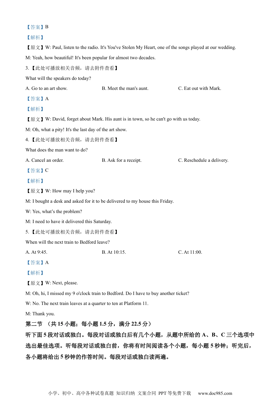 小学、初中、高中各种试卷真题知识归纳文案合同PPT等免费下载www.doc985.com2024年普通高等学校招生全国统一考试(新课标Ⅰ卷)英语姓名________________准考证号________________全卷共12页,满分150分,考试时间120分钟。考生注意:1.答题前,请务必将自己的姓名、准考证号用黑色字迹的签字笔或钢笔分别填写在试题卷和答题纸规定的位置上。2.答题时,请按照答题纸上“注意事项”的要求,在答题纸相应的位置上规范作答,在本试题卷上的作答一律无效。第一部分听力(共两节,满分30分)做题时,先将答案标在试卷上。录音内容结束后,你将有两分钟的时间将试卷上的答案转涂到答题纸上。第一节(共5小题;每小题1.5分,满分7.5分)听下面5段对话。每段对话后有一个小题,从题中所给的A、B、C三个选项中选出最佳选项。听完每段对话后,你都有10秒钟的时间来回答有关小题和阅读下一小题。每段对话仅读一遍。例:Howmuchistheshirt?A.£19.15.B.£9.18.C.£9.15.答案是C。1.【此处可播放相关音频,请去附件查看】WhatisKatedoing?A.Boardingaflight.B.Arrangingatrip.C.Seeingafriendoff.【答案】C【解析】【原文】M:Thanksforthewonderfulweekend,Kate.W:That'sokay.BobandIaregladyoucametoseeus.M:Oh,Ihavetogoin.Myflightwilltakeoffsoon.Docontactmewhenyou'reinSydney.W:Sure,wewill.2.【此处可播放相关音频,请去附件查看】Whatarethespeakerstalkingabout?A.Apopstar.B.Anoldsong.C.Aradioprogram.小学、初中、高中各种试卷真题知识归纳文案合同PPT等免费下载www.doc985.com【答案】B【解析】【原文】W:Paul,listentotheradio.It'sYou'veStolenMyHeart,oneofthesongsplayedatourwedding.M:Yeah,howbeautiful!It'sbeenpopularforalmosttwodecades.3.【此处可播放相关音频,请去附件查看】Whatwillthespeakersdotoday?A.Gotoanartshow.B.Meettheman'saunt.C.EatoutwithMark.【答案】A【解析】【原文】W:David,forgetaboutMark.Hisauntisintown,sohecan'tgowithustoday.M:Oh,whatapity!It'sthelastdayoftheartshow.4.【此处可播放相关音频,请去附件查看】Whatdoesthemanwanttodo?A.Cancelanorder.B.Askforareceipt.C.Rescheduleadelivery.【答案】C【解析】【原文】W:HowmayIhelpyou?M:IboughtadeskandaskedforittobedeliveredtomyhousethisFriday.W:Yes,what’stheproblem?M:IneedtohaveitdeliveredthisSaturday.5.【此处可播放相关音频,请去附件查看】WhenwillthenexttraintoBedfordleave?A.At9:45.B.At10:15.C.At11:00.【答案】A【解析】【原文】W:Next,please.M:Oh,hi,Imissedmy9o'clocktraintoBedford.DoIhavetobuyanotherticket?W:No.ThenexttrainleavesataquartertotenatPlatform11.M:Thankyou.第二节(共15小题;每小题1.5分,满分22.5分)听下面5段对话或独白。每段对话或独白后有几个小题,从题中所给的A、B、C三个选项中选出最佳选项。听每段对话或独白前,你将有时间阅读各个小题,每小题5秒钟;听完后,各小题将给出5秒钟的作答时间。每段对话或独白读两遍。小学、初中、高中各种试卷真题知识归纳文案合同PPT等免费下载www.doc985.com听下面一段较长对话,回答以下小题。【此处可播放相关音频,请去附件查看】6.Whatwilltheweatherbeliketoday?A.Stormy.B.Sunny.C.Foggy.7.Whatisthemangoingtodo?A.Plantatree.B.Movehiscar.C.Checkthemap.【答案】6.A7.B【解析】【原文】W:Honey,haveyoucheckedtoday'sweatherforecast?M:Yes,it'scoldandwet.Thereisawarningforstrongwindsupto100kilometersperhour.W:Whatarewegoingtodothen?M:Nothingmuch.Juststayindoors.Thereisariskoffallingtreesandpowerlines.W:Right.M:Andthelowtemperaturescouldbringsnowtotheforestarea.W:Ihopeit'soverquickly.M:Well,itwon'tgetbetteruntillateWednesday.Anyway,Ihavetomovethecarawayfromthetrees.W:Yeah,youcannotbetoocareful.听下面一段较长对话,回答以下小题。【此处可播放相关音频,请去附件查看】8.WhyisKathyinCalifornianow?A.Sheisonvacationthere.B.Shehasjustmovedthe...
