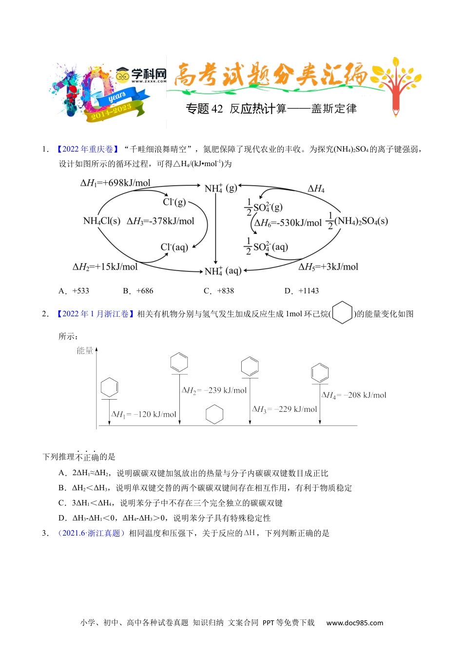 小学、初中、高中各种试卷真题知识归纳文案合同PPT等免费下载www.doc985.com1.【2022年重庆卷】“千畦细浪舞晴空”,氮肥保障了现代农业的丰收。为探究(NH4)2SO4的离子键强弱,设计如图所示的循环过程,可得△H4/(kJ•mol-1)为A.+533B.+686C.+838D.+11432.【2022年1月浙江卷】相关有机物分别与氢气发生加成反应生成1mol环己烷()的能量变化如图所示:下列推理不正确的是A.2ΔH1≈ΔH2,说明碳碳双键加氢放出的热量与分子内碳碳双键数目成正比B.ΔH2<ΔH3,说明单双键交替的两个碳碳双键间存在相互作用,有利于物质稳定C.3ΔH1<ΔH4,说明苯分子中不存在三个完全独立的碳碳双键D.ΔH3-ΔH1<0,ΔH4-ΔH3>0,说明苯分子具有特殊稳定性3.(2021.6·浙江真题)相同温度和压强下,关于反应的,下列判断正确的是专题42反算——盖斯定律应热计小学、初中、高中各种试卷真题知识归纳文案合同PPT等免费下载www.doc985.comA.B.C.D.4.(2020·北京高考真题)依据图示关系,下列说法不正确的是A.石墨燃烧是放热反应B.1molC(石墨)和1molCO分别在足量O2中燃烧,全部转化为CO2,前者放热多C.C(石墨)+CO2(g)=2CO(g)ΔH=ΔH1-ΔH2D.化学反应的ΔH,只与反应体系的始态和终态有关,与反应途径无关5.(2018·浙江高考真题)氢卤酸的能量关系如图所示下列说法正确的是A.已知HF气体溶于水放热,则HF的△H1<0B.相同条件下,HCl的△H2比HBr的小C.相同条件下,HCl的△H3+△H4比HI的大D.一定条件下,气态原子生成1molH-X键放出akJ能量,则该条件下△H2=+akJ/mol6.(2020·浙江高考真题)关于下列ΔH的判断正确的是()CO32−¿(aq)+H+¿(aq)=HCO3−¿(aq)¿¿¿ΔH1CO32-(aq)+H2O(l)⇌HCO3−¿(aq)+OH−¿(aq)¿¿ΔH2小学、初中、高中各种试卷真题知识归纳文案合同PPT等免费下载www.doc985.comOH−¿(aq)+H+¿(aq)=H2O(l)¿¿ΔH3OH−¿(aq)+CH3COOH(aq)=CH3COO−¿(aq)+H2O(l)¿¿ΔH4A.ΔH1<0ΔH2<0B.ΔH1<ΔH2C.ΔH3<0ΔH4>0D.ΔH3>ΔH47.(2015·重庆高考真题)黑火药是中国古代的四大发明之一,其爆炸的热化学方程式为:S(s)+2KNO3(s)+3C(s)=K2S(s)+N2(g)+3CO2(g)ΔH=xkJ·mol-1已知碳的燃烧热ΔH1=akJ·mol-1S(s)+2K(s)=K2S(s)ΔH2=bkJ·mol-12K(s)+N2(g)+3O2(g)=2KNO3(s)ΔH3=ckJ·mol-1则x为A.3a+b-cB.c+3a-bC.a+b-cD.c+a-b8.(2017·浙江高考真题)根据体系的能量循环图:下列说法正确的是:A.>0B.C.D.9.(2014·江苏高考真题)已知:C(s)+O2(g)=CO2(g)△H1CO2(g)+C(s)=2CO(g)△H22CO(g)+O2(g)=2CO2(g)△H34Fe(s)+3O3(g)=2Fe2O3(s)△H43CO(g)+Fe2O3(s)=3CO2(g)+2Fe(s)△H5下列关于上述反应焓变的判断正确的是A.△H1>0,△H3<0B.△H2>0,△H4>0C.△H1=△H2+△H3D.△H3=△H4+△H510.(2008·宁夏高考真题)已知H2(g)、C2H4(g)和C2H5OH(1)的燃烧热分别是-285.8kJ·mol-1、-1411.0kJ·mol-1和-1366.8kJ·mol-1,则由C2H4(g)和H2O(l)反应生成C2H5OH(l)的△H为()A.-44.2kJ·mol-1B.+44.2kJ·mlo-1C.-330kJ·mol-1D.+330kJ·mlo-111.(2013·全国高考真题)在1200℃时,天然气脱硫工艺中会发生下列反应小学、初中、高中各种试卷真题知识归纳文案合同PPT等免费下载www.doc985.com①H2S(g)+O2(g)=SO2(g)+H2O(g)△H1②2H2S(g)+SO2(g)=S2(g)+2H2O(g)△H2③H2S(g)+O2(g)=S(g)+H2O(g)△H3④2S(g)=S2(g)△H4则△H4的正确表达式为()A.△H4=2/3(△H1+△H2-3△H3)B.△H4=2/3(3△H3-△H1-△H2)C.△H4=3/2(△H1+△H2-3△H3)D.△H4=3/2(△H1-△H2-3△H3)12.(2014·全国高考真题)室温下,将1mol的CuSO4·5H2O(s)溶于水会使溶液温度降低,热效应为△H1,将1mol的CuSO4(s)溶于水会使溶液温度升高,热效应为△H2;CuSO4·5H2O受热分解的化学方程式为:CuSO4·5H2O(s)CuSO4(s)+5H2O(l),热效应为△H3。则下列判断正确的是A.△H2>△H3B.△H1<△H3C.△H1+△H3=△H2D.△H1+△H2>△H313.(2013·海南高考真题)已知下列反应的热化学方程式:6C(s)+5H2(g)+3N2(g)+9O2(g)=2C3H5(ONO2)3(...