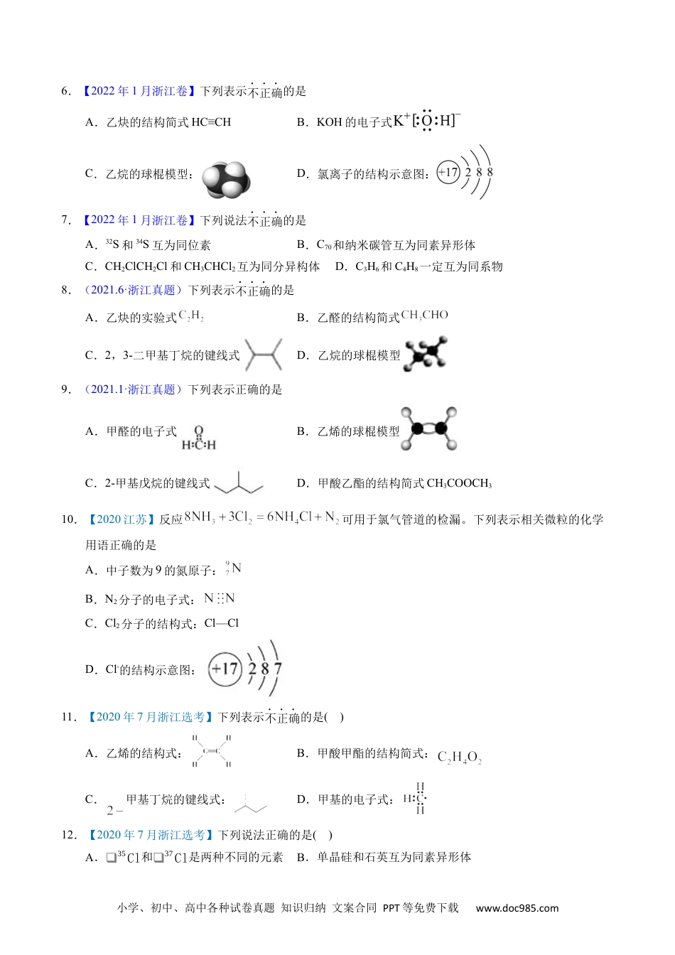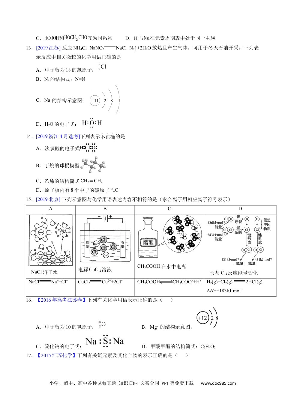 小学、初中、高中各种试卷真题知识归纳文案合同PPT等免费下载www.doc985.com1.【2023年广东卷】科教兴国,“可上九天揽月,可下五洋捉鳖”。下列说法正确的是A.“天舟六号”为中国空间站送去推进剂气,是第族元素B.火星全球影像彩图显示了火星表土颜色,表土中赤铁矿主要成分为C.创造了可控核聚变运行纪录的“人造太阳”,其原料中的与互为同位素D.“深地一号”为进军万米深度提供核心装备,制造钻头用的金刚石为金属晶体2.【2022年福建卷】福建多个科研机构经过长期联合研究发现,使用和改性的基催化剂,可打通从合成气经草酸二甲酯常压催化加氢制备乙二醇的技术难关。下列说法正确的是A.草酸属于无机物B.与石墨互为同分异构体C.属于过渡元素D.催化剂通过降低焓变加快反应速率3.【2022年天津卷】下列叙述错误的是A.是极性分子B.原子的中子数为10C.与互为同素异形体D.和互为同系物4.【2022年6月浙江卷】下列表示正确的是A.乙醛的结构简式:B.丁烯的键线式:C.的结构示意图:D.过氧化钠的电子式:5.【2022年6月浙江卷】下列说法不正确的是A.乙醇和丙三醇互为同系物B.和互为同位素C.和互为同素异形体D.丙酮()和环氧丙烷()互为同分异构体专题06化用学语小学、初中、高中各种试卷真题知识归纳文案合同PPT等免费下载www.doc985.com6.【2022年1月浙江卷】下列表示不正确的是A.乙炔的结构简式HC≡CHB.KOH的电子式C.乙烷的球棍模型:D.氯离子的结构示意图:7.【2022年1月浙江卷】下列说法不正确的是A.32S和34S互为同位素B.C70和纳米碳管互为同素异形体C.CH2ClCH2Cl和CH3CHCl2互为同分异构体D.C3H6和C4H8一定互为同系物8.(2021.6·浙江真题)下列表示不正确的是A.乙炔的实验式B.乙醛的结构简式C.2,3-二甲基丁烷的键线式D.乙烷的球棍模型9.(2021.1·浙江真题)下列表示正确的是A.甲醛的电子式B.乙烯的球棍模型C.2-甲基戊烷的键线式D.甲酸乙酯的结构简式CH3COOCH310.【2020江苏】反应可用于氯气管道的检漏。下列表示相关微粒的化学用语正确的是A.中子数为9的氮原子:B.N2分子的电子式:C.Cl2分子的结构式:Cl—ClD.Cl-的结构示意图:11.【2020年7月浙江选考】下列表示不正确的是()A.乙烯的结构式:B.甲酸甲酯的结构简式:C.甲基丁烷的键线式:D.甲基的电子式:12.【2020年7月浙江选考】下列说法正确的是()A.❑35Cl和❑37Cl是两种不同的元素B.单晶硅和石英互为同素异形体小学、初中、高中各种试卷真题知识归纳文案合同PPT等免费下载www.doc985.comC.HCOOH和HOCH2CHO互为同系物D.H与Na在元素周期表中处于同一主族13.[2019江苏]反应NH4Cl+NaNO2NaCl+N2↑+2H2O放热且产生气体,可用于冬天石油开采。下列表示反应中相关微粒的化学用语正确的是A.中子数为18的氯原子:B.N2的结构式:N=NC.Na+的结构示意图:D.H2O的电子式:14.[2019浙江4月选考]下列表示不正确的是A.次氯酸的电子式B.丁烷的球棍模型C.乙烯的结构简式CH2=CH2D.原子核内有8个中子的碳原子146C15.[2019北京]下列示意图与化学用语表述内容不相符的是(水合离子用相应离子符号表示)ABCDNaCl溶于水电解CuCl2溶液CH3COOH在水中电离H2与Cl2反应能量变化NaClNa++Cl−CuCl2Cu2++2Cl−CH3COOHCH3COO−+H+H2(g)+Cl2(g)2HCl(g)ΔH=−183kJ·mol−116.【2016年高考江苏卷】下列有关化学用语表示正确的是()A.中子数为10的氧原子:B.Mg2+的结构示意图:C.硫化钠的电子式:D.甲酸甲酯的结构简式:C2H4O217.【2015江苏化学】下列有关氯元素及其化合物的表示正确的是()小学、初中、高中各种试卷真题知识归纳文案合同PPT等免费下载www.doc985.comA.质子数为17、中子数为20的氯原子:B.氯离子(Cl-)的结构示意图:C.氯分子的电子式:D.氯乙烯分子的结构简式:H3C-CH2Cl18.【2014年高考江苏卷第2题】下列关于化学用语的表示正确的是()A.过氧化钠的电子式:B.质子数为35、中子数为45的溴原子:BrC.硫离子的结构示意图:D.间二甲苯的结构简式:19.【2013年高考海南卷第2题】下列化合物的俗称与化学式不对应的是()A.绿矾-FeSO4·7H2OB.芒硝-Na2SO4·1...