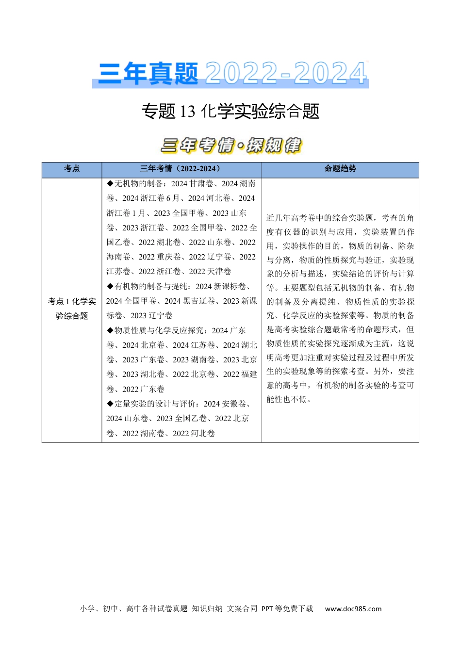 小学、初中、高中各种试卷真题知识归纳文案合同PPT等免费下载www.doc985.com专题13化合学实验综题考点三年考情(2022-2024)命题趋势考点1化学实验综合题◆无机物的制备:2024甘肃卷、2024湖南卷、2024浙江卷6月、2024河北卷、2024浙江卷1月、2023全国甲卷、2023山东卷、2023浙江卷、2022全国甲卷、2022全国乙卷、2022湖北卷、2022山东卷、2022海南卷、2022重庆卷、2022辽宁卷、2022江苏卷、2022浙江卷、2022天津卷◆有机物的制备与提纯:2024新课标卷、2024全国甲卷、2024黑吉辽卷、2023新课标卷、2023辽宁卷◆物质性质与化学反应探究:2024广东卷、2024北京卷、2024江苏卷、2024湖北卷、2023广东卷、2023湖南卷、2023北京卷、2023湖北卷、2022北京卷、2022福建卷、2022广东卷◆定量实验的设计与评价:2024安徽卷、2024山东卷、2023全国乙卷、2022北京卷、2022湖南卷、2022河北卷近几年高考卷中的综合实验题,考查的角度有仪器的识别与应用,实验装置的作用,实验操作的目的,物质的制备、除杂与分离,物质的性质探究与验证,实验现象的分析与描述,实验结论的评价与计算等。主要题型包括无机物的制备、有机物的制备及分离提纯、物质性质的实验探究、化学反应的实验探索等。物质的制备是高考实验综合题最常考的命题形式,但物质性质的实验探究逐渐成为主流,这说明高考更加注重对实验过程及过程中所发生的实验现象等的探索考查。另外,要注意的高考中,有机物的制备实验的考查可能性也不低。小学、初中、高中各种试卷真题知识归纳文案合同PPT等免费下载www.doc985.com考法01无机物的制备1.(2024·甘肃卷)某兴趣小组设计了利用和生成,再与反应制备的方案:(1)采用下图所示装置制备,仪器a的名称为_______;步骤I中采用冰水浴是为了_______;(2)步骤Ⅱ应分数次加入,原因是_______;(3)步骤Ⅲ滴加饱和溶液的目的是_______;(4)步骤Ⅳ生成沉淀,判断已沉淀完全的操作是_______;(5)将步骤Ⅴ中正确操作或现象的标号填入相应括号中_______。A.蒸发皿中出现少量晶体B.使用漏斗趁热过滤C.利用蒸发皿余热使溶液蒸干D.用玻璃棒不断搅拌E.等待蒸发皿冷却2.(2024·湖南卷)亚铜配合物广泛用作催化剂。实验室制备的反应原理如下:实验步骤如下:小学、初中、高中各种试卷真题知识归纳文案合同PPT等免费下载www.doc985.com分别称取和粉置于乙腈()中应,回流装置图和蒸馏装置图(加热、夹持等装置略)如下:已知:①乙腈是一种易挥发的强极性配位溶剂;②相关物质的信息如下:化合物相对分子质量327.5371在乙腈中颜色无色蓝色回答下列问题:(1)下列与实验有关的图标表示排风的是_______(填标号);A.B.C.D.E.(2)装置Ⅰ中仪器M的名称为_______;(3)装置Ⅰ中反应完全的现象是_______;(4)装置Ⅰ和Ⅱ中气球的作用是_______;(5)不能由步骤c直接获得,而是先蒸馏至接近饱和,再经步骤d冷却结晶获得。这样处理的目的是_______(6)为了使母液中的结晶,步骤e中向母液中加入的最佳溶剂是_______(填标号);A.水B.乙醇C.乙醚(7)合并步骤d和e所得的产物,总质量为,则总收率为_______(用百分数表示,保留一位小数)。3.(2024·浙江卷6月)某小组采用如下实验流程制备AlI3:已知:AlI3是一种无色晶体,吸湿性极强,可溶于热的正己烷,在空气中受热易被氧化。请回答:(1)如图为步骤I的实验装置图(夹持仪器和尾气处理装置已省略),图中仪器A的名称是_______,判断步骤I反应结束的实验现象是_______。小学、初中、高中各种试卷真题知识归纳文案合同PPT等免费下载www.doc985.com(2)下列做法不正确的是_______。A.步骤I中,反应物和溶剂在使用前除水B.步骤I中,若控温加热器发生故障,改用酒精灯(配石棉网)加热C.步骤Ⅲ中,在通风橱中浓缩至蒸发皿内出现晶膜D.步骤Ⅳ中,使用冷的正己烷洗涤(3)所得粗产品呈浅棕黄色,小组成员认为其中混有碘单质,请设计实验方案验证_______。(4)纯化与分析:对粗产品纯化处理后得到产品,再采用银量法测定产品中含量以确定纯度。滴定原理为:先用过量标准溶液沉淀,再以标准溶液回滴剩余的。已知:难溶电解质(黄色)(白色)(红色)溶度积常...