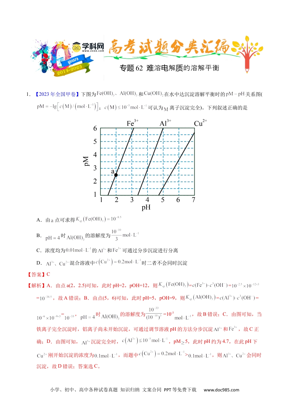 小学、初中、高中各种试卷真题知识归纳文案合同PPT等免费下载www.doc985.com1.【2023年全国甲卷】下图为和在水中达沉淀溶解平衡时的关系图(;可认为离子沉淀完全)。下列叙述正确的是A.由点可求得B.时的溶解度为C.浓度均为的和可通过分步沉淀进行分离D.混合溶液中时二者不会同时沉淀【答案】C【解析】A.由点a(2,2.5)可知,此时pH=2,pOH=12,则===,故A错误;B.由点(5,6)可知,此时pH=5,pOH=9,则===,时的溶解度为=10-3,故B错误;C.由图可知,当铁离子完全沉淀时,铝离子尚未开始沉淀,可通过调节溶液pH的方法分步沉淀和,故C正确;D.由图可知,沉淀完全时,,pM5,此时pH约为4.7,在此pH下刚开始沉淀的浓度为,而题中>,则会同时沉淀,故D错误;答案选C。专题62溶解的溶解平衡难电质小学、初中、高中各种试卷真题知识归纳文案合同PPT等免费下载www.doc985.com2.【2023年全国乙卷】一定温度下,AgCl和Ag2CrO4的沉淀溶解平衡曲线如图所示。下列说法正确的是A.a点条件下能生成Ag2CrO4沉淀,也能生成AgCl沉淀B.b点时,c(Cl-)=c(CrO),Ksp(AgCl)=Ksp(Ag2CrO4)C.Ag2CrO4+2Cl-2AgCl+CrO的平衡常数K=107.9D.向NaCl、Na2CrO4均为0.1mol·L-1的混合溶液中滴加AgNO3溶液,先产生Ag2CrO4沉淀【答案】C【解析】根据图像,由(1.7,5)可得到Ag2CrO4的溶度积Ksp(Ag2CrO4)=c2(Ag+)·c(CrO)=(1×10-5)2×1×10-1.7=10-11.7,由(4.8,5)可得到AgCl的溶度积Ksp(AgCl)=c(Ag+)·c(Cl)=1×10-5×1×10-4.8=10-9.8,据此数据计算各选项结果。A.假设a点坐标为(4,6.5),此时分别计算反应的浓度熵Q得,Q(AgCl)=10-10.5,Q(Ag2CrO4)=10-17,二者的浓度熵均小于其对应的溶度积Ksp,二者不会生成沉淀,A错误;B.Ksp为难溶物的溶度积,是一种平衡常数,平衡常数只与温度有关,与浓度无关,根据分析可知,二者的溶度积不相同,B错误;C.该反应的平衡常数表达式为K=,将表达式转化为与两种难溶物的溶度积有关的式子得K=====1×107.9,C正确;D.向NaCl、Na2CrO4均为0.1mol·L-1的混合溶液中滴加AgNO3,开始沉淀时所需要的c(Ag+)分别为10-8.8和10-5.35,说明此时沉淀Cl-需要的银离子浓度更低,在这种情况下,先沉淀的是AgCl,D错误;故答案选C。3.【2023年全国新课标卷】向饱和溶液(有足量固体)中滴加氨水,发生反应和,与的关系如下图所示(其中M代表、、或)。小学、初中、高中各种试卷真题知识归纳文案合同PPT等免费下载www.doc985.com下列说法错误的是A.曲线I可视为溶解度随浓度变化曲线B.的溶度积常数C.反应的平衡常数K的值为D.时,溶液中【答案】A【解析】氯化银饱和溶液中银离子和氯离子的浓度相等,向饱和溶液中滴加氨水,溶液中银离子浓度减小,氯离子浓度增大、一氨合银离子增大,继续滴加氨水,一氨合银离子增大的幅度小于二氨合银离子,则曲线I、Ⅱ、Ⅲ、Ⅳ分别表示二氨合银离子、一氨合银离子、银离子、氯离子与氨气浓度对数变化的曲线。A.氨的浓度较小时AgCl(s)Ag+(aq)+Cl-(aq),浓度较大时AgCl(s)+2NH3(aq)+Cl-(aq),氯化银的溶解度曲线应与氯离子的曲线吻合,应该为曲线Ⅳ,故A错误;B.由图可知,c(NH3)=10-1mol/L时,c(Cl-)=10-2.35mol/L,c(Ag+)=10-7.40mol/L,则氯化银的溶度积为10-2.35×10-7.40=10-9.75,故B正确;C.由图可知,氨分子浓度对数为-1时,溶液中二氨合银离子和一氨合银离子的浓度分别为10-2.35mol/L和10-5.16mol/L,则的平衡常数K===,故C正确;D.由分析可知,曲线I、Ⅱ、Ⅲ、Ⅳ分别表示二氨合银离子、一氨合银离子、银离子、氯离子与氨气浓度对数变化的曲线,则时,溶液中,故D正确;故选A。4.【2023年北京卷】利用平衡移动原理,分析一定温度下在不同的体系中的可能产物。已知:i.图1中曲线表示体系中各含碳粒子的物质的量分数与的关系。ii.2中曲线Ⅰ的离子浓度关系符合;曲线Ⅱ的离子浓度关系符合[注:起始,不同下由图1得到]。小学、初中、高中各种试卷真题知识归纳文案合同PPT等免费下载www.doc985.com下列说法不正确的是A.由图1,B.由图2,初始状态,无沉淀生成C.由图2,初始状态,平衡后溶液中存在D.由图1和图2,初始状态、,发生反应:【...
