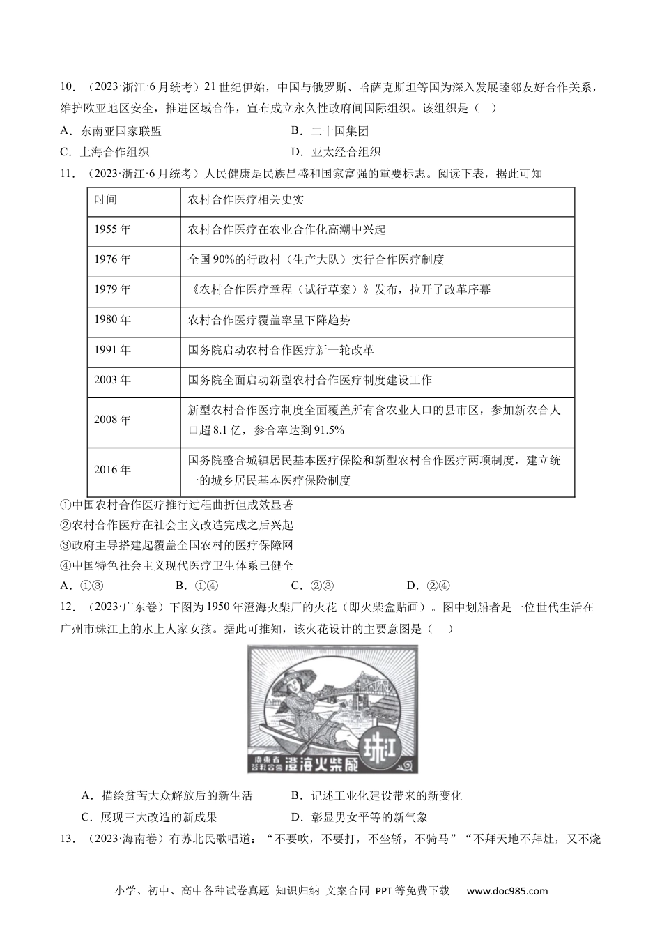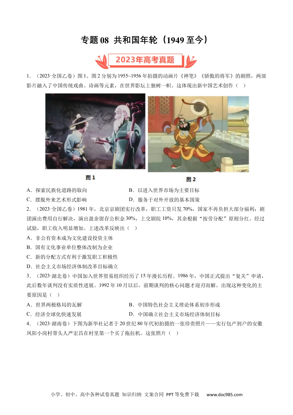 小学、初中、高中各种试卷真题知识归纳文案合同PPT等免费下载www.doc985.com专题08共和国年轮(1949至今)1.(2023·全国乙卷)图1、图2分别为1955~1956年拍摄的动画片《神笔》《骄傲的将军》的剧照,两部影片融入了中国传统戏曲、诗画等元素,在世界影坛上独树一帜。这体现出新中国艺术创作()A.探索民族化道路的取向B.以进入世界市场为主要目标C.摆脱外来艺术形式影响D.服务于对外开放的基本国策2.(2023·全国乙卷)1981年,北京京剧团实行改革,职工工资只发70%,国家不再负担大部分福利;剧团演出费用自行解决,演出盈余留存公积金30%,上交剧院10%,其余根据“按劳分配”原则分红。经过试验,职工收入明显增加。上述改革反映出()A.非公有资本成为文化建设投资主体B.国有文化事业单位整体改制为企业C.新的分配方式有利于激发职工积极性D.社会主义市场经济体制改革目标确立3.(2023·湖北卷)中国加入世界贸易组织经历了15年漫长历程。1986年,中国正式提出“复关”申请,此后数年谈判没有实质性进展。1992年10月以后,前期谈判的核心问题才迎刃而解。出现这种变化的主要原因是()A.世界两极格局的瓦解B.中国特色社会主义理论体系初步形成C.经济全球化快速发展D.中国确立社会主义市场经济体制目标4.(2023·湖南卷)下图为新华社记者于20世纪80年代初拍摄的一张珍贵照片——实行包产到户的安徽凤阳小岗村带头人严宏昌在村里第一个买了拖拉机。这张照片()小学、初中、高中各种试卷真题知识归纳文案合同PPT等免费下载www.doc985.comA.体现了土地所有制变革的成效B.反映了农业机械化的基本实现C.释放了农村政策延续性的信号D.见证了我国农村小康社会建成5.(2023·山东卷)1956年,毛泽东在谈到国家与工厂的关系时指出:“统一性和独立性是对立的统一,要有统一性,也要有独立性。……各个生产单位部要有一个与统一性相联系的独立性,才会发展得更加活泼。”毛泽东强调的是()A.适当提高工厂的生产经营自主权B.适度发挥市场的调节作用C.平衡工商企业改造中的公私关系D.鼓励个体私营经济的发展6.(2023·山东卷)新中国成立以来,中国十分重视与周边国家的交往:20世纪50年代,提出和平共处五项原则;2003年,提出“睦邻、安邻、富邻”的周边外交政策;中共十八大以来,坚持“与邻为善、以邻为伴”的外交方针,突出体现“亲、诚、惠、容”的外交理念。这主要是为了()A.消除分歧增进互信B.构建均衡发展格局C.深化合作共谋发展D.改善全球治理体系7.(2023·北京卷)1954年,政务院发布通知,要求政府机关人员“在每天上午和下午的工作时间中各抽出十分钟做工间操”。随后,国家体委也公布并推行了第一套少年广播体操和儿童广播体操,很快成为中小学生每日必做的早操和课间操。这表明()A.政府意在减少劳动和学习时间B.竞技体育精神深入社会各行业C.民众逐渐接受了休闲娱乐观念D.政府高度重视增强民众的体质8.(2023·北京卷)1998年,“广播电视村村通工程”启动。此后,“村村通”在公路、电力、饮用水、电话网、有线电视网、互联网等领域陆续展开,成为一个系统工程。这一工程()A.成为推进城乡一体化的重大举措B.标志农村经济体制改革取得突破C.为开展三线建设做好了充分准备D.为农业社会主义改造奠定了基础9.(2023·北京卷)近年来,随着信息技术不断发展,各种类型的历史资料数据库相继建立。有学者认为,“大数据使历史资料利用产生革命性变革”,历史研究进入“e-考据”时代。对此理解正确的是()①大数据的应用改变了史料运用的原则②数字化史料丰富了史学家的研究手段③历史资料数字化提高了史料利用效率④“e-考据”指历史学与考古学的结合A.①③B.②④C.①④D.②③小学、初中、高中各种试卷真题知识归纳文案合同PPT等免费下载www.doc985.com10.(2023·浙江·6月统考)21世纪伊始,中国与俄罗斯、哈萨克斯坦等国为深入发展睦邻友好合作关系,维护欧亚地区安全,推进区域合作,宣布成立永久性政府间国际组织。该组织是()A.东南亚国家联盟B.二十国集团C.上海合作组织D.亚太经合组织11.(2023·浙江·6月...