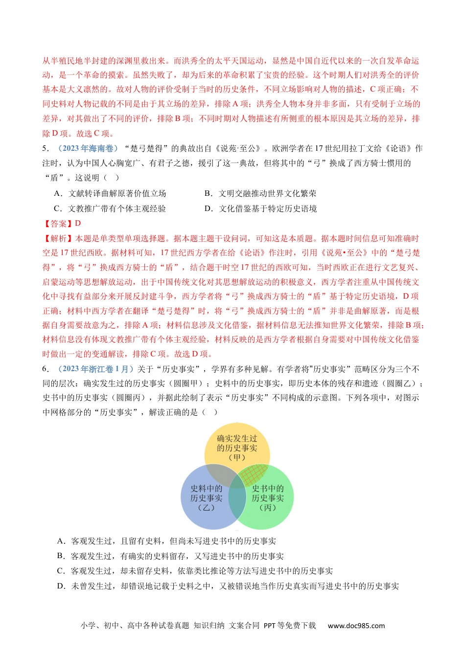小学、初中、高中各种试卷真题知识归纳文案合同PPT等免费下载www.doc985.com专题25史学研究1.(2023年新课标卷)如表关于唐人李元谅身世的三则史料中()史料内容来源本骆元光,姓安氏,其先安息人也。少为宦官骆奉先所养,冒姓骆氏……贞元三年(787)……帝(唐德宗)念其勋劳,又赐姓李氏,改名元谅。《旧唐书·李元谅传》(五代刘昫等撰)公本安姓,讳元光,其先安息王之胄也。轩辕氏廿五子在四裔者,此其一焉……(唐德宗)赐姓李氏,同属籍也。改名元谅,昭诚节也……贞元癸酉岁(793)十有一月十五日,薨于良原镇之公馆,享年六十七。《李元谅墓志》公本名元光,姓骆氏,武威姑臧人。盖黄轩帝孙,降居安息,高阳王□,留宅姑臧。贞元五年(789)《李元谅颂碑》A.《旧唐书》的记载相对客观B.所有的信息皆可互相证实C.墓志采用了《旧唐书》记载D.出现较早的史料最为真实【答案】A【解析】本题是单类型单项选择题。据本题主题干的设问词,可知这是推断题。据本题时间信息可知准确时空是:唐朝(中国)。据本题材料信息可知,李元谅原为安息人,后被唐朝统治者赐李姓,《旧唐书》属于官修正史,侧重于保存唐朝的第一手史料,记事比较详细,材料中关于唐人李元谅身世的内容属于历史叙述,相对客观,A项正确;《李元谅颂碑》中并无关于李元谅姓名由来的描述,因此“所有信息皆可互相证实”错误,排除B项;《李元谅墓志》为793年李元谅去世之后所立,属于唐朝后期,而《旧唐书》成书于五代,晚于《李元谅墓志》,因此墓志不可能采用《旧唐书》记载,排除C项;“出现较早的史料最为真实”说法过于绝对,排除D项。故选A项。2.(2023年北京卷)近年来,随着信息技术不断发展,各种类型的历史资料数据库相继建立。有学者认为,“大数据使历史资料利用产生革命性变革”,历史研究进入“e-考据”时代。对此理解正确的是()①大数据的应用改变了史料运用的原则②数字化史料丰富了史学家的研究手段③历史资料数字化提高了史料利用效率④“e-考据”指历史学与考古学的结合A.①③B.②④C.①④D.②③【答案】D【解析】本题是组合选择题。时间是当代。根据材料可知,大数据可以使历史资料共享,提高了利用率,小学、初中、高中各种试卷真题知识归纳文案合同PPT等免费下载www.doc985.com但并不是变革史料运用的原则,史料运用仍然要坚持孤证不立、无征不信、实事求是等原则,排除①;根据材料“各种类型的历史资料数据库相继建立”“大数据使历史资料利用产生革命性变革”可知,数字化史料可以通过大数据将史料分类,数字化文献检索可以使史料的搜集极其快捷而且相对完备,可以快速检索到大量资料,由此可见,历史资料数字化丰富了史学家的研究手段,提高了史料利用效率,②③正确;“e-考据”指的是充分利用电子资源进行考据的方法,是信息技术和历史考据的结合,并非是历史学与考古学的结合,排除④。综上,D项正确,排除ABC项。3.(2023年湖北卷)司马迁认为,在推翻秦王朝过程中,项羽是天下诸侯的盟主,“位虽不终,近古以来未尝有也”,故而在《史记》中将项羽列入本纪。唐代史家刘知几则指出:“霸王者,即当时诸侯。诸侯而称本纪,求名责实,再三乖谬。”两者认识不同的根源在于()A.史书编纂体例的选择B.正统观念的左右C.历史叙述原则的取向D.情感倾向的影响【答案】C【解析】本题是单类型单项选择题。据本题主题干的设问词,可知这是原因题。据本题时间信息可知准确时空是:汉代、唐代(中国)。据本题材料司马迁“在《史记》中将项羽列入本纪”,刘知幾指出“霸王者,即当时诸侯。诸侯而称本纪,求名责实,再三乖谬。”并结合所学知识可知,刘知幾是太过拘泥于名号、等级,刻板地要求必须身为天子才能立为本纪,如果身为诸侯,就绝无设为本纪之理。关键在于,他未能理解,司马迁设置本纪的主要着眼点不在身份名号,而在于以之作为一个历史时期史事之总纲领,看其是否起到支配历史大局的作用,所以两者认识不同的根源在于历史叙述原则的取向,C项正确;材料中没有涉及刘知幾对史书编纂体例的选择,排除A项;正统观念主要是指能够一脉相承,并且能够统一全国的某个政权...