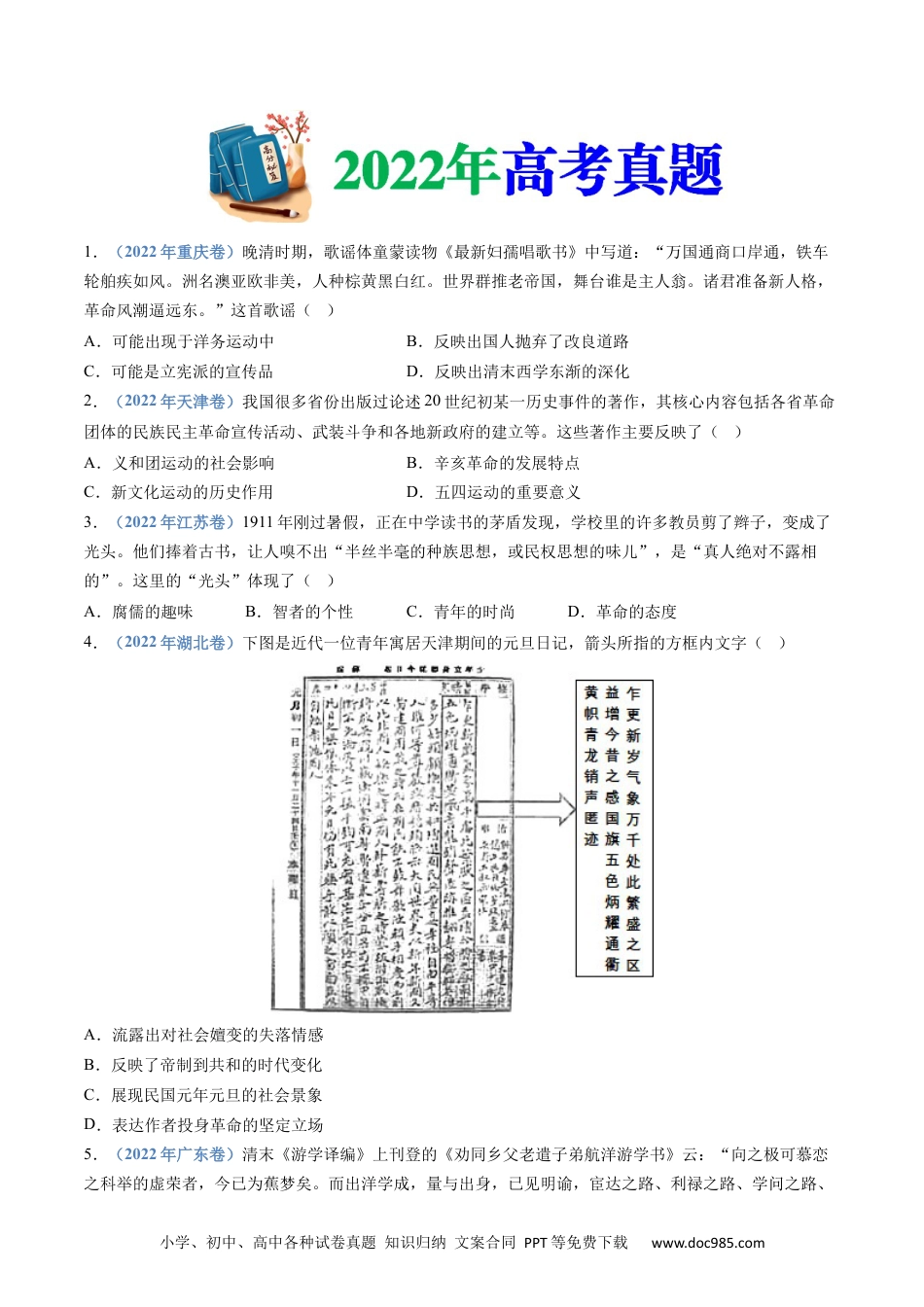小学、初中、高中各种试卷真题知识归纳文案合同PPT等免费下载www.doc985.com目录考点01辛亥革命.........................................................................................1考点02北洋军阀统治时期的政治、经济与文化...................................14(按住Ctrl,点击目录里的考点,可直接跳到对应考点)考点01辛亥革命1.(2023年全国甲卷)清末,陈去病在《论戏剧之有益》一文中说:“此其奏效之捷,必有过于劳心焦思,孜孜矻矻以作《革命军》《驳康书》《黄帝魂》《落花梦》《自由血》者殆千万倍。”他号召青年人投身戏剧。这反映出()A.传统戏曲的演出逐渐衰落B.戏剧开始由愉悦达官显贵转向民众C.戏剧成为宣传革命的手段D.反清书籍宣传革命思想的作用弱化2.(2023年新课标卷)1910年,长沙爆发抢米风潮。具有地方议会性质的湖南谘议局致电军机处,请求朝廷撤换处置失当的巡抚,谘议局议长和士绅联名致电湖广总督瑞澂。瑞澂认为该士绅等“迹近干预”,上奏朝廷:“巡抚乃系疆臣,用舍尤应钦定。”这表明()A.新政强化了清廷权威B.谘议局架空了督抚权力C.地方势力控制了官场D.士绅阶层民主意识增强3.(2023年浙江卷1月)1912年,《中华民国临时约法》颁布,规定实行责任内阁制。据载,宋教仁曾谓:“改总统制为内阁制,则总统政治上之权力至微,虽有野心者,亦不得不就范。”下列各项中,与宋教仁限制总统权力意图相吻合的是()①临时大总统代表政府总揽政务②临时大总统统帅全国陆海军队③参议院行使立法权并可弹劾临时大总统④临时大总统发布命令须由国务员副署才能生效A.①②B.①④C.②③D.③④小学、初中、高中各种试卷真题知识归纳文案合同PPT等免费下载www.doc985.com1.(2022年重庆卷)晚清时期,歌谣体童蒙读物《最新妇孺唱歌书》中写道:“万国通商口岸通,铁车轮舶疾如风。洲名澳亚欧非美,人种棕黄黑白红。世界群推老帝国,舞台谁是主人翁。诸君准备新人格,革命风潮逼远东。”这首歌谣()A.可能出现于洋务运动中B.反映出国人抛弃了改良道路C.可能是立宪派的宣传品D.反映出清末西学东渐的深化2.(2022年天津卷)我国很多省份出版过论述20世纪初某一历史事件的著作,其核心内容包括各省革命团体的民族民主革命宣传活动、武装斗争和各地新政府的建立等。这些著作主要反映了()A.义和团运动的社会影响B.辛亥革命的发展特点C.新文化运动的历史作用D.五四运动的重要意义3.(2022年江苏卷)1911年刚过暑假,正在中学读书的茅盾发现,学校里的许多教员剪了辫子,变成了光头。他们捧着古书,让人嗅不出“半丝半毫的种族思想,或民权思想的味儿”,是“真人绝对不露相的”。这里的“光头”体现了()A.腐儒的趣味B.智者的个性C.青年的时尚D.革命的态度4.(2022年湖北卷)下图是近代一位青年寓居天津期间的元旦日记,箭头所指的方框内文字()A.流露出对社会嬗变的失落情感B.反映了帝制到共和的时代变化C.展现民国元年元旦的社会景象D.表达作者投身革命的坚定立场5.(2022年广东卷)清末《游学译编》上刊登的《劝同乡父老遣子弟航洋游学书》云:“向之极可慕恋之科举的虚荣者,今已为蕉梦矣。而出洋学成,量与出身,已见明谕,宦达之路、利禄之路、学问之路、小学、初中、高中各种试卷真题知识归纳文案合同PPT等免费下载www.doc985.com名誉之路,胥于是乎在。”这反映了当时A.出洋留学受到社会的广泛支持B.落第士人成为官派留学生主要来源C.新政改革加快了社会结构变动D.科举停废改变了国人的中西体用观6.(2022年辽宁卷)阅读材料,完成下列要求。材料中国古代儒家教育倡导学生游学,“以广其闻见”。至清末,很多新式学堂注重以日本为师”,同时糅合德、法、英、美的教育理念,在学生心智、体育教育方而进行制度化设计,其中“远足会”是比较通行的活动。1907年9月,湖州的各个中小学堂组织了一次“远足会”,各数员分队督率自己学校的学生,“且步且歌,声容步伐,颜见整齐”。同年,山阴县学堂举行“远足会”,“与地理、历史、物理上有关系者,无不留心考察”。学生们在“远足会”之后,还要写“远...