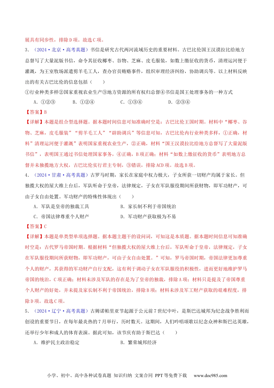 小学、初中、高中各种试卷真题知识归纳文案合同PPT等免费下载www.doc985.com专题09古代文明的产生、发展与中古时期的世界1.(2024·安徽·高考真题)古代埃及王表通常是指按照年代次序罗列统治者形象、名字和头衔的文献。约公元前3200年至公元前3000年之间,王表中的大量王名写于王名框中,王名框上一般刻画有代表荷鲁斯神的鹰隼形象。新王国(前1550~前1069)时期,王表形制臻于成熟。据此可知,古代埃及王表()A.说明了象形文字的缘起B.融合了宗教与王权的观念C.呈现了埃及神庙的兴衰D.展示了分裂与统一的场景【答案】B【详解】本题是单类型单项选择题。据本题主题干的设问词,可知这是推断题。据本题时间信息可知准确时空是:古代(埃及)。根据材料“王表中的大量王名写于王名框中,王名框上一般刻画有代表荷鲁斯神的鹰隼形象”可知,古代埃及王表的内容里既有展现王权的方面,也有展现神的方面,B项正确;材料主要阐述的是古代埃及王表形制的内容和发展,没有文字发展的相关内容,排除A项;材料主要阐述的是古代埃及王表形制的内容和发展,没有提及埃及神庙的兴衰,排除C项;材料主要阐述的是古代埃及王表形制的内容和发展,无法由此展现出分裂与统一的场景,排除D项。故选B项。2.(2024·广东·高考真题)古代世界的波斯帝国、秦汉王朝、罗马帝国和印加帝国为加强统治,均实行君主专制制度,采取诸如颁布法律、改革币制、修建道路等措施。这反映出古代文明的发展具有()A.互鉴性B.同源性C.统一性D.同步性【答案】C【详解】本题是单类型单项选择题。据本题主题干的设问词,可知这是本质题。据本题时间信息可知准确时空是:古代(世界)。根据材料“古代世界的波斯帝国、秦汉王朝、罗马帝国、印加帝国为加强统治,均实行君主专制,采取诸如颁布法律、改革币制、修建道路等措施。”并结合所学可知,古代世界的大帝国为巩固统治,在政治、经济等方面采取的措施具有一致性,可见古代世界人类文明发展是一个统一性与多样性的辨证过程,各种文明之间内在地具有统一性,C项正确;材料未体现不用帝国之间文明的互相借鉴,排除A项;古代文明发展并非同源,排除B项;这几大帝国存在的时间并非同时,无法得出文明的发小学、初中、高中各种试卷真题知识归纳文案合同PPT等免费下载www.doc985.com展具有同步性,排除D项。故选C项。3.(2024·北京·高考真题)书信是研究古代两河流域历史的重要材料。古巴比伦国王汉谟拉比给地方总督写了大量泥版书信,命令其征收椰枣、谷物、芝麻、皮毛服装,如数上缴征收的货币,清理运河便于灌溉,为王室牧场派遣剪羊毛工人,查办官员贿赂事件,组织审理经济纠纷,协助调兵等。以上材料反映出的有关古巴比伦的信息包括()①行业种类多样②国家重视农业生产③地方资源的所有权归总督④书信是国王处理事务的一种方式A.①②③B.①②④C.①③④D.②③④【答案】B【详解】本题是组合型选择题。据本题时间信息可知准确时空是:古巴比伦王国时期。材料中“椰枣、谷物、芝麻,皮毛服装”“剪羊毛工人”“辟助调兵”等信息可知,古巴比伦内行业种类多样,①正确,材料”清理运河便于灌溉”表明国家重视农业生产,②正确,材料“国王汉谟拉比给地方总督写了大量泥版书信”,表明国王通过书信处理国家事务,④正确,B项正确;材料“如数上缴征收的货币”表明地方总督并未独揽地方大权,古巴比伦实行君主专制,③错误,排除ACD项。故选B项。4.(2024·甘肃·高考真题)古罗马时期,家长在家庭中权力极大,子女所获一切财产均属于家长。但独揽大权的屋大维上台后,军队听命于皇帝,法律规定,子女在军队服役期间所获财物,即军功财产,可由子女自由处置。军功财产的特殊性体现出()A.军队是皇帝的独裁工具B.家长制不利于帝国统治C.帝国法律尊重个人财产D.军功财产获取极为不易【答案】C【详解】本题是单类型单项选择题。据本题主题干的设问词,可知这是本质题。据本题时间信息可知准确时空是:古代罗马帝国时期。根据材料“但独揽大权的屋大维上台后,军队听命于皇帝,法律规定,子女在军队服役期间所获财物,即军功财产,可由子女自由处置。...