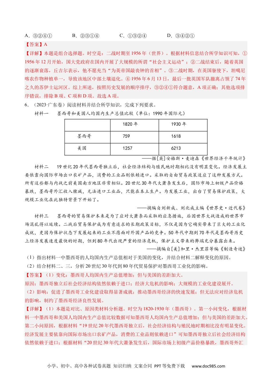 小学、初中、高中各种试卷真题知识归纳文案合同PPT等免费下载www.doc985.com专题12世界殖民体系的形成、瓦解与亚非拉民族民主运动1.(2023·北京卷)墨西哥在1821年独立后,以阿兹特克帝国的继承者自居。墨西哥土生白人将阿兹特克人视为祖先,将阿兹特克人的末代皇帝视为抵抗西班牙殖民者的民族英雄。这些做法意在A.打击英法在拉美的殖民统治B.深化民族意识和国家观念C.推动墨西哥的民族独立运动D.重建阿兹特克帝国的文明【答案】B【详解】本题是单类型单项选择题。据设问词可知是目的题。时空是1821年后(墨西哥)。据材料得出主要结论:独立后的墨西哥以阿兹特克帝国的继承者自居,奉阿兹特克人为祖先,视末代皇帝为民族英雄,以此来强化民众的民族认同,增强民众的国家观念,B项正确;墨西哥独立打击了西班牙的殖民统治,与英法在拉美的殖民统治关系不大,排除A项;墨西哥独立后的做法有利于巩固民族独立成果,而不是推动民族独立运动,排除C项;墨西哥独立后,意在用阿兹特克帝国的文明来增强国家民族意识,并不是重建文明,排除D项。故选B项。2.(2023·湖北卷)在第一次世界大战中,殖民国家曾动用相当数量的军力迫使非洲人支持宗主国。在第二次世界大战中,殖民国家不再仅仅依赖武力,而是更倾向于运用电影、无线电和报纸来推广战时宣传,鼓励和邀请非洲人支持欧洲战争。这种转变的主要原因是A.宗主国殖民控制放松B.非洲人民的广泛觉醒C.现代技术手段的发展D.世界大战性质的转变【答案】D【详解】本题是单类型单项选择题。据本题主题干设问词,可知这是原因题。据本题时间信息可知准确时空是一战至二战期间(世界)。结合所学内容可知,与一战相比,二战是反法西斯战争,战争的性质的变化使得殖民国家可以通过宣传号召的方式来鼓动殖民地国家参与二战,D项正确;A项表述不严谨,宗主国殖民控制放松的原因是自身实力下降,排除A项;非洲人民在一战后就已经在不断觉醒,非洲人民的觉醒并不是他们参与世界大战的主要原因,排除B项;C项不是主要原因,排除C项。故选D项。3.(2023·山东卷)下图为某一时期欧洲主要殖民国家在美洲和非洲的殖民地分布示意图。这一时期小学、初中、高中各种试卷真题知识归纳文案合同PPT等免费下载www.doc985.comA.拉丁美洲民族独立运动兴起B.大西洋三角贸易已走向衰落C.西、葡殖民优势逐渐被打破D.倾销工业品是主要掠夺手段【答案】C【详解】本题是单类型单项选择题。据本题主题干的设问词,可知这是本质题。据本题时间信息可知准确时空是:近代(世界)。根据题中图例发现此时期在美洲的殖民国家除了西班牙、葡萄牙之外还有英国、荷兰、法国等殖民国家,且英国、法国、荷兰的殖民地面积较之教材中第12课“拉丁美洲的殖民地化”一目中的插图的面积变大了,说明此时期西班牙、葡萄牙在拉丁美洲的殖民优势逐渐被打破,C项正确;材料信息强调有欧洲主要殖民国家在拉丁美洲和非洲所占殖民地情况,并非强调拉丁美洲的民族独立运动,排除A项;题干信息与三角贸易无关,排除B项;材料信息不能反映掠夺手段,排除D项。故选C项。4.(2023·山东卷)1961年,加纳领导人克瓦米·恩克鲁玛在其著作中指出,非洲许多地区在文化、语言和思想上确实存在着很大差异,但“我们都是非洲人,这是基本的事实……语言、文化和政治体制不同所带来的困难并不是不能战胜的”。他力图A.实现非洲各国的独立B.建立非洲国家的联合C.保持非洲地区文化的多元性D.解决非洲内部发展的不平衡【答案】B【详解】本题是单类型单项选择题。据本题主题干的设问词,可知这是目的题。据本题时间信息可知准确时空是:二战后的非洲。结合所学知识可知,瓦米·恩克鲁玛推行泛非主义,支持非洲民族独立运动,倡导非洲统一,但是种种举措最终招致了西方帝国主义国家和国内反动势力的不满和敌视,最终在1966年2月24日应邀访问越南时被军警发动军事政变推翻,长期流亡海外。因此根据材料“我们都是非洲人,这是基本的事实……语言、文化和政治体制不同所带来的困难并不是不能战胜的”可知,克瓦米·恩克鲁玛淡化语言、文化和政治体制的差异,主张建立非洲国家的联合,B项正确;1...