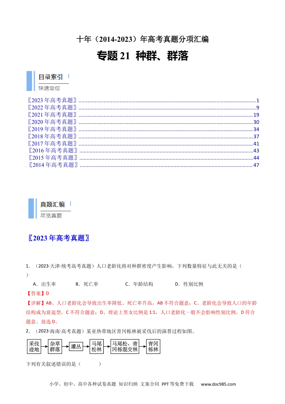 小学、初中、高中各种试卷真题知识归纳文案合同PPT等免费下载www.doc985.com十年(2014-2023)年高考真题分项汇编专题21种群、群落〖2023年高考真题〗.........................................................................................................................1〖2022年高考真题〗.........................................................................................................................9〖2021年高考真题〗.......................................................................................................................19〖2020年高考真题〗.......................................................................................................................30〖2019年高考真题〗.......................................................................................................................34〖2018年高考真题〗.......................................................................................................................37〖2017年高考真题〗.......................................................................................................................41〖2016年高考真题〗.......................................................................................................................43〖2015年高考真题〗.......................................................................................................................44〖2014年高考真题〗......................................................................................................................47〖2023年高考真题〗1.(2023·天津·统考高考真题)人口老龄化将对种群密度产生影响,下列数量特征与此无关的是()A.出生率B.死亡率C.年龄结构D.性别比例【答案】D【详解】AB、人口老龄化会导致出生率降低、死亡率升高,AB不符合题意;C、老龄化会导致人口的年龄结构成为衰退型,C不符合题意;D、理论上男女比例是11∶,人口老龄化一般不会影响性别比例,D符合题意。故选D。2.(2023·海南·高考真题)某亚热带地区青冈栎林被采伐后的演替过程如图。下列有关叙述错误的是()小学、初中、高中各种试卷真题知识归纳文案合同PPT等免费下载www.doc985.comA.采伐迹地保留了原有青冈栎林的土壤条件和繁殖体,该演替属于次生演替B.与杂草群落相比,灌丛对阳光的利用更充分C.与灌丛相比,马尾松林的动物分层现象更明显D.与马尾松林相比,马尾松、青冈栎混交林乔木层的植物种间竞争减弱【答案】D【详解】A、采伐迹地保留了原有青冈栎林的土壤条件和繁殖体,符合次生演替条件,是次生演替,A正确;B、灌丛比杂草群落结构更复杂,对阳光的吸收利用更充分,B正确;C、马尾松林的植物群落分层现象比灌丛更明显,动物要以植物为食或作为栖息场所,所以马尾松林的动物分层现象更明显,C正确;D、马尾松林只有马尾松一种乔木,没有乔木层的植物种间竞争,马尾松、青冈栎混交林乔木层的植物是马尾松和青冈栎,二者之间存在种间竞争,所以种间竞争增强了,D错误。故选D。3.(2023·海南·高考真题)海草是一类生长在浅海的单子叶植物,常在不同潮带形成海草床,具有极高的生产力。某海域海草群落的种类及其分布见表。分布潮带海草种类中潮带低潮带潮下带上部潮下带下部海神草+++齿叶海神草++羽叶二药藻++++二药藻++++海菖蒲++注:“+”表示存在,“-”表示无。下列有关叙述错误的是()A.可用样方法调查某种海草的种群密度B.海草叶片表面附着的藻类与海草的种间关系是竞争C.据表可知,海草群落物种丰富度最高的潮带是低潮带和潮下带上部D.据表可知,生态位最宽的海草是海神草和二药藻【答案】D【详解】A、植物或活动能力弱、活动范围小的动物都可用样方法调查种群密度,A正确;B、海草叶片表面附着的藻类与海草竞争阳光等资源,二者的种间关系是竞争,B正...