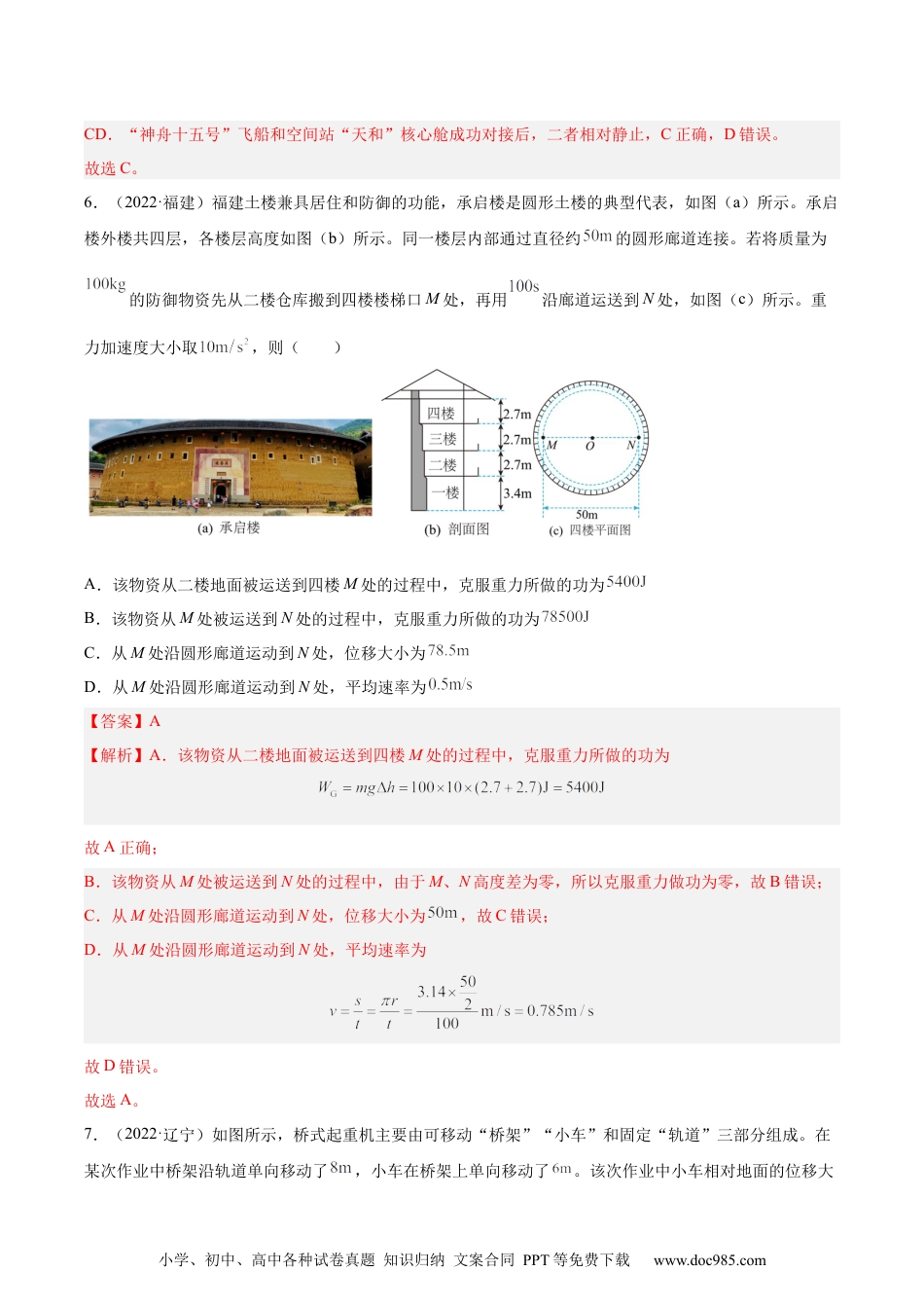 小学、初中、高中各种试卷真题知识归纳文案合同PPT等免费下载www.doc985.com专题01运动的描述一、单选题1.(2023·上海)一场跑步比赛中,第三跑道的运动员跑到处时,秒表计时为。根据以上信息,能否算得该运动员在这段时间内的平均速度和瞬时速度()A.可以算得平均速度,可以算得瞬时速度B.无法算得平均速度,可以算得瞬时速度C.可以算得平均速度,无法算得瞬时速度D.无法算得平均速度,无法算得瞬时速度【答案】C【解析】运动员跑步比赛过程中,运动过程中的加速度不一定恒定,跑到处时,秒表计时为,故可计算出这段时间内的平均速度,但无法算出这段时间的瞬时速度。故选C。2.(2023·浙江)在足球运动中,足球入网如图所示,则()A.踢香蕉球时足球可视为质点B.足球在飞行和触网时惯性不变C.足球在飞行时受到脚的作用力和重力D.触网时足球对网的力大于网对足球的力【答案】B【解析】A.在研究如何踢出“香蕉球”时,需要考虑踢在足球上的位置与角度,所以不可以把足球看作质点,故A错误;B.惯性只与质量有关,足球在飞行和触网时质量不变,则惯性不变,故B正确;C.足球在飞行时脚已经离开足球,故在忽略空气阻力的情况下只受重力,故C错误;D.触网时足球对网的力与网对足球的力是相互作用力,大小相等,故D错误。故选B。3.(2023·浙江)图为“玉兔二号”巡视器在月球上从O处行走到B处的照片,轨迹OA段是直线,AB段是曲线,巡视器质量为135kg,则巡视器()小学、初中、高中各种试卷真题知识归纳文案合同PPT等免费下载www.doc985.comA.受到月球的引力为1350NB.在AB段运动时一定有加速度C.OA段与AB段的平均速度方向相同D.从O到B的位移大小等于OAB轨迹长度【答案】B【解析】A.在月球上的g与地球不同,故质量为135kg的巡视器受到月球的引力不是1350N,故A错误;B.由于在AB段运动时做曲线运动,速度方向一定改变,一定有加速度,故B正确;C.平均速度的方向与位移方向相同,由图可知OA段与AB段位移方向不同,故平均速度方向不相同,故C错误;D.根据位移的定义可知从O到B的位移大小等于OB的连线长度,故D错误。故选B。4.(2023·浙江)下列四组物理量中均为标量的是()A.电势电场强度B.热量功率C.动量动能D.速度加速度【答案】B【解析】A.电势只有大小没有方向,是标量;电场强度既有大小又有方向,是矢量,故A错误;B.热量和功率都是只有大小没有方向,都是标量,故B正确;C.动量既有大小又有方向,是矢量;动能只有大小没有方向,是标量,故C错误;D.速度和加速度都是既有大小又有方向的物理量,是矢量,故D错误。故选B。5.(2023·浙江)“神舟十五号”飞船和空间站“天和”核心舱成功对接后,在轨运行如图所示,则()A.选地球为参考系,“天和”是静止的B.选地球为参考系,“神舟十五号”是静止的C.选“天和”为参考系,“神舟十五号”是静止的D.选“神舟十五号”为参考系,“天和”是运动的【答案】C【解析】AB.“神舟十五号”飞船和空间站“天和”核心舱成功对接后,在轨绕地球做圆周运动,选地球为参考系,二者都是运动的,AB错误;小学、初中、高中各种试卷真题知识归纳文案合同PPT等免费下载www.doc985.comCD.“神舟十五号”飞船和空间站“天和”核心舱成功对接后,二者相对静止,C正确,D错误。故选C。6.(2022·福建)福建土楼兼具居住和防御的功能,承启楼是圆形土楼的典型代表,如图(a)所示。承启楼外楼共四层,各楼层高度如图(b)所示。同一楼层内部通过直径约的圆形廊道连接。若将质量为的防御物资先从二楼仓库搬到四楼楼梯口M处,再用沿廊道运送到N处,如图(c)所示。重力加速度大小取,则()A.该物资从二楼地面被运送到四楼M处的过程中,克服重力所做的功为B.该物资从M处被运送到N处的过程中,克服重力所做的功为C.从M处沿圆形廊道运动到N处,位移大小为D.从M处沿圆形廊道运动到N处,平均速率为【答案】A【解析】A.该物资从二楼地面被运送到四楼M处的过程中,克服重力所做的功为故A正确;B.该物资从M处被运送到N处的过程中,由于M、N高度差为零,所以克服重力做功为零,故B错误;C.从M处沿圆形廊道运动到N处...