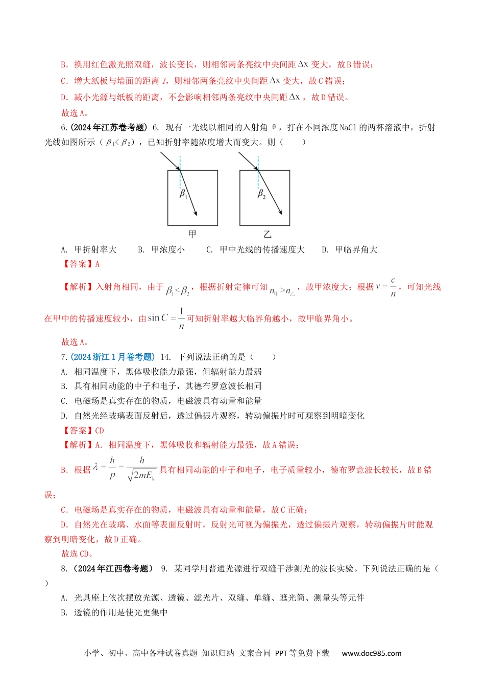 小学、初中、高中各种试卷真题知识归纳文案合同PPT等免费下载www.doc985.com专题14光学1.(2024年新课标考题)4.三位科学家由于在发现和合成量子点方面的突出贡献,荣获了2023年诺贝尔化学奖。不同尺寸的量子点会发出不同颜色的光。现有两种量子点分别发出蓝光和红光,下列说法正确的是()A.蓝光光子的能量大于红光光子的能量B.蓝光光子的动量小于红光光子的动量C.在玻璃中传播时,蓝光的速度大于红光的速度D.蓝光在玻璃中传播时的频率小于它在空气中传播时的频率【答案】A【解析】AB.由于红光的频率小于蓝光的频率,则红光的波长大于蓝光的波长,根据可知蓝光光子的能量大于红光光子的能量;根据可知蓝光光子的动量大于红光光子的动量,故A正确,B错误;C.由于红光的折射率小于蓝光,根据可知在玻璃中传播时,蓝光的速度小于红光的速度,故C错误;D.光从一种介质射入另一种介质中频率不变,故D错误。故选A。2.(2024年上海卷考题)3.车载雷达系统可以发出激光和超声波信号,其中()A.仅激光是横波B.激光与超声波都是横波C.仅超声波是横波D.激光与超声波都不是横波【答案】B【解析】车载雷达系统发出的激光和超声波信号都是横波。故选B。3.(2024年上海卷考题)5.在“用双缝干涉实验测量光的波长”的实验中,双缝间距为d,双缝到光强分布传感器距离为L。(1)实验时测得N条暗条纹间距为D,则激光器发出的光波波长为______。A.B.C.D.(2)在激光器和双缝之间加入一个与光束垂直放置的偏振片,测得的干涉条纹间距与不加偏振片时相比______A.增加B.不变C.减小(3)移去偏振片,将双缝换成单缝,能使单缝衍射中央亮纹宽度增大的操作有______(多选)A.减小缝宽B.使单缝靠近传感器小学、初中、高中各种试卷真题知识归纳文案合同PPT等免费下载www.doc985.comC.增大缝宽D.使单缝远离传感器【答案】①.B②.B③.AD【解析】[1]条暗条纹间距为,说明条纹间距又解得故选B。[2]加偏振片不会改变光的波长,因此条纹间距不变,B正确。故选B。[3]移去偏振片,将双缝换成单缝,则会发生单缝衍射现象,根据单缝衍射规律,减小缝的宽度、增加单缝到光屏的距离可以增大中央亮纹宽度。故选AD。4.(2024年江苏卷考题)2.用立体影院的特殊眼镜去观看手机液晶屏幕,左镜片明亮,右镜片暗,现在将手机屏幕旋转90度,会观察到()A.两镜片都变亮B.两镜片都变暗C.两镜片没有任何变化D.左镜片变暗,右镜片变亮【答案】D【解析】立体影院的特殊眼镜是利用了光的偏振,其镜片为偏振片,立体影院的特殊眼镜去观看手机液晶屏幕,左镜片明亮,右镜片暗,根据可知将手机屏幕旋转90度后左镜片变暗,右镜片变亮。故选D。5.(2024年辽宁卷考题)4.某同学自制双缝干涉实验装置,在纸板上割出一条窄缝,于窄缝中央沿缝方向固定一根拉直的头发丝形成双缝,将该纸板与墙面平行放置,如图所示。用绿色激光照双缝,能在墙面上观察到干涉条纹。下列做法可以使相邻两条亮纹中央间距变小的是()A.换用更粗的头发丝B.换用红色激光照双缝C.增大纸板与墙面的距离D.减小光源与纸板的距离【答案】A【解析】由于干涉条纹间距,可知:A.换用更粗的头发丝,双缝间距d变大,则相邻两条亮纹中央间距变小,故A正确;小学、初中、高中各种试卷真题知识归纳文案合同PPT等免费下载www.doc985.comB.换用红色激光照双缝,波长变长,则相邻两条亮纹中央间距变大,故B错误;C.增大纸板与墙面的距离l,则相邻两条亮纹中央间距变大,故C错误;D.减小光源与纸板的距离,不会影响相邻两条亮纹中央间距,故D错误。故选A。6.(2024年江苏卷考题)6.现有一光线以相同的入射角θ,打在不同浓度NaCl的两杯溶液中,折射光线如图所示(β1<β2),已知折射率随浓度增大而变大。则()A.甲折射率大B.甲浓度小C.甲中光线的传播速度大D.甲临界角大【答案】A【解析】入射角相同,由于,根据折射定律可知,故甲浓度大;根据,可知光线在甲中的传播速度较小,由可知折射率越大临界角越小,故甲临界角小。故选A。7.(2024浙江1月卷考题)14.下列说法正确的是()A.相同温度下,黑体吸收能力最强,但辐射能力最弱B.具有相同动能的中子和电子,其德布罗意波...