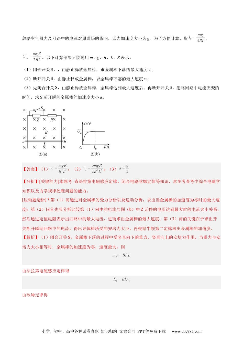 小学、初中、高中各种试卷真题知识归纳文案合同PPT等免费下载www.doc985.com专题50导体棒在导轨上运动问题(二)32.(2021·海南·高考真题)如图,间距为l的光滑平行金属导轨,水平放置在方向竖直向下的匀强磁场中,磁场的磁感应强度大小为B,导轨左端接有阻值为R的定值电阻,一质量为m的金属杆放在导轨上。金属杆在水平外力作用下以速度v0向右做匀速直线运动,此时金属杆内自由电子沿杆定向移动的速率为u0。设金属杆内做定向移动的自由电子总量保持不变,金属杆始终与导轨垂直且接触良好,除了电阻R以外不计其它电阻。(1)求金属杆中的电流和水平外力的功率;(2)某时刻撤去外力,经过一段时间,自由电子沿金属杆定向移动的速率变为,求:(i)这段时间内电阻R上产生的焦耳热;(ii)这段时间内一直在金属杆内的自由电子沿杆定向移动的距离。【答案】(1),;(2)(i),(ii)【解析】(1)金属棒切割磁感线产生的感应电动势E=Blv0则金属杆中的电流由题知,金属杆在水平外力作用下以速度v0向右做匀速直线运动则有根据功率的计算公式有(2)(i)设金属杆内单位体积的自由电子数为n,金属杆的横截面积为S,则金属杆在水平外力作用下以速度v0向右做匀速直线运动时的电流由微观表示为小学、初中、高中各种试卷真题知识归纳文案合同PPT等免费下载www.doc985.com解得当电子沿金属杆定向移动的速率变为时,有解得v′=根据能量守恒定律有解得(ii)由(i)可知在这段时间内金属杆的速度由v0变到,设这段时间内一直在金属杆内的自由电子沿杆定向移动的距离为d,规定水平向右为正方向,则根据动量定理有由于解得33.(2021·湖北·统考高考真题)如图(a)所示,两根不计电阻、间距为L的足够长平行光滑金属导轨,竖直固定在匀强磁场中,磁场方向垂直于导轨平面向里,磁感应强度大小为B。导轨上端串联非线性电子元件Z和阻值为R的电阻。元件Z的图像如图(b)所示,当流过元件Z的电流大于或等于时,电压稳定为Um。质量为m、不计电阻的金属棒可沿导轨运动,运动中金属棒始终水平且与导轨保持良好接触。小学、初中、高中各种试卷真题知识归纳文案合同PPT等免费下载www.doc985.com忽略空气阻力及回路中的电流对原磁场的影响,重力加速度大小为g。为了方便计算,取,。以下计算结果只能选用m、g、B、L、R表示。(1)闭合开关S。,由静止释放金属棒,求金属棒下落的最大速度v1;(2)断开开关S,由静止释放金属棒,求金属棒下落的最大速度v2;(3)先闭合开关S,由静止释放金属棒,金属棒达到最大速度后,再断开开关S。忽略回路中电流突变的时间,求S断开瞬间金属棒的加速度大小a。【答案】(1);(2);(3)【分析】[关键能力]本题考查法拉第电磁感应定律、闭合电路欧姆定律等知识,意在考查考生综合电磁学知识以及力学规律处理问题的能力。[压轴题透析]3第(1)问通过对金属棒的受力分析以及运动分析,求出当金属棒的加速度为零时的最大速度;第(2)问首先应分析比较第(1)问中的电流与图(b)中Z元件的电压达到最大时的电流大小关系,然后通过定值电阻表示出回路中的最大电流,进而求出金属棒的最大速度;第(3)问的关键在于求出开关断开瞬间回路中的电流,得出导体棒所受的安培力大小,再根据牛顿第二定律求出金属棒的加速度。【解析】(1)闭合开关S,金属棒下落的过程中受竖直向下的重力、竖直向上的安培力作用,当重力与安培力大小相等时,金属棒的加速度为零,速度最大,则由法拉第电磁感应定律得由欧姆定律得小学、初中、高中各种试卷真题知识归纳文案合同PPT等免费下载www.doc985.com解得(2)由第(1)问得由于断开开关S后,当金属棒的速度达到最大时,元件Z两端的电压恒为此时定值电阻两端的电压为回路中的电流为又由欧姆定律得解得(3)开关S闭合,当金属棒的速度最大时,金属棒产生的感应电动势为断开开关S的瞬间,元件Z两端的电压为则定值电阻两端的电压为小学、初中、高中各种试卷真题知识归纳文案合同PPT等免费下载www.doc985.com电路中的电流为金属棒受到的安培力为对金属棒由牛顿第二定律得解得34.(2021·天津·高考真题)如图所示,两根足够长的平行光滑金属导轨...