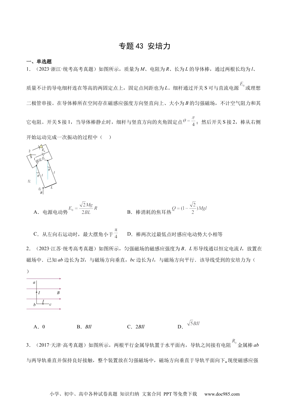 小学、初中、高中各种试卷真题知识归纳文案合同PPT等免费下载www.doc985.com专题43安培力一、单选题1.(2023·浙江·统考高考真题)如图所示,质量为M、电阻为R、长为L的导体棒,通过两根长均为l、质量不计的导电细杆连在等高的两固定点上,固定点间距也为L。细杆通过开关S可与直流电源或理想二极管串接。在导体棒所在空间存在磁感应强度方向竖直向上、大小为B的匀强磁场,不计空气阻力和其它电阻。开关S接1,当导体棒静止时,细杆与竖直方向的夹角固定点;然后开关S接2,棒从右侧开始运动完成一次振动的过程中()A.电源电动势B.棒消耗的焦耳热C.从左向右运动时,最大摆角小于D.棒两次过最低点时感应电动势大小相等2.(2023·江苏·统考高考真题)如图所示,匀强磁场的磁感应强度为B.L形导线通以恒定电流I,放置在磁场中.已知ab边长为2l,与磁场方向垂直,bc边长为l,与磁场方向平行.该导线受到的安培力为()A.0B.BIlC.2BIlD.3.(2017·天津·高考真题)如图所示,两根平行金属导轨置于水平面内,导轨之间接有电阻金属棒ab与两导轨垂直并保持良好接触,整个装置放在匀强磁场中,磁场方向垂直于导轨平面向下现使磁感应强。小学、初中、高中各种试卷真题知识归纳文案合同PPT等免费下载www.doc985.com度随时间均匀减小,ab始终保持静止。下列说法正确的是()A.ab中的感应电流方向由a到bB.ab中的感应电流逐渐减小C.ab所受的安培力保持不变D.ab所受的静摩擦力保持不变4.(2022·北京·高考真题)如图所示平面内,在通有图示方向电流I的长直导线右侧,固定一矩形金属线框,边与导线平行。调节电流I使得空间各点的磁感应强度随时间均匀增加,则()A.线框中产生的感应电流方向为B.线框中产生的感应电流逐渐增大C.线框边所受的安培力大小恒定D.线框整体受到的安培力方向水平向右5.(2022·江苏·高考真题)如图所示,两根固定的通电长直导线a、b相互垂直,a平行于纸面,电流方向向右,b垂直于纸面,电流方向向里,则导线a所受安培力方向()A.平行于纸面向上B.平行于纸面向下C.左半部分垂直纸面向外,右半部分垂直纸面向里D.左半部分垂直纸面向里,右半部分垂直纸面向外6.(2022·湖南·统考高考真题)如图(a),直导线MN被两等长且平行的绝缘轻绳悬挂于水平轴OO′上,其所在区域存在方向垂直指向OO′的磁场,与OO′距离相等位置的磁感应强度大小相等且不随时间变化,其截面图如图(b)所示。导线通以电流I,静止后,悬线偏离竖直方向的夹角为θ。下列说法正确的是()小学、初中、高中各种试卷真题知识归纳文案合同PPT等免费下载www.doc985.comA.当导线静止在图(a)右侧位置时,导线中电流方向由N指向MB.电流I增大,静止后,导线对悬线的拉力不变C.tanθ与电流I成正比D.sinθ与电流I成正比7.(2022·浙江·统考高考真题)如图所示,将一通电螺线管竖直放置,螺线管内部形成方向竖直向上、磁感应强度大小B=kt的匀强磁场,在内部用绝缘轻绳悬挂一与螺线管共轴的金属薄圆管,其电阻率为、高度为h、半径为r、厚度为d(d≪r),则()A.从上向下看,圆管中的感应电流为逆时针方向B.圆管的感应电动势大小为C.圆管的热功率大小为D.轻绳对圆管的拉力随时间减小8.(2022·浙江·统考高考真题)利用如图所示装置探究匀强磁场中影响通电导线受力的因素,导线垂直匀强磁场方向放置。先保持导线通电部分的长度L不变,改变电流I的大小,然后保持电流I不变,改变导线通电部分的长度L,得到导线受到的安培力F分别与I和L的关系图象,则正确的是()小学、初中、高中各种试卷真题知识归纳文案合同PPT等免费下载www.doc985.comA.B.C.D.9.(2017·全国·高考真题)扫描隧道显微镜(STM)可用来探测样品表面原子尺度上的形貌,为了隔离外界振动对STM的扰动,在圆底盘周边沿其径向对称地安装若干对紫铜薄板,并施加恒定磁场来快速衰减其微小振动,如图所示。出现扰动后,对于紫铜薄板上下及左右振动的衰减最有效的方案是()A.B.C.D.10.(2021·江苏·高考真题)在光滑桌面上将长为的软导线两端固定,固定点的距离为,导线通有电流I,处于磁感应强度大小...