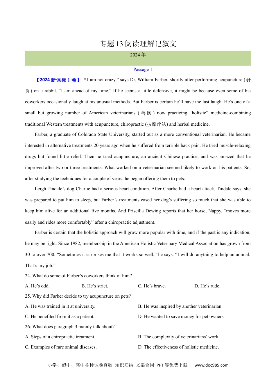 小学、初中、高中各种试卷真题知识归纳文案合同PPT等免费下载www.doc985.com专题13阅读理解记叙文2024年Passage1【2024新课标Ⅰ卷】“Iamnotcrazy,”saysDr.WilliamFarber,shortlyafterperformingacupuncture(针灸)onarabbit.“Iamaheadofmytime.”Ifheseemsalittledefensive,itmightbebecauseevensomeofhiscoworkersoccasionallylaughathisunusualmethods.ButFarberiscertainhe’llhavethelastlaugh.He’soneofasmallbutgrowingnumberofAmericanveterinarians(兽医)nowpracticing“holistic”medicine-combiningtraditionalWesterntreatmentswithacupuncture,chiropractic(按摩疗法)andherbalmedicine.Farber,agraduateofColoradoStateUniversity,startedoutasamoreconventionalveterinarian.Hebecameinterestedinalternativetreatments20yearsagowhenhesufferedfromterriblebackpain.Hetriedmuscle-relaxingdrugsbutfoundlittlerelief.Thenhetriedacupuncture,anancientChinesepractice,andwasamazedthatheimprovedaftertwoorthreetreatments.Whatworkedonaveterinarianseemedlikelytoworkonhispatients.So,afterstudyingthetechniquesforacoupleofyears,hebeganofferingthemtopets.LeighTindale’sdogCharliehadaseriousheartcondition.AfterCharliehadaheartattack,Tindalesays,shewaspreparedtoputhimtosleep,butFarber’streatmentseasedherdog’ssufferingsomuchthatshewasabletokeephimaliveforanadditionalfivemonths.AndPriscillaDewingreportsthatherhorse,Nappy,“movesmoreeasilyandridesmorecomfortably”afterachiropracticadjustment.Farberiscertainthattheholisticapproachwillgrowmorepopularwithtime,andifthepastisanyindication,hemayberight:Since1982,membershipintheAmericanHolisticVeterinaryMedicalAssociationhasgrownfrom30toover700.“Sometimesitsurprisesmethatitworkssowell,”hesays.“Iwilldoanythingtohelpananimal.That’smyjob.”24.WhatdosomeofFarber’scoworkersthinkofhim?A.He’sodd.B.He’sstrict.C.He’sbrave.D.He’srude.25.WhydidFarberdecidetotryacupunctureonpets?A.Hewastrainedinitatuniversity.B.Hewasinspiredbyanotherveterinarian.C.Hebenefitedfromitasapatient.D.Hewantedtosavemoneyforpetowners.26.Whatdoesparagraph3mainlytalkabout?A.Stepsofachiropractictreatment.B.Thecomplexityofveterinarians’work.C.Examplesofrareanimaldiseases.D.Theeffectivenessofholisticmedicine.小学、初中、高中各种试卷真题知识归纳文案合同PPT等免费下载www.doc985.com27.WhydoestheauthormentiontheAmericanHolisticVeterinaryMedicalAssociation?A.ToproveFarber’spoint.B.Toemphasizeitsimportance.C.Topraiseveterinarians.D.Toadvocateanimalprotection.【答案】24.A25.C26.D27.A【导语】本文是记叙文。文章讲述兽医威廉·法伯(WilliamFarber)博士在从针灸中受益后,将综合医疗应用于动物,并取得了初步成效。【24题详解】细节理解题。根据第一段的“Ifheseemsalittledefensive,itmightbebecauseevensomeofhiscoworkersoccasionallylaughathisunusualmethods.(如果他看起来有点自卫,那可能是因为他的一些同事偶尔会嘲笑他不寻常的方法。)”可知,Farber的同事们有时会嘲笑他不寻常的方法,他们认为他很奇怪。故选A。【25题详解】细节理解题。根据第二段的“Thenhetriedacupuncture,anancientChinesepractice,andwasamazedthatheimprovedaftertwoorthreetreatments.Whatworkedonaveterinarianseemedlikelytoworkonhispatients.So,afterstudyingthetechniquesforacoupleofyears,hebeganofferingthemtopets.(然后,他尝试了针灸,这是一种古老的中国疗法,并惊讶地发现,经过两三次治疗,他的病情有所好转。对兽医有效的方法似乎对他的病人也有效。因此,在研究了这些技术几年后,他开始把它们提供给宠物。)”可知,Farber作为患者从针灸中受益,这促使他决定尝试在宠物上使用针灸。故选C。【26题详解】主旨大意题。根据...