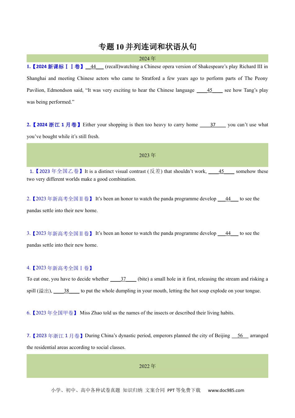 小学、初中、高中各种试卷真题知识归纳文案合同PPT等免费下载www.doc985.com专题10并列连词和状语从句2024年1.【2024新课标ⅠⅠ卷】__44___(recall)watchingaChineseoperaversionofShakespeare’splayRichardIIIinShanghaiandmeetingChineseactorswhocametoStratfordafewyearsagotoperformpartsofThePeonyPavilion,Edmondsonsaid,“ItwasveryexcitingtoheartheChineselanguage____45____seehowTang’splaywasbeingperformed.”2.【2024浙江1月卷】Eitheryourshoppingisthentooheavytocarryhome____37____youcan’tusewhatyou’veboughtwhileit’sstillfresh.2023年1.【2023年全国乙卷】Itisadistinctvisualcontrast(反差)thatshouldn’twork,____45____somehowthesetwoverydifferentworldsmakeagoodcombination.2.【2023年新高考全国Ⅱ卷】It’sbeenanhonortowatchthepandaprogrammedevelop___44___toseethepandassettleintotheirnewhome.3.【2023年新高考全国Ⅱ卷】It’sbeenanhonortowatchthepandaprogrammedevelop___44___toseethepandassettleintotheirnewhome.4.【2023年新高考全国Ⅰ卷】Toeatone,youhavetodecidewhether____37____(bite)asmallholeinitfirst,releasingthestreamandriskingaspill(溢出),____38____toputthewholedumplinginyourmouth,lettingthehotsoupexplodeonyourtongue.6.【2023年全国甲卷】MissZhaotoldusthenamesoftheinsectsordescribedtheirlivinghabits.7.【2023年浙江1月卷】DuringChina’sdynasticperiod,emperorsplannedthecityofBeijing56arrangedtheresidentialareasaccordingtosocialclasses.2022年小学、初中、高中各种试卷真题知识归纳文案合同PPT等免费下载www.doc985.com1.【2022新高考I卷】Afterathree-yearpilotperiod,theGPNPwillbeofficiallysetupnextyear.TheGPNPisdesignedtoreflecttheguidingprincipleof“protectingtheauthenticityandintegrity(完整性)ofnaturalecosystems,preservingbiologicaldiversity,protectingecologicalbufferzones,__________leavingbehindpreciousnaturalassets(资产)forfuturegenerations”.2.【2022全国乙卷】The“FirstInternationalTeaDayTeaRoadCooperativeInitiative”issued(发布)attheceremonycallsforpeopleworkingintheteaindustrytocometogethertopromoteinternationalcooperation____________culturalexchanges.3.【2022年新高考2卷】Hehungonforafewminutes___41___screamedforhisfather,buthisfatherdidn'thearhim.3.【2022年天津卷第二次】________weachievegreatsuccessinourwork,weshouldnotbetooproud.A.EversinceB.EvenifC.IncaseD.Asthough4.【2022年天津卷第二次】________gardeningmaybehardphysicalwork,thosewholoveitfinditveryrelaxingmentally.A.AlthoughB.OnceC.SinceD.Unless2021年1.【2021新高考1卷】Thoughitistheonlyunnaturalthingonyourwayupthemountain,stillithighlightsthewholeadventure7offersaplacewhereyoucansitdowntorestyourachinglegs.2.【2021.6全国甲卷】Mybikewasoldandshaky7didthejob.3.【2021全国乙卷】Itwasnotwidelyacceptedasatravelconcept4thelate1980s.小学、初中、高中各种试卷真题知识归纳文案合同PPT等免费下载www.doc985.com4.【2021.1浙江卷】Inastudyof33yearsoftrendsinBodyMassIndex(体重指数)across200countriesthescientistsfoundthatpeopleworldwidearegettingheavier1thatmostoftheriseisduetogainsinBMTinruralareas.5.【2021全国甲卷改错】Inmyopinion,whereintrouble,weshouldseekhelpfromthosewetrustmostly.6.【2021全国乙卷改错】Ialsowatertheflowersintheyardandtidyingupmyownbedroomwhatevernecessary.7.【2021年天津卷第一次】Weallneedtogetinvolvedinsavingenergy________it'satwork,athome,oratschool.8.【2021年天津卷第一次】AttheChineseartfestival,therearedifferentstands________artistsdemonstratetheirskillsandteachthevisitors.A.whereB.whichC.thatD.when9.【2021年天津卷第二次】Feelingfearfu...