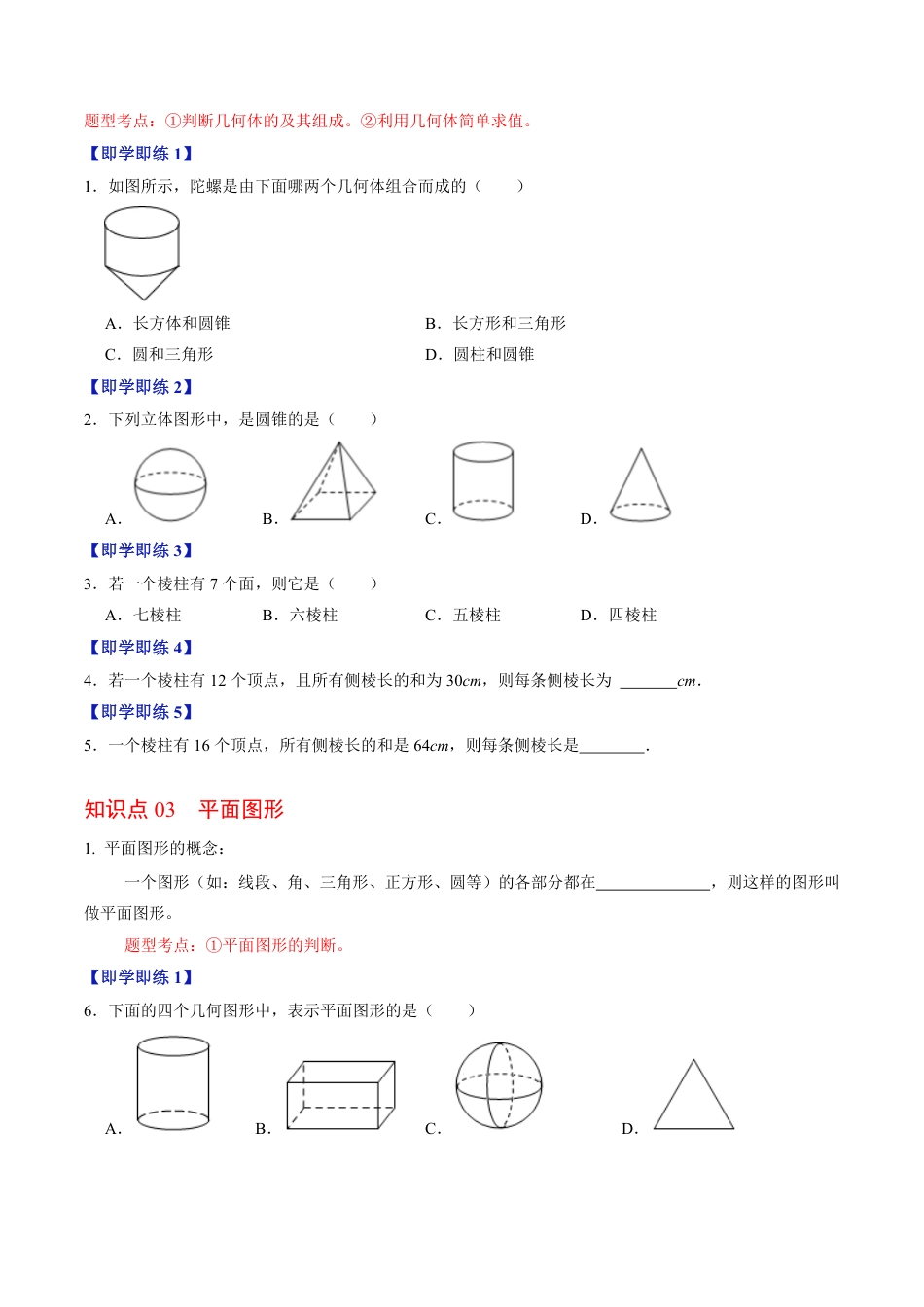 �01������������������������������������������������1.����������������������������2.����������������������������3.����������������11��������������������知识点01几何图形的概念1.������������������������������知识点02立体图形1.�����������������������������������������������������������2.��������������������������������������������������������������������������������1�1���������������������������A�������B��������C������D�����������2�2������������������A�B�C�D������3�3�������7����������A����B����C����D���������4�4�������12�������������30cm����������cm������5�5������16������������64cm�����������知识点03平面图形1.����������������������������������������������������������������������1�6������������������������A�B�C�D������2�7���������������������������������A�3B�4C�5D�6�����3�8��������①���②���③�④��⑤��⑥���⑦��⑧�⑨���������������������A�②③④⑧B�②④⑤C�④⑤⑧⑨D�②④⑤⑧知识点04从不同方向看物体(几何体的三视图)1.��������������������������������������������������������������������������������������������������������������������������������������������������1�9�������������������A�B�C�D������2�10�������������������������A�B�C�D������3�11��5����������������������������������������A�B�C�D�知识点05几何体的展开图1.����������2.����11�������������������������������������������������1�12�������������������A�B�C�D������2�13�����������������������������A����B����C����D���������3�14����������������������A����B����C���D��������4�15�������������������������A�B�C�D������5�16��������������������������A����B����C����D���������6�17���������������������������A�B�C�D������7�18���������������������������A�B�C�D������8�19�������������������������������������A�B�C�D������9�20��������������������������A�B�C�D�知识点06正方体展开图找相对面1.�����������������������������������������������������������“Z”�������������“2”��������������������������...