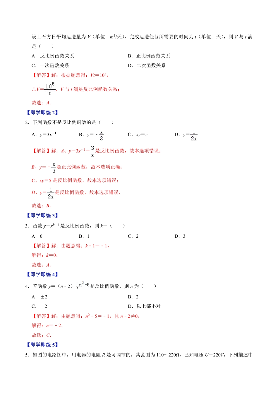 �01������������������������������������������1.�������������������������������������������2.���������������������������������知识点01反比例函数的定义1.���������������0kkxky为常数且�����������2.������������0kxky��01kkxy��0kxyk������������������������������������������������������1�1��������������“���”�����������������������105m3������������V����m3/����������������t��������V�t������A��������B��������C�������D�������������������Vt�105��V��V�t�������������A������2�2������������������A�y�3x�1B�y��C�xy�5D�y�������A�y�3x�1���������������B�y����������������C�xy�5��������������D�y������������������B������3�3���y�xk�1��������k�����A�0B�1C�2D�3�����������k�1��1����k�0����A������4�4����y��n�2���������n�����A�±2B�2C��2D�����������������n2�5��1��n�2�0����n��2����C������5�5���������������R����������110�220Ω�����U�220V��������������A�P�R�����B�P�R�����C���R�����P��D�������P����220�440W��������������U�220���P�������P���R�������������P���P������������������������R�110��P������������P��440��������R�220��P������������P��220���������P����220�440W�������BCD�������A��������A�知识点02反比例函数的图像1.����������������������������������������������������������������������������1��0>k��������������������2��0<k�������������������������������������k��������������1�6��������������������������������2�7������y�����������A�B�C�D�������k��2�0���������������B������3�8������y��a�b�����������A�B�C�D��������a�b��a�b�0�������y��a�b��������������������������B�知识点03反比例函数的图像与性质1.���������������������������������0>k���������������������������y�x���������0<k���������������������������y�x����������������������������������1�9����������y�x������������A�B�C�D�������A����0����y��x����y�x����������A���������B���0����y�x����y�x����������B��������C��k�1�0����y����������������y�x����������C���������D��k��1�0����y�����������������y�x����������D...