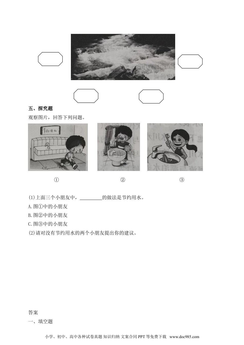 第四单元地球上的水资源4.珍惜水资源一、填空题1.导致用水量增加的客观原因是。2.节约用水的方法有、、等。3.人类的生产生活离不开。二、判断题1.淡水资源是取之不尽、用之不竭的。()2.农田滴灌是利用塑料管道上的小孔,将大量水送到农作物的根部进行灌溉。()3.循环用水是将生产过程中产生的废水经过适当处理后重复使用。()4.我们每个人都应做到节约用水,珍惜水资源。()三、选择题1.关于缺水对人们的生产生活的影响,下列说法错误的是()A.农田不能灌溉B.船不能正常航行C.工厂能生产产品2.体验淡水资源的有限的实验时,从容器中分别取21毫升、6.5毫升、0.5毫升的水装人三个杯子,依次代表的是()A.地下水、冰川水、河流与湖泊水的总量B.冰川水、地下水、河流与湖泊水的总量C.河流与湖泊水的总量、地下水、冰川水3.通过体验可利用淡水资源的供不应求的实验,了解到(B)是用水量增加的客观原因。()A.河流和湖泊水的蒸发B.人口数量的增多C.使用节水产品4.关于节约用水,下列做法错误的是()A.用洗衣机洗一件衣服B.用淘米水洗菜C.用大桶收集废水四.填图题(在圆圈里填写出水的不同用途)小学、初中、高中各种试卷真题知识归纳文案合同PPT等免费下载www.doc985.com五、探究题观察图片,回答下列问题。①②③(1)上面三个小朋友中,的做法是节约用水。A.图①中的小朋友B.图②中的小朋友C.图③中的小朋友(2)请对没有节约用水的两个小朋友提出你的建议。答案一、填空题小学、初中、高中各种试卷真题知识归纳文案合同PPT等免费下载www.doc985.com1.人口数量增多2.农田滴灌循环用水使用节水产品3.水二、判断题1.×2.×3.√4.√三、选择题1.C2.B3.B4.A四、填图题五、探究题(1)B(2)①洗完手应及时关闭水龙头。②刷牙时应关闭水龙头。小学、初中、高中各种试卷真题知识归纳文案合同PPT等免费下载www.doc985.com发电清洁救火养鱼饮用煮饭