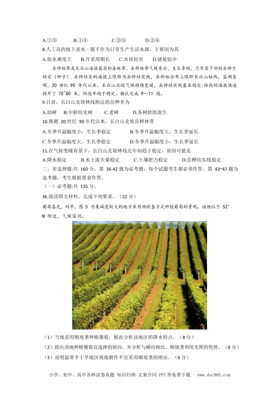小学、初中、高中各种试卷真题知识归纳文案合同PPT等免费下载www.doc985.com2020年普通高等学校招生全国统一考试文科综合能力测试地理卷(全国卷1)一、选择题:本题共35小题,每小题4分,共140分。在每小题给出的四个选项中,只有一项是符合题目要求的。治沟造地是陕西省延安市对黄土高原的丘陵沟壑区,在传统打坝淤地的基础上,集耕地营造、坝系修复、生态建设和新农村发展为一体的“田水路林村”综合整治模式,实现了乡村生产,生活、生态协调发展(图1)。据此完成1~3题。图11.与传统的打坝淤地工程相比,治沟造地更加关注()A.增加耕地面积B.防治水土流失C.改善人居环境D.提高作物产量2.治沟造地对当地生产条件的改善主要体现在()A.优化农业结构B.方便田间耕作C.健全公共服务D.提高耕地肥力3.推测开展治沟透地的地方①居住用地紧张②生态环境胞弱③坡耕地比例大④农业生产精耕细作A.①③B.①④C.②③D.②④为获得冬季防风、夏季通风的效果,我国东北平原的某城市对一居住区进行了相应的建筑布局规划,规划建筑物为高层(7层以上)和多层(7层或以下)。图2示意在该居住区内规划的两个居住片区,道路,出入口及当地盛行风向。据此完成4~6题。小学、初中、高中各种试卷真题知识归纳文案合同PPT等免费下载www.doc985.com4.下列建筑布局中,适合居住片区的是()A.①B.②C.③D.④5.相对居住片区目,居住片区上的建筑布局宜()①建筑密度大②建筑密度小③以高层建筑为生④以多层建筑为主A.①③B.①④C.②③D.②④6.该居住区出入口的设计主要为了避开()A.春季盛行风C.秋季盛行风B.夏季盛行风D.冬季盛行风利用大型挖泥船将海底岩石搅碎,并将碎石和泥沙一起吹填造地,成为在海中建设人工岛的主要方式。图3示意人工岛地下淡水分布。据此完成7~8题,7.参照图3,在造岛物质满足水渗透的前提下,人工岛形成并保持相对稳定的地下淡水区的条件是①降水充沛且季节分配均匀②降水充沛且季节集中③人工岛足够长④人工岛足够宽小学、初中、高中各种试卷真题知识归纳文案合同PPT等免费下载www.doc985.comA.①③B.①④C.②③D.②④8.人工岛的地下淡水一般不作为日常生产生活水源,主要因为其A.取水难度大B.开采周期长C.水质较差D.储量较少岳桦林带是长白山海拔最高的森林带,岳桦林帶气候寒冷,生长季短,只有其下部的岳桦才结实(种子).岳桦结实的海拔上限称为岳桦结实践,岳桦林分布上限即长白山林线。监测表明,20世纪90年代以来,长白山北坡气候持续变暖,岳桦結实线基本稳定:林线的海拔快速提升了70~80米,但近年趋于稳定。据此完成9~11题。9.目前,长白山北坡林线附近的岳桦多为A.幼树B.中龄结实树C.老树D.各树龄组混生10.推测20世纪90年代以来,长白山北坡岳桦林带A.冬季升温幅度小,生长季稳定B.冬季升温幅度大,生长季延长C.冬季升温幅度大,生长季稳定D.冬季升温幅度小,生长季延长11.在气候变暖肯景下,长白山北坡林线近年知趋于稳定,原因可能是A.降水稳定B.水土流失量稳定C.土壤肥力稳定D.岳桦结实线稳定二、非选择题:共160分,第36-42题为必考题,每个试题考生都必须作答。第43~47题为选考题,考生根据要求作答。(一)必考题:共135分。36.阅读图文材料,完成下列要求。(22分)葡萄喜光,耐旱,图5为某城度较大的地方来用顺坡垄方式种植葡萄的景观。该地位于52°N附近,气候湿润。(1)当地采用顺坡垄种植葡萄,据此分析该地区的降水特点。(8分)(2)指出该地种植葡萄宜选择的坡向,并分析与梯田相比,顺坡垄利用光照的优势。(8分)(3)说明温带半干旱地区坡地耕作不宜采用顺坡垄的理由。(6分)小学、初中、高中各种试卷真题知识归纳文案合同PPT等免费下载www.doc985.com37.阅读图文材料,完成下列要求。(24分)形成玄武岩的岩浆流动性好,喷出冷凝后,形成平坦的地形单元。如图6所示,菜海拔500米左右的玄武岩台地上,有较多海拔700米左右的玄武岩平顶山,及少量海拔900米左右的玄武岩尖顶山。调查发现,构成台地、平顶山、尖顶山的玄武岩分别形成于不同喷发时期。(1)指出玄武岩台地形成以来因流水侵蚀而发生的变化,(6分)(2)根据侵蚀程度,指出构成台地...