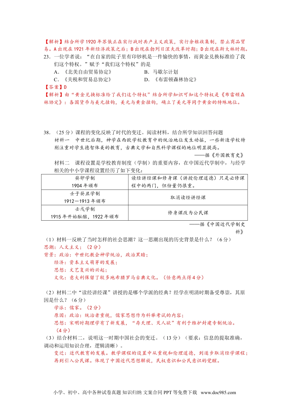 2015年广东高考文综历史12.有古代学者论述某字体的形成时说:“(官员)奏事繁多,篆字难成,即令隶人(即胥吏)佐书”。据此推断,该字体是A.小篆B.隶书C.行书D.草书【答案】B【解析】本题考查汉字的演变。秦统一中国后将小篆作为全国通用文字,后因书写不方便,被隶书所取代。13.针对皇帝频频越过中书省直接向六部官员下达诏令的现象,有朝臣说:“事不出中书,是为乱政。”由此可知,该朝臣A.反对中央集权B.主张建立内阁C.主张加强相权D.反对三省六部制【答案】C【解析】材料中该朝臣认为,如果诏令不是出自中书省,就是乱政,由此可知他是希望用中书省来牵制皇帝的,故该朝臣主张加强相权以限制王权。14.史载:明代江南昆山县的农家,“麻缕机织之事,则男子素习焉,妇人或不如也”,但乡村妇女凡耕耘、刈获、桔槔之事,与男子共其劳”。这则材料反映了当时A.小农经济的生产方式B.资本主义的萌芽C.男尊女卑的社会秩序D.官营手工业的主导地位【答案】A【解析】材料描述了小农经济的特征之一,农业和家庭手工业相结合的生产现象。15.毛泽东主张用事实反击敌人的毁谤:“敌人说:‘广东共产’,我们说:‘请看事实’……敌人说:‘广州政府勾联俄国丧权辱国’,我们说:‘请看事实’。敌人说:‘广州政府治下水深火热民不聊生’,我们说:‘请看事实’。”这些“事实”都发生于A.辛亥革命时期B.国民革命时期C.抗日战争时期D.解放战争时期【答案】B【解析】材料反映政府所在地在广州,而且还有“勾联俄国”、“广东共产”。结合所学知识,国共第一次合作期间,广州政府奉行“联俄、联共、扶助农工”的三大政策,由此可知为国民革命时期。16.1961年,中共中央农村工作部的一份报告指出:现在部分干部和农民对集体生产信心不足,以致发展到变相恢复单干,有的地方出现了“父子队”“兄弟队”式家庭作业。这则材料为例证,可用于说明A.当时土地所有制发生改变B.农业合作化运动的历史背景C.当时国民经济调整成效显著D.家庭联产承包责任制的起源【答案】D【解析】据“1961年”、“父子队”“兄弟队”判断答案为D。A项三大改造后土地所有制一直为土地公有制;B合作化开始于1953年;C国民经济调整的是农轻重的比例,与材料无关。17.表2反映了中国某时期与各国贸易的情况,据此推出符合史实的结论是表2中国对外贸易总额的国家构成(%)年份苏联美国其他国家第一年302149第二年41.30.458.3小学、初中、高中各种试卷真题知识归纳文案合同PPT等免费下载www.doc985.com第三年51.7590.00348.238A.抗日战争胜利,中苏贸易激增B.实行“一边倒”政策,中美贸易剧减C.改革开放初见成效,中国对外贸易蓬勃发展D.不结盟运动兴起,中国与发展中国家贸易往来密切【答案】B【解析】由表格中数字信息可知:中苏贸易不断增加,而中美贸易急剧减少。可知当时中苏关系密切,中美关系紧张,应该是新中国成立初期,美国敌视孤立中国,中国选择“一边倒”的外交政策。18.《十二铜表法》中说:“以后凡人民会议的所有决定都应具有法律效力”对此理解正确的是A.奴隶参与了立法B.习惯法的内容被摒弃C.贵族对法律的垄断被打破D.成文法的规定不能改变【答案】C【解析】由“以后凡人民会议的所有决定都应具有法律效力”可知平民获得了立法权,结合所学知识可知这种做法打破了贵族对法律的垄断。A、C、D三项与材料无关。19.一位哥伦比亚学者在“纪念美洲发现——两个世界文明汇合500周年国际学术讨论会”上说,“黄金和白银的作用只是使两个大陆之间的距离更加遥远了”。由此可知A.该学者关注殖民掠夺的后果B.“两个大陆”指的是美洲和非洲C.黄金和白银阻碍了世界市场的形成D.该会议讨论的是英国人登录美洲的意义【答案】A【解析】结合所学知识可知美洲的发现及其之后的殖民扩张,拉大了美洲与欧洲之间的差距。B、“两个大陆”指的是美洲和欧洲;C应是促进世界市场的形成;D项错误,意大利人哥伦布在西班牙支持下发现美洲;其次该会议应该不仅讨论发现美洲的意义,还关注了消极影响。20.“这份文献在当时是极其进步的,对西方君主制和共和制都适用。”下列文献中,符合...