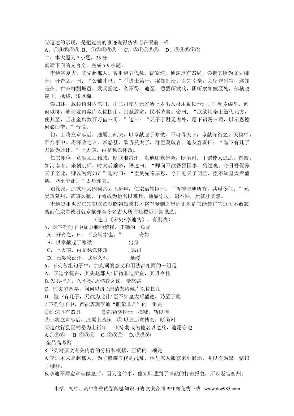 绝密★启用前2009年普通高等学校招生全国统一考试(广东A卷)语文本试卷分第Ⅰ卷(选择题)和第Ⅱ卷(非选择题)两部分。第Ⅰ卷1至4页,第Ⅱ卷5至9页。考试结束后,将本试卷和答题卡一并交回。注意事项1.答题前,考生在答题卡上务必用直径0.5毫米黑色签字笔将自己的姓名、准考证号填写清楚,并帖好条形码。请认真核准条形码的准考证号、姓名和科目。2.每小题选出答案后,用2B铅笔把答题卡上对应题目的答案标号涂黑,如需改动,用橡皮擦干净后,再选涂其他答案标号。在试题卷上作答无效。3.本试卷共10小题,每小题3分,共30分。在每小题给出的四个选项中,只有一项符合要求。一、本大题4小题,每小题3分,共12分。1、下列词语中加点的字,每对读音都不相同的一项是A.赝品/摇曳概况/愤慨咽喉/哽咽B.溯源/夙愿憧憬/瞳孔大厦/厦门C.斟酌/甄别荟萃/猝然模样/楷模D.商榷/证券燥热/烦躁降临/降伏2、下面语段中画线的词语,使用不恰当的一项是欣逢您四十华诞,我们谨向您——亲爱的母校,致以热烈的祝贺。四十年来,您培养的莘莘学子,或纵横商海,运筹帷幄,或潜心学界,激扬文字……在个行各业的建设中,总是首当其冲。亲爱的母校,是您厚实的沃土孕育了我们的未来,是您严谨的学风和优良的传统赋予了我们奋发向上的力量,是您把我们这些懵懂少年培养成今天的栋梁之材。A.莘莘学子B..运筹帷幄C.首当其冲D.栋梁之材3、下列句子中,没有语病的一项是A.青少年是上网人群中的主力军,但最近几年,在发达国家中60岁以上的老年人也纷纷“触网”,老年人“网虫”的人数激增。B.据中科院动物研究所初步鉴定,这头金色牦牛是世界上新发现的一种野生动物,并命名为“金丝牦牛”。C.近年来,在秀丽的南粤大地上,拔地而起的九洲城、海南琼苑、风城大厦等一批多功能新型建筑物,令人流连忘返,构思奇特,巧夺天工。D.水果营养丰富,但是它的表面常常粘附着对人体有害的细菌和农药,所以食用水果前应该洗净削皮较为安全。4、根据语境,下列排序最恰当的一项是示现本是佛教用语,指的是佛菩萨应机缘而现种种化身。______。_______。如杜甫《月夜》诗:“今夜鄜月州,闺中只独看。”“闺中只独看”,就是诗人运用示现修辞手法来描绘想象中的情景。________。___________。语言的示现,同追述的示现相反,是把未来的事情说得好像摆在眼前一样。_________。示现作为一种修辞现象,值得我们关注。①修辞学中的示现是指把实际上不见不闻的事物,说得如闻如见的一种修辞手法②至于悬想的示现,则是把想象中的事情说得在眼前一般,同时间的过去未来全然没有关系③后来人们把这一词语用在修辞学中,当作一种辞格的名称④在修辞学中,示现一般分为三类:追述的、预言的和悬想的小学、初中、高中各种试卷真题知识归纳文案合同PPT等免费下载www.doc985.com⑤追述的示现,是把过去的事迹说得仿佛还在眼前一样A.①④⑤②③B.①③④⑤②C.③①④⑤②D.③④⑤①②二、本大题为7小题,35分阅读下面的文言文,完成5-9小题。李迪字复古,其先赵郡人。曾祖避五代乱,徙家濮。迪深厚有器局,尝携其所为文见柳开,开奇之,曰:“公辅才也。”举进士第一,擢知制诰。真宗幸毫,为留守判官,遂知毫州。亡卒群剽城邑,发兵捕之,久不得。迪至,悉罢所发兵,阴听察知贼区处,部勒晓锐士,擒贼,斩以徇。尝归沐,忽传诏对内东门,出三司使马元方所上岁出入材用数以示迪。时频岁蝗旱,问何以济,迪请发内藏库以佐国用,则赋敛宽,民不劳矣。帝曰:“朕欲用李士衡代元方,俟其至,当出金帛数百万借三司。”迪曰:“天子于财无内外,愿下诏赐三司,以示恩德何必曰借。”帝悦。初,上将立章献后,迪屡上疏谏,以章献起于寒微,不可母天下,章献深衔之。天禧中,拜给事中。周怀政之诛,帝怒甚,欲责及太子,群臣莫敢言。迪从容奏曰:“陛下有几子乃欲为此计。”上大寤,由是独诛怀政。仁宗即位,章献太后预政,贬寇准雷州,以迪朋党傅会,贬衡州。丁谓使人迫之,谓败,知河南府。来朝京师,时太后垂帘,语迪曰:“卿向不欲吾预国事,殆过矣。今日吾保养天子至此,卿以为何如?”迪对曰:“臣受先帝厚恩,今日见天子明...