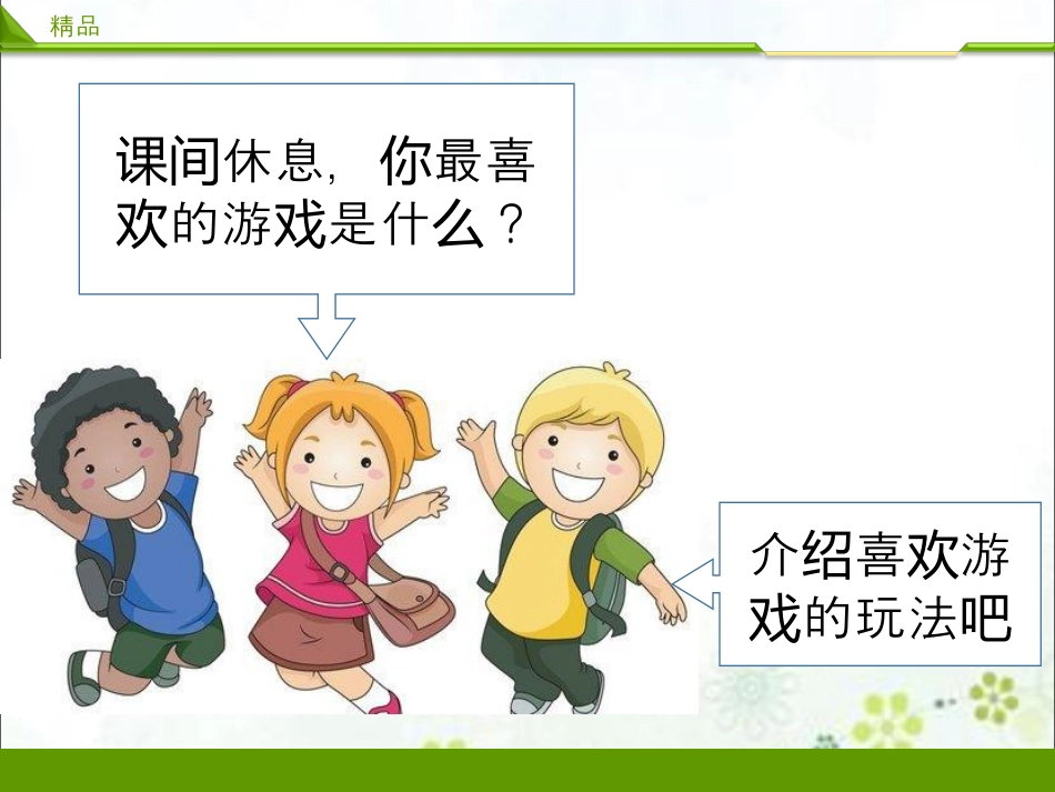 精品精品休息,最喜课间你的游是什?欢戏么介喜游绍欢的玩法戏吧21cnjy精品我喜欢…21cnjy精品平做什游时课间你们还么戏21cnjy精品室外游戏…21cnjy精品室外游戏…21cnjy精品室游内戏…21cnjy精品室游内戏…21cnjy精品去操的起场铃声响些游这戏给我什们带来好?么处精品视频《哦,十分课间钟》精品有意的游义课间能放松我的戏们身心,我感让们受到快!乐精品短,游课间时间戏种多,?类怎么选择有什你么好法?办21cnjy精品定好人数的、易操选择简单作的活动合适的、距离选择教室近的地点21cnjy精品大家在游中遇到戏哪些?问题精品小交流组我解们应该怎样决些?这问题21cnjy精品视频《不插队》精品游要注课间戏意什?么精品遵守游;戏规则不;耍赖不打架,不;吵闹相互合作;注意安全;……21cnjy精品在活,同课间动时只有守秩序、学们守,才能愉快规则又安全。精品每六人,游始后共同站在一队个戏开上,人身体的任何部位,不张报纸个得地;碰成功后再撕去一半,接着再撕报纸去一半……直至失败,最后以最佳法能站最小的。办进报纸队为胜“占地”游玩法及领阵戏规则精品游中有些小?戏哪窍门你玩要注意些什?时么认为这样做好吗21cnjy精品玩完游后想戏你和大家什?说么精品玩游的程中,要戏过学同合作,会与学学会动筋,遵守游,脑戏规则快游!乐戏精品十分,安全心课间钟记中,不追,不打,跑闹烈活不能要,剧动动静合好,文明游结选择戏要牢记!21cnjy