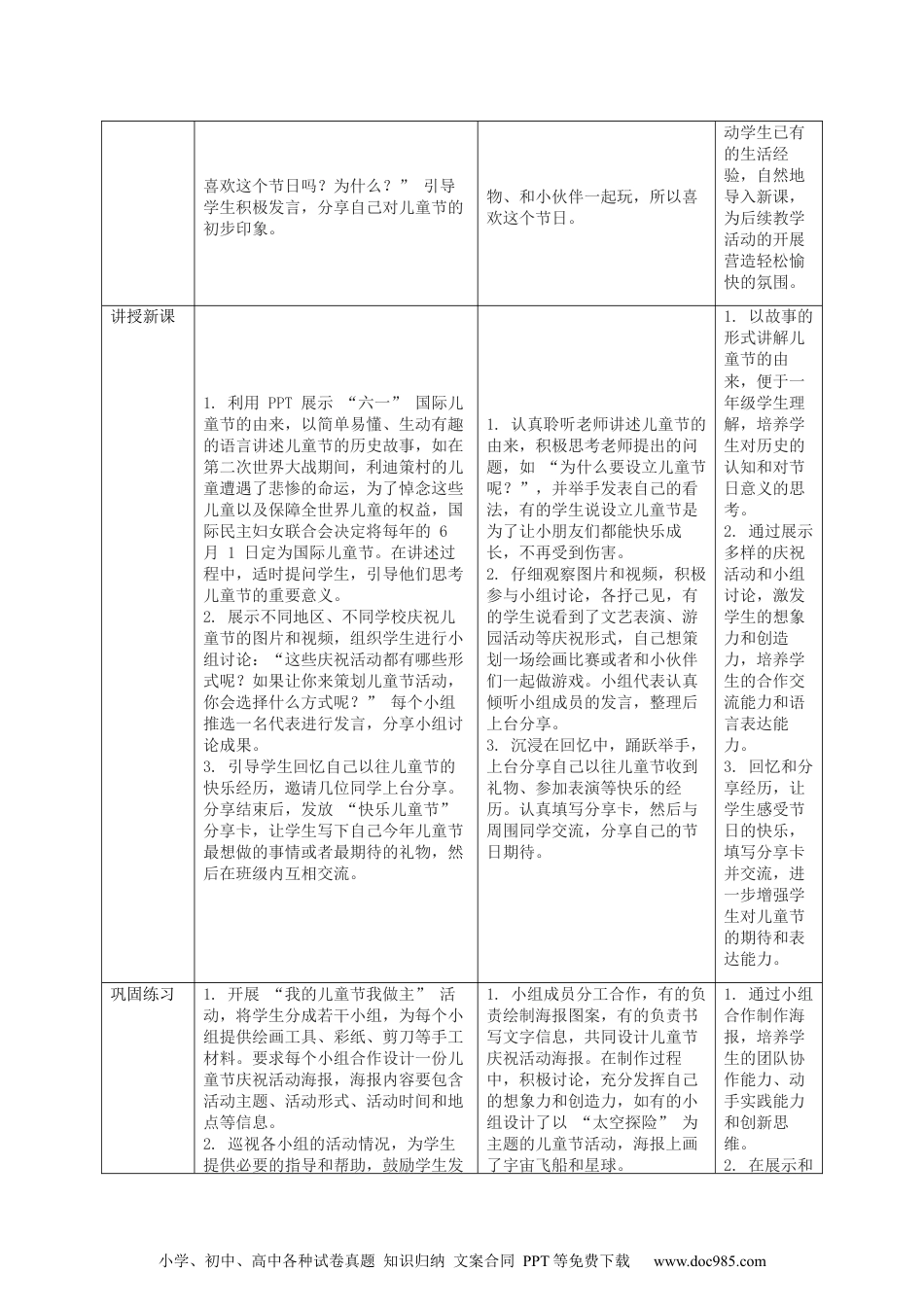 小学、初中、高中各种试卷真题知识归纳文案合同PPT等免费下载www.doc985.com统编版小学道法一年级下册第十三课《快乐儿童节》教学设计祖国的大花朵-:课题快乐儿童节单元争做中国好儿童课时1学情分析一年级学生年龄大多在6-7岁,处于对世界充满好奇、活泼好动的阶段。他们刚刚踏入小学,对集体活动充满热情与期待,且具有较强的表现力和参与欲。对于“儿童节”,学生们已有一定的生活感知,知道这是专属于自己的节日,以往可能参与过庆祝活动,但对儿童节的深层意义、庆祝方式的多样性以及如何在节日中学会分享快乐等方面,理解还较为浅显,需要在课堂上进一步引导和深化。祖国的大花朵-:教材分析《快乐儿童节》是统编版一年级下册道德与法治第四单元“争做中国好儿童”的开篇课。本单元旨在培养学生的家国情怀和社会责任感,引导学生树立正确的价值观,努力成为祖国的优秀建设者。而本课聚焦“儿童节”这一特殊节日,通过让学生参与儿童节庆祝活动的准备、分享节日中的快乐经历以及感受社会各界的关怀,帮助学生了解儿童节的意义,激发学生热爱生活、感恩社会的情感,同时为后续课程中培养学生的社会担当意识奠定基础,在整个单元中起着重要的引领和铺垫作用。祖国的大花朵-:教学目标1.知识与技能目标:学生能清晰了解“六一”国际儿童节的由来和意义,掌握一些常见的儿童节庆祝方式,提高语言表达和组织活动的初步能力。2.过程与方法目标:通过讨论、分享、策划等活动,培养学生的合作交流能力、创新思维和解决问题的能力,让学生在活动中学会表达自己的想法和感受。3.情感态度与价值观目标:激发学生对儿童节的喜爱之情,增强学生的幸福感和归属感,引导学生学会感恩社会各界的关怀,培养学生热爱祖国、关爱他人的良好品质。重点1.深入理解“六一”国际儿童节的意义,感受节日带来的快乐氛围。2.积极参与儿童节庆祝活动的策划与分享,学会表达自己在节日中的快乐体验。难点引导学生从节日的快乐体验中,体会到社会各界对少年儿童的关爱,培养感恩意识和社会责任感。教学准备1.教师准备:收集“六一”国际儿童节的历史资料、庆祝活动图片和视频,制作成生动有趣的教学PPT;准备绘画工具、彩纸、剪刀等手工材料,用于课堂活动;设计“快乐儿童节”分享卡,让学生记录自己的节日计划或快乐经历。2.学生准备:提前询问家长自己以往儿童节的庆祝方式,回忆印象深刻的儿童节场景;准备一件自己喜欢的小礼物,用于课堂分享活动。教学过程教学环节教师活动学生活动设计意图导入新课1.播放一段充满欢乐氛围的儿童节庆祝视频,视频中包含孩子们唱歌、跳舞、做游戏等场景,同时播放欢快的儿童歌曲作为背景音乐。2.视频播放结束后,提问学生:“小朋友们,在刚才的视频里你们看到了什么呀?这是什么节日呢?你们1.认真观看视频,被视频中的欢乐场景所吸引,随着音乐不自觉地摇摆身体。2.思考老师的问题,纷纷举手回答,有的学生说看到了小朋友们在表演节目,知道这是儿童节,因为儿童节可以收到礼通过播放欢快的视频和提问,迅速抓住学生的注意力,激发学生的学习兴趣,调小学、初中、高中各种试卷真题知识归纳文案合同PPT等免费下载www.doc985.com喜欢这个节日吗?为什么?”引导学生积极发言,分享自己对儿童节的初步印象。物、和小伙伴一起玩,所以喜欢这个节日。动学生已有的生活经验,自然地导入新课,为后续教学活动的开展营造轻松愉快的氛围。讲授新课1.利用PPT展示“六一”国际儿童节的由来,以简单易懂、生动有趣的语言讲述儿童节的历史故事,如在第二次世界大战期间,利迪策村的儿童遭遇了悲惨的命运,为了悼念这些儿童以及保障全世界儿童的权益,国际民主妇女联合会决定将每年的6月1日定为国际儿童节。在讲述过程中,适时提问学生,引导他们思考儿童节的重要意义。2.展示不同地区、不同学校庆祝儿童节的图片和视频,组织学生进行小组讨论:“这些庆祝活动都有哪些形式呢?如果让你来策划儿童节活动,你会选择什么方式呢?”每个小组推选一名代表进行发言,分享小组讨论成果。3.引导学生回忆自己以往儿童节的快乐经历,邀请几位同学上台分享。分享结束后,发放“快乐儿童节”分...