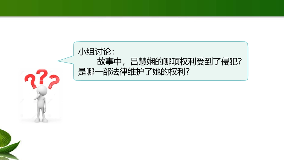9知法守法依法维权第一课时六年级上册第四单元六年级上册第四单元《《法律保护我们健康成长法律保护我们健康成长》》活动一:用法律维护权利阅读角小组讨论:故事中,吕慧娴的哪项权利受到了侵犯?是哪一部法律维护了她的权利?为了更好地保护未成年人的合法权利,处罚侵害未成年人的违法行为,我国制定了专门保护未成年人的法律,并在其他一些法律中规定了保护未成年人的特别条款。同时,作为公民,未成年人的一般权利也受到法律的同等保护。知晓法律,学好法律,用好法律,才能依法维护权利。未成年人的权利大致有以下24种:发展权隐私权受保护权生命健康权人身自由权姓名权受保护权参与权受教育权刑事豁免权肖像权荣誉权财产所有权著作权专利权批评建议申诉控告检举权取得国家赔偿权宗教信仰自由权通信自由通信秘密权想一想:吕慧娴的建议正确吗?你还有其他建议吗?张彤的爸爸被施工队拖欠工资,吕慧娴建议张彤的爸爸依《劳动法》申请劳动仲裁。王晓蒙和妈妈在小区散步时被一条没拴狗链的狗咬伤,吕慧娴建议他和家长依《侵权责任法》向狗的主人索赔。何洁上街购物时,被人偷走钱包,吕慧娴建议她依《治安管理处罚法》向公安局报案。刘文娟的叔叔对交警作出的罚款决定不服,吕慧娴建议他依《行政诉讼法》向法院提起行政诉讼。与同桌交流,你在生活中亲身经历或看到听到的类似事件,是如何处理的?常见的司法方式仲裁私力救济报案诉讼公民享有人身权、财产权、选举权和被选举权、受教育权以及参与经济、文化、社会生活等各项权利。宪法、民法、刑法、行政法等各部门法,从各个角度、各个方面,对公民的权利进行全方位的保护。在公民权利受到侵害时,应当运用相应的法律维护自身权利。专门保护未成年人的特别权利的法律有:《未成年人保护法》和《预防未成年人犯罪法》。另外:《宪法》《刑法》《刑事诉讼法》《民法通则》《治安管理处罚法》《禁毒法》《未成年人保护法》等等,都有保护未成年人的法律条款。活动二:寻找未成年人的专门保护林某是厦门某公司的高层,经营一家劳务派遣公司。去年,他事业遭遇波折,听信风水先生言论,认为抚摸少女私处可以转手气。于是,去年5月,他守在厦门某小学校门口,采用哄骗等手段将一名年仅10岁的小女生带至附近老式住宅的楼梯内,摸脸、摸头、抱腰,拉开女孩裤子,摸弄隐私部位。之后,他如法炮制,猥亵另外两名小女生(分别为9岁、10岁)。案发后,林某被公安机关抓获归案,他对猥亵女学生的事供认不讳。经过审理,去年12月,林某因犯猥亵儿童罪,被法院判处有期徒刑三年。全班交流:日常生活中,你还见到过哪些涉及未成年人权利保护的情形?赵志刚的姑姑怀孕了,喜欢安静的环境。可是,小区外面的广场上,每天都有一些跳“广场舞”的人把音箱的音量开得特别大。早上六点多,第一拨广场舞开始了;而晚上的舞蹈,则从八点一直持续到十点多。赵志刚的姑姑早晚都不能好好休息。赵志刚的姑父多次找跳舞的人交涉,他们却说:“广场又不是你家的,跳舞健身是我们的权利,你管得着吗?”周末,赵志刚的姑父邀请了同样备受噪声困扰的邻居和赵志刚的爸爸等亲戚商量应该怎么办。活动三:在法律范围内维护权利活动园做法1:把他们的音箱砸了,揍他们一顿,他们就老实了。做法2:实在没人管,咱们也买个音箱,开大音量跟他们对着干。做法3:在广场上抛撒垃圾,把他们赶走。讨论一下,上面的做法合法吗?如果你是赵志刚,应该建议家人怎么做?把你想到的合法的做法写出来。法律是保护我们权利的最有效、最有力的手段。当权利受到侵害时,我们应当运用法律手段依法维权,而不能用违法方式维权。“运用法律维权益,以暴制暴不可取。”同时,权利的行使和保护也有边界。权利人应当在法律的范围内行使和保护权利,而不能超越法律范围滥用权利,超越法律的诉求得不到法律的支持。课后拓展作业:观察生活中有哪些违法的现象,你准备如何解决?谢谢看收