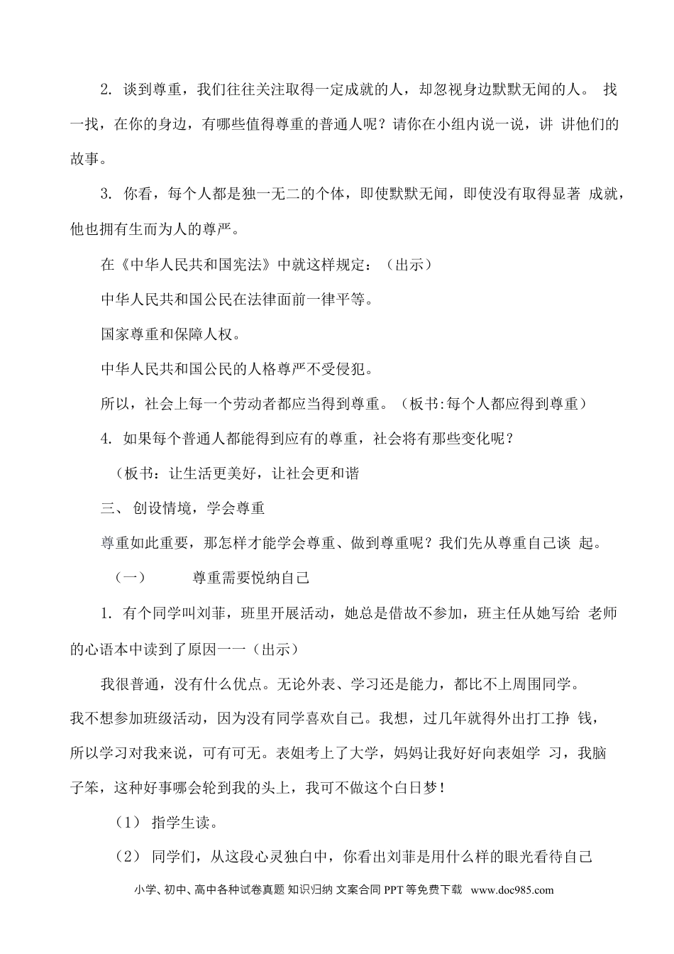 小学、初中、高中各种卷真知文案合同试题识归纳PPT等免下费载www.doc985.com最新部编版六年级道德与法治下册全册教学设计第一单元完善自我健康成长1学会尊重2学会宽容3学会反思第二单元爱护地球共同责任4地球——我们的家园5应对自然灾害第三单元多样文明多彩生活6探访古代文明7多元文化多样魅力第四单元让世界更美好8科技发展造福人类9日益重要的国际组织10我们爱和平第一单元完善自我健康成长1.学会尊重教学目标:1.知道尊重的意义及作用,了解相关的法律法规,学会在生活中要与他人和谐相处必须具备理解他人、设身处地为他人着想的意识和能力。2.在情景模拟和合作学习中了解尊重自己的表现,掌握尊重他人的方法一一推己及人。3.通过学习,使学生养成尊重他人、尊重自己的良好品质,养成事事处处多为小学、初中、高中各种卷真知文案合同试题识归纳PPT等免下费载www.doc985.com他人着想的行为习惯,真正做到互相尊重。教学重难点:教学重点:通过学习,让学生明白尊重无处不在,并在学习活动中培养学生尊重自己、尊重他人的意识和品质。教学难点:在活动中让学生掌握尊重别人的方法,将尊重的方法运用到实际生活之中。教学准备:课件课时安排:2课时教学过程:第一课时一、谈话导入,了解尊重1.同学们,这是拍摄于2017年11月的一张新闻图片,在这张图片中你看到了谁?2.今天这堂课我们就从发生这一张照片背后的故事说起。(播放视频)3.习爷爷“挪椅子,扶老人,坐身边;这一连串动作持续刷屏,让网友们直呼“太帅了”。从习爷爷让座,你读到了什么?4.这不是简单的“你请我让二而是一种直击人心的精神力量,它的名字叫“尊重”。(板书:学会尊重)二、联系生活,畅谈尊重1.坐在习爷爷身边的,一个是报效祖国的科学家,一个是服务百姓的老党员,他们数十年如一日,勤勉工作,在各自岗位上散发光和热,赢得了大家的尊重。在你心中,哪些人是值得我们尊重的呢?为什么?小学、初中、高中各种卷真知文案合同试题识归纳PPT等免下费载www.doc985.com2.谈到尊重,我们往往关注取得一定成就的人,却忽视身边默默无闻的人。找一找,在你的身边,有哪些值得尊重的普通人呢?请你在小组内说一说,讲讲他们的故事。3.你看,每个人都是独一无二的个体,即使默默无闻,即使没有取得显著成就,他也拥有生而为人的尊严。在《中华人民共和国宪法》中就这样规定:(出示)中华人民共和国公民在法律面前一律平等。国家尊重和保障人权。中华人民共和国公民的人格尊严不受侵犯。所以,社会上每一个劳动者都应当得到尊重。(板书:每个人都应得到尊重)4.如果每个普通人都能得到应有的尊重,社会将有那些变化呢?(板书:让生活更美好,让社会更和谐三、创设情境,学会尊重尊重如此重要,那怎样才能学会尊重、做到尊重呢?我们先从尊重自己谈起。(一)尊重需要悦纳自己1.有个同学叫刘菲,班里开展活动,她总是借故不参加,班主任从她写给老师的心语本中读到了原因一一(出示)我很普通,没有什么优点。无论外表、学习还是能力,都比不上周围同学。我不想参加班级活动,因为没有同学喜欢自己。我想,过几年就得外出打工挣钱,所以学习对我来说,可有可无。表姐考上了大学,妈妈让我好好向表姐学习,我脑子笨,这种好事哪会轮到我的头上,我可不做这个白日梦!(1)指学生读。(2)同学们,从这段心灵独白中,你看出刘菲是用什么样的眼光看待自己小学、初中、高中各种卷真知文案合同试题识归纳PPT等免下费载www.doc985.com的?(3)你觉得刘菲是一个尊重自己的人吗?为什么?(4)你有什么好建议能帮助刘菲走出困境,让她发现更好的自己吗?请在小组内轻声讨论讨论,给她留言。(5)小结并板书:是啊,人生的舞台中,没有人天生高贵,也没有人生来平庸,每个人都是人生的主角,你有你的辉煌,我也有我的亮点。悦纳自己才能吸引别人,尊重自己才能赢得他人的尊重。(板书:悦纳自己)2.除此之外,尊重自己还有哪些表现呢?(1)小组讨论。(2)交流板书:维护形象、爱惜名誉、信守承诺。(二)尊重需要适度维护1.说到这“维护形象在我们生活中,会遇到一些“好脾气”先生。他们非常注重维护自己的形象,永...