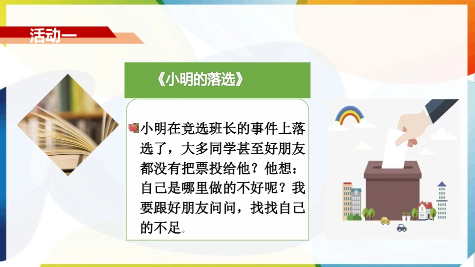 第1课时道德与法治六年级下册CONTENTSPAGE《老师的一次难忘经历》想一想:老师在回忆这次难忘的经历后,有什么感受?或者收获?你有没有跟老师一样的行为?有时候会去回忆一些发生过事情,事后总能有所收获的?把你小学阶段印象最深刻的一件事分享给大家听一听?活动一小明在竞选班长的事件上落选了,大多同学甚至好朋友都没有把票投给他?他想:自己是哪里做的不好呢?我要跟好朋友问问,找找自己的不足。活动一小梅在学校举办的舞蹈比赛中,没有取得理想的名次,回到家就特别沮丧,“失败的场景”就像过电影一样一遍遍的出现在脑海里,她觉得自我反思一点不开心。活动一小伟头一次离开父母去参加夏令营活动,各种生活问题难住了他,他才发现自己有很多事情都不会做,而好多同学就比自己懂得多,决心以后要多锻炼自己的独立生活能力。活动一小强特痴迷于网络游戏,每次从网吧回来都不断“反思”,怎么又为什么没有通关?是不是我练习的不够好?还是队友太弱了,下次不跟这些猪队友玩了。教学分析小明落选后的反思对他今后的学习有什么好处?针对小梅比赛失败后的纠结,你有什么话想对她说?小伟的经历你有过吗?谈谈你当时的心境?小强的行为是在反思吗?作为小强的同学,给他提些建议吧?活动二反思反思:回头,反过来思考的意思。思考过去的事情,从中总结经验教训。它的反义词——痴迷。近义词——反省。反思过去——总结经验——用于成长(它的作用是积极的,引导人们不断纠正错误和不足,不断进步的!)活动三〖译文〗曾子说:“我每天多次反省自己:替别人做事有没有尽心竭力?和朋友交往有没有诚信?老师传授的知识有没有按时温习?活动三活动四撰写一篇心得体会,以“反思可以让我……”为题撰写一篇心得体会,以“反思可以让我……”为题回忆最近的一次班级活动,介绍你在活动中的表现,反思有什么不足之处?哪些同学做得值得你学习?静坐常思己过莫人非闲谈论课后搜集名人善于反思的故事,下节课进行交流