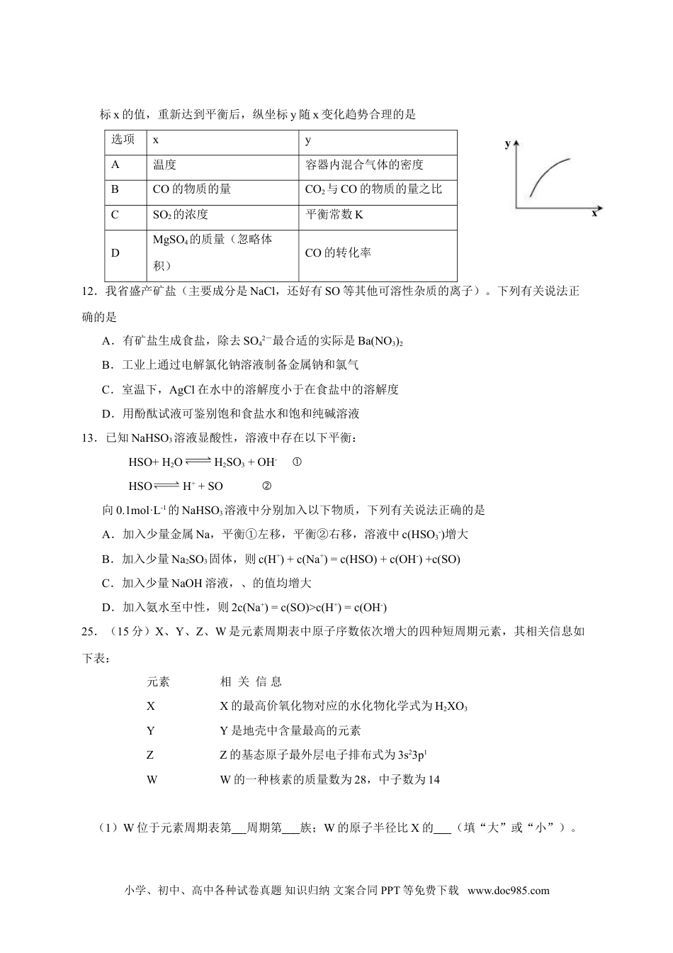 7.我国科学家研制出一中催化剂,能在室温下高效催化空气中甲醛的氧化,其反应如下:HCHO+O2————→CO2+H2O。下列有关说法正确的是A.该反应为吸热反应B.CO2分子中的化学键为非极性键C.HCHO分子中既含σ键又含π键D.每生成1.8gH2O消耗2.24LO28.实验室中某些气体的制取、收集及尾气处理装置如图所示(省略夹持和净化装置)。仅用此装置和表中提供的物质完成相关实验,最合理的选项是选项a中的物质b中的物质c中收集的气体d中的物质A浓氨水CaONH3H2OB浓硫酸Na2SO3SO2NaOH溶液C稀硝酸CuNO2H2OD浓盐酸MnO2Cl2NaOH溶液9.下列分子或离子在指定的分散系中能大量共存的一组是A.银氨溶液:Na+、K+、NO3-、NH3·H2OB.空气:C2H2、CO2、SO2、NOC.氢氧化铁胶体:H+、K+、S2-、Br-D.高锰酸钾溶液:H+、Na+、SO42-、葡萄糖分子10.热激活电池可用作火箭、导弹的工作电源。一种热激活电池的基本结构如图所示,其中作为电解质的无水LiCl-KCl混合物受热熔融后,电池即可瞬间输出电能。该电池总反应为:PbSO4+2LiCl+Ca=CaCl2+Li2SO4+Pb。下列有关说法正确的是A.正极反应式:Ca+2Cl--2e-=CaCl2B.放电过程中,Li+向负极移动C.没转移0.1mol电子,理论上生成20.7gPbD.常温时,在正负极间接上电流表或检流计,指针不偏转11.一定条件下,通过下列反应可以制备特种陶瓷的原料MgO,MgSO3(s)+CO(g)MgO(s)+CO2(g)+SO2(g)H>0△。该反应在恒容的密闭容器中达到平衡后,若仅改变图中横坐小学、初中、高中各种试卷真题知识归纳文案合同PPT等免费下载www.doc985.com标x的值,重新达到平衡后,纵坐标y随x变化趋势合理的是选项xyA温度容器内混合气体的密度BCO的物质的量CO2与CO的物质的量之比CSO2的浓度平衡常数KDMgSO4的质量(忽略体积)CO的转化率12.我省盛产矿盐(主要成分是NaCl,还好有SO等其他可溶性杂质的离子)。下列有关说法正确的是A.有矿盐生成食盐,除去SO42-最合适的实际是Ba(NO3)2B.工业上通过电解氯化钠溶液制备金属钠和氯气C.室温下,AgCl在水中的溶解度小于在食盐中的溶解度D.用酚酞试液可鉴别饱和食盐水和饱和纯碱溶液13.已知NaHSO3溶液显酸性,溶液中存在以下平衡:HSO+H2OH2SO3+OH-①HSOH++SO②向0.1mol·L-1的NaHSO3溶液中分别加入以下物质,下列有关说法正确的是A.加入少量金属Na,平衡①左移,平衡②右移,溶液中c(HSO3-)增大B.加入少量Na2SO3固体,则c(H+)+c(Na+)=c(HSO)+c(OH-)+c(SO)C.加入少量NaOH溶液,、的值均增大D.加入氨水至中性,则2c(Na+)=c(SO)>c(H+)=c(OH-)25.(15分)X、Y、Z、W是元素周期表中原子序数依次增大的四种短周期元素,其相关信息如下表:元素相关信息XX的最高价氧化物对应的水化物化学式为H2XO3YY是地壳中含量最高的元素ZZ的基态原子最外层电子排布式为3s23p1WW的一种核素的质量数为28,中子数为14(1)W位于元素周期表第周期第族;W的原子半径比X的(填“大”或“小”)。小学、初中、高中各种试卷真题知识归纳文案合同PPT等免费下载www.doc985.comyx(2)Z的第一电离能比W的(填“大”或“小”);XY2由固态变为气态所需克服的微粒间作用力是;氢元素、X、Y的原子可共同形成多种分子,写出其中一种能形成同种分子间氢键的物质名称。(3)振荡下,向Z单质与盐酸反应后的无色溶液中滴加NaOH溶液直至过量,能观察到的现象是;W的单质与氢氟酸反应生成两种无色气体,该反应的化学方程式是。(4)在25℃、101Kpa下,已知13.5g的Z固体单质在Y2气体中完全燃烧后恢复至原状态,放热419KJ,该反应的热化学方程式是。26.(16分)有机物F是一种新型涂料固化剂,可由下列路线合成(部分反应条件略去):(1)B的结构简式是;E中含有的官能团名称是。(2)由C和E合成F的化学方程式是。(3)同时满足下列条件的苯的同分异构体的结构简式是。①含有3个双键;②核磁共振氢谱只显示1个吸收峰;③不存在甲基。(4)乙烯在实验室可由(填有机物名称)通过(填反应堆类型)制备。(5)下列说法正确的是。a.A属于饱和烃b.D与乙醛的分子式相同c.E不能与盐酸反应d.F可以发生酯化反应27.(13分)二氧化铈(CeO2)是一种重要的稀土氧化物。平板电视显...