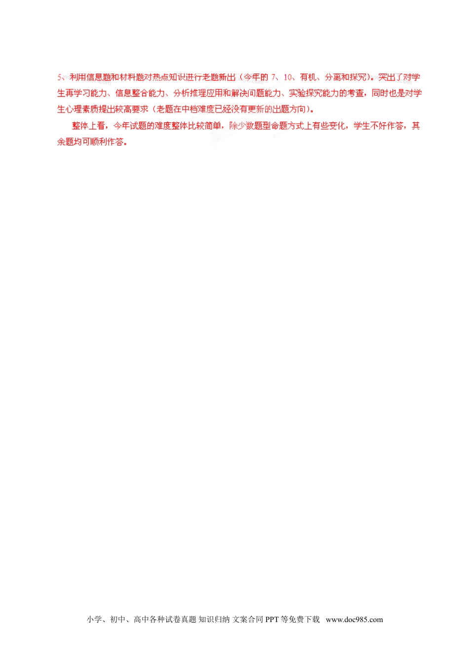 小学、初中、高中各种试卷真题知识归纳文案合同PPT等免费下载www.doc985.com小学、初中、高中各种试卷真题知识归纳文案合同PPT等免费下载www.doc985.com【试题详解、详析】7.我国科学家研制出一中催化剂,能在室温下高效催化空气中甲醛的氧化,其反应如下:HCHO+O2————→CO2+H2O。下列有关说法正确的是A.该反应为吸热反应B.CO2分子中的化学键为非极性键C.HCHO分子中既含σ键又含π键D.每生成1.8gH2O消耗2.24LO28.实验室中某些气体的制取、收集及尾气处理装置如图所示(省略夹持和净化装置)。仅用此装置和表中提供的物质完成相关实验,最合理的选项是选项a中的物质b中的物质c中收集的气体d中的物质A浓氨水CaONH3H2OB浓硫酸Na2SO3SO2NaOH溶液C稀硝酸CuNO2H2OD浓盐酸MnO2Cl2NaOH溶液9.下列分子或离子在指定的分散系中能大量共存的一组是A.银氨溶液:Na+、K+、NO3-、NH3·H2OB.空气:C2H2、CO2、SO2、NOC.氢氧化铁胶体:H+、K+、S2-、Br-D.高锰酸钾溶液:H+、Na+、SO42-、葡萄糖分子小学、初中、高中各种试卷真题知识归纳文案合同PPT等免费下载www.doc985.com10.热激活电池可用作火箭、导弹的工作电源。一种热激活电池的基本结构如图所示,其中作为电解质的无水LiCl-KCl混合物受热熔融后,电池即可瞬间输出电能。该电池总反应为:PbSO4+2LiCl+Ca=CaCl2+Li2SO4+Pb。下列有关说法正确的是A.正极反应式:Ca+2Cl--2e-=CaCl2B.放电过程中,Li+向负极移动C.没转移0.1mol电子,理论上生成20.7gPbD.常温时,在正负极间接上电流表或检流计,指针不偏转11.一定条件下,通过下列反应可以制备特种陶瓷的原料MgO,MgSO3(s)+CO(g)MgO(s)+CO2(g)+SO2(g)H>0△。该反应在恒容的密闭容器中达到平衡后,若仅改变图中横坐标x的值,重新达到平衡后,纵坐标y随x变化趋势合理的是选项xyA温度容器内混合气体的密度BCO的物质的量CO2与CO的物质的量之比CSO2的浓度平衡常数KDMgSO4的质量(忽略体积)CO的转化率小学、初中、高中各种试卷真题知识归纳文案合同PPT等免费下载www.doc985.comyx12.我省盛产矿盐(主要成分是NaCl,还好有SO等其他可溶性杂质的离子)。下列有关说法正确的是A.有矿盐生成食盐,除去SO42-最合适的实际是Ba(NO3)2B.工业上通过电解氯化钠溶液制备金属钠和氯气C.室温下,AgCl在水中的溶解度小于在食盐中的溶解度D.用酚酞试液可鉴别饱和食盐水和饱和纯碱溶液13.已知NaHSO3溶液显酸性,溶液中存在以下平衡:HSO+H2OH2SO3+OH-①HSOH++SO②向0.1mol·L-1的NaHSO3溶液中分别加入以下物质,下列有关说法正确的是A.加入少量金属Na,平衡①左移,平衡②右移,溶液中c(HSO3-)增大B.加入少量Na2SO3固体,则c(H+)+c(Na+)=c(HSO)+c(OH-)+c(SO)C.加入少量NaOH溶液,、的值均增大D.加入氨水至中性,则2c(Na+)=c(SO)>c(H+)=c(OH-)小学、初中、高中各种试卷真题知识归纳文案合同PPT等免费下载www.doc985.com25.(15分)X、Y、Z、W是元素周期表中原子序数依次增大的四种短周期元素,其相关信息如下表:元素相关信息XX的最高价氧化物对应的水化物化学式为H2XO3YY是地壳中含量最高的元素ZZ的基态原子最外层电子排布式为3s23p1WW的一种核素的质量数为28,中子数为14(1)W位于元素周期表第周期第族;W的原子半径比X的(填“大”或“小”)。(2)Z的第一电离能比W的(填“大”或“小”);XY2由固态变为气态所需克服的微粒间作用力是;氢元素、X、Y的原子可共同形成多种分子,写出其中一种能形成同种分子间氢键的物质名称。(3)振荡下,向Z单质与盐酸反应后的无色溶液中滴加NaOH溶液直至过量,能观察到的现象是;W的单质与氢氟酸反应生成两种无色气体,该反应的化学方程式是。(4)在25℃、101Kpa下,已知13.5g的Z固体单质在Y2气体中完全燃烧后恢复至原状态,放热419KJ,该反应的热化学方程式是。小学、初中、高中各种试卷真题知识归纳文案合同PPT等免费下载www.doc985.com26.(16分)有机物F是一种新型涂料固化剂,可由下列路线合成(部分反应条件略去):(1)B的结构简式是;E中含有的官能团名称是。(2)由C和E合成F的化学方程式是。(3)同时满足下列条件的苯的同分...