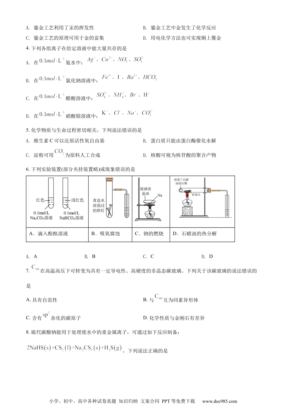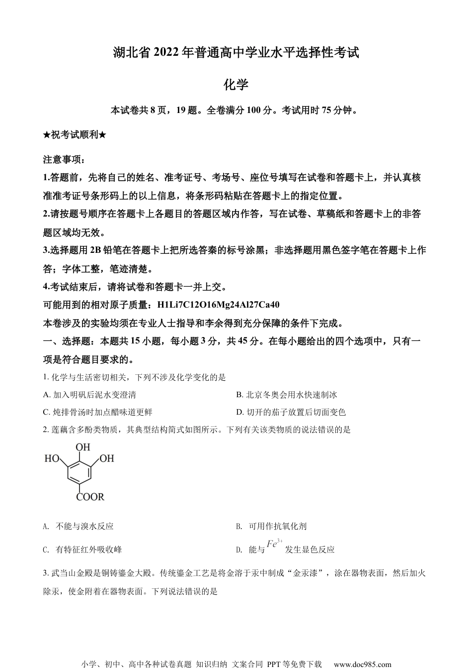 小学、初中、高中各种试卷真题知识归纳文案合同PPT等免费下载www.doc985.com湖北省2022年普通高中学业水平选择性考试化学本试卷共8页,19题。全卷满分100分。考试用时75分钟。★祝考试顺利★注意事项:1.答题前,先将自己的姓名、准考证号、考场号、座位号填写在试卷和答题卡上,并认真核准准考证号条形码上的以上信息,将条形码粘贴在答题卡上的指定位置。2.请按题号顺序在答题卡上各题目的答题区域内作答,写在试卷、草稿纸和答题卡上的非答题区域均无效。3.选择题用2B铅笔在答题卡上把所选答秦的标号涂黑;非选择题用黑色签字笔在答题卡上作答;字体工整,笔迹清楚。4.考试结束后,请将试卷和答题卡一并上交。可能用到的相对原子质量:H1Li7C12O16Mg24Al27Ca40本卷涉及的实验均须在专业人士指导和李余得到充分保障的条件下完成。一、选择题:本题共15小题,每小题3分,共45分。在每小题给出的四个选项中,只有一项是符合题目要求的。1.化学与生活密切相关,下列不涉及化学变化的是A.加入明矾后泥水变澄清B.北京冬奥会用水快速制冰C.炖排骨汤时加点醋味道更鲜D.切开的茄子放置后切面变色2.莲藕含多酚类物质,其典型结构简式如图所示。下列有关该类物质的说法错误的是A.不能与溴水反应B.可用作抗氧化剂C.有特征红外吸收峰D.能与发生显色反应3.武当山金殿是铜铸鎏金大殿。传统鎏金工艺是将金溶于汞中制成“金汞漆”,涂在器物表面,然后加火除汞,使金附着在器物表面。下列说法错误的是小学、初中、高中各种试卷真题知识归纳文案合同PPT等免费下载www.doc985.comA.鎏金工艺利用了汞的挥发性B.鎏金工艺中金发生了化学反应C.鎏金工艺的原理可用于金的富集D.用电化学方法也可实现铜上覆金4.下列各组离子在给定溶液中能大量共存的是A.在氨水中:B.在氯化钠溶液中:C.在醋酸溶液中:D.在硝酸银溶液中:5.化学物质与生命过程密切相关,下列说法错误的是A.维生素C可以还原活性氧自由基B.蛋白质只能由蛋白酶催化水解C.淀粉可用为原料人工合成D.核酸可视为核苷酸的聚合产物6.下列实验装置(部分夹持装置略)或现象错误的是A.滴入酚酞溶液B.吸氧腐蚀C.钠的燃烧D.石蜡油的热分解A.AB.BC.CD.D7.在高温高压下可转变为具有一定导电性、高硬度的非晶态碳玻璃。下列关于该碳玻璃的说法错误的是A.具有自范性B.与互为同素异形体C.含有杂化的碳原子D.化学性质与金刚石有差异8.硫代碳酸钠能用于处理废水中的重金属离子,可通过如下反应制备:,下列说法正确的是小学、初中、高中各种试卷真题知识归纳文案合同PPT等免费下载www.doc985.comA.不能被氧化B.溶液显碱性C.该制备反应是熵减过程D.的热稳定性比的高9.某立方卤化物可用于制作光电材料,其晶胞结构如图所示。下列说法错误的是A.的配位数为6B.与距离最近的是C.该物质的化学式为D.若换为,则晶胞棱长将改变10.和的电荷与半径之比相近,导致两元素性质相似。下列说法错误的是A.与都能在水中与氨形成配合物B.和的熔点都比的低C.和均可表现出弱酸性D.和的氢化物都不能在酸中稳定存在11.磷酰三叠氮是一种高能分子,结构简式为。下列关于该分子的说法正确的是A.为非极性分子B.立体构型为正四面体形C.加热条件下会分解并放出D.分解产物的电子式为12.根据酸碱质子理论,给出质子的物质是酸,给出质子的能力越强,酸性越强。已知:,,下列酸性强弱顺序正确的是小学、初中、高中各种试卷真题知识归纳文案合同PPT等免费下载www.doc985.comA.B.C.D.13.同位素示踪是研究反应机理的重要手段之一、已知醛与在酸催化下存在如下平衡:。据此推测,对羟基苯甲醛与10倍量的在少量酸催化下反应,达到平衡后,下列化合物中含量最高的是A.B.C.D.14.含磷有机物应用广泛。电解法可实现由白磷直接制备,过程如图所示(为甲基)。下列说法正确的是A.生成,理论上外电路需要转移电子B.阴极上的电极反应为:C.在电解过程中向铂电极移动D.电解产生的中的氢元素来自于15.下图是亚砷酸和酒石酸混合体系中部分物种的图小学、初中、高中各种试卷真题知识归纳文案合同PPT等免费下载www.doc985.com(浓度:总为,总T为)。下列说法错误的是A.的为B.的酸性比的强C.时,的浓度比的高D.时,...