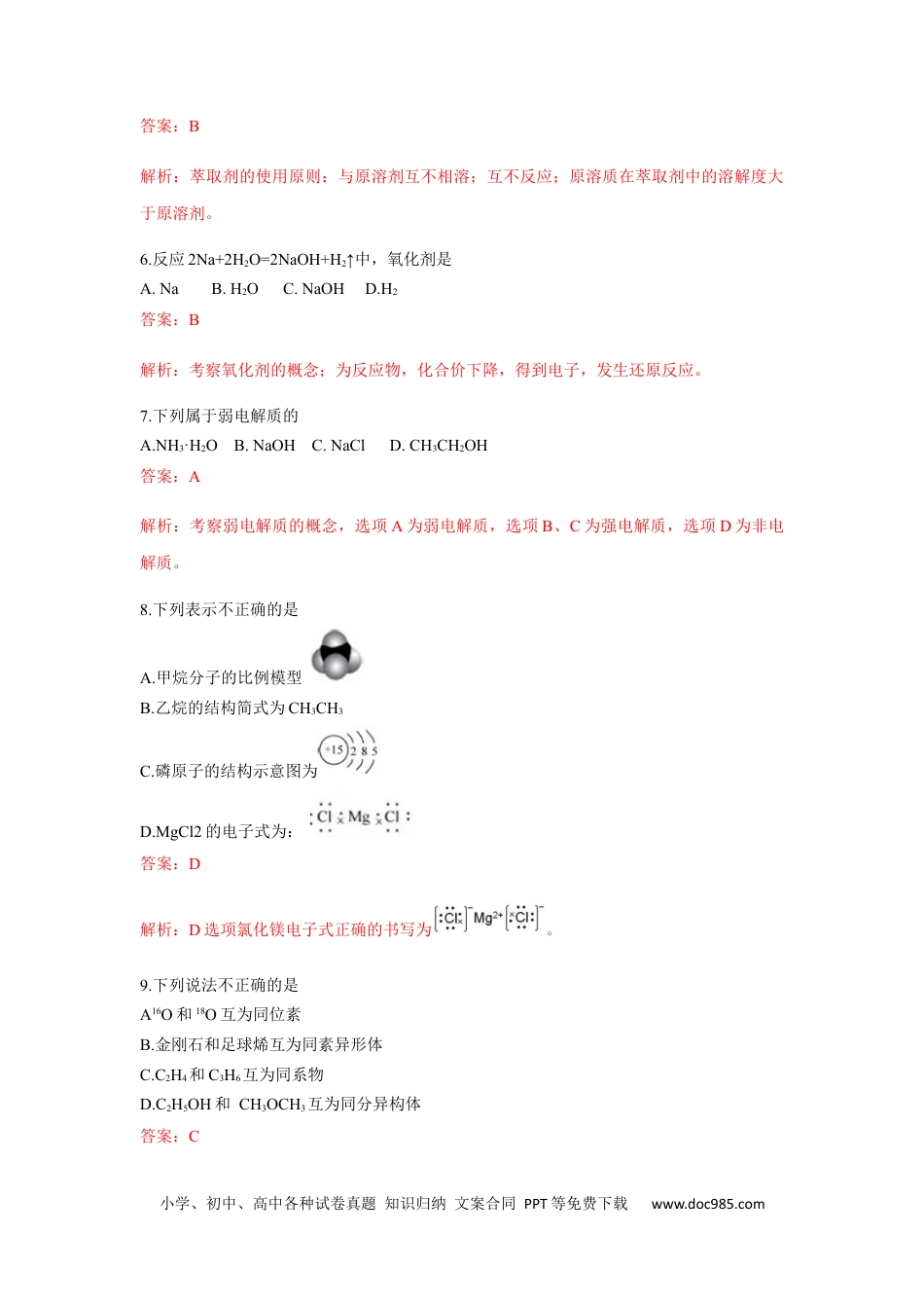 小学、初中、高中各种试卷真题知识归纳文案合同PPT等免费下载www.doc985.com2019年1月浙江省学业水平测试化学试卷可能用到的相对原子质量:H1C12O16Na23S32Fe6Cu64Ba137一、选择题(本大题共25小题,每小题2分,共50分。每小题列出的四个备选项中只有一个是符合题目要求的,不选、多选、错选均不得分)1.水的分子式是A.H2BO2CH2ODCO2答案:C解析:考察物质的分子式。2.根据物质的组成与性质进行分类,MgO属于A.氧化物B.酸C碱D.盐答案:A解析:考察物质的分类。3.仪器名称为“胶头滴管”的是答案:D解析:考察仪器的名称,四个选项分别为分液漏斗、干燥管、冷凝管、胶头滴管。4.冰毒有剧毒,人体摄入后将严重损害心脏、大脑组织甚至导致死亡,严禁吸食。它的分子式为C10H11N,其中的氮元素在周期表中处于A.第ⅡA族B.第ⅢA族C.第ⅣA族C.第VA族答案:D解析:氮元素为7号元素,为第二周期ⅤA族。5.萃取碘水中的碘单质,可作萃取剂的是A.水B四氯化碳C.酒精D.食醋小学、初中、高中各种试卷真题知识归纳文案合同PPT等免费下载www.doc985.com答案:B解析:萃取剂的使用原则:与原溶剂互不相溶;互不反应;原溶质在萃取剂中的溶解度大于原溶剂。6.反应2Na+2H2O=2NaOH+H2↑中,氧化剂是A.NaB.H2OC.NaOHD.H2答案:B解析:考察氧化剂的概念;为反应物,化合价下降,得到电子,发生还原反应。7.下列属于弱电解质的A.NH3·H2OB.NaOHC.NaClD.CH3CH2OH答案:A解析:考察弱电解质的概念,选项A为弱电解质,选项B、C为强电解质,选项D为非电解质。8.下列表示不正确的是A.甲烷分子的比例模型B.乙烷的结构简式为CH3CH3C.磷原子的结构示意图为D.MgCl2的电子式为:答案:D解析:D选项氯化镁电子式正确的书写为。9.下列说法不正确的是A16O和18O互为同位素B.金刚石和足球烯互为同素异形体C.C2H4和C3H6互为同系物D.C2H5OH和CH3OCH3互为同分异构体答案:C小学、初中、高中各种试卷真题知识归纳文案合同PPT等免费下载www.doc985.com解析:考察同系物的概念。结构相似,分子式相差若干个CH2的化合物互称为同系物;乙烷和丙烯结构不相识,不是同系物。10.下列说法不正确的是A.石灰石、纯碱、石英可作为制备水泥的主要原料B.燃煤烟气的脱硫过程可以得到副产品石膏和硫酸铵C.硫酸钡可作高档油漆、油墨、塑料、橡胶的原料及填充剂D.在催化剂作用下,用玉米、高梁为原料经水解和细菌发酵可制得乙醇答案:A解析:石灰石、纯碱、石英为制备玻璃的主要原料。11.四种短周期主族元素X、Y、Z和M在周期表中的位置如图所示。下列说法正确的是A.原子半径(r):r(X)>r(Z)B.元素的非金属性:Y>MC.Y元素的最高化合价为+7价D.Z的最高价氧化物的水化物为强酸答案:B解析:由题意推出X、Y、Z、M分别为C、F、Si、S元素。同主族元素原子半径从上往下依次增大,选项A错误;元素周期表右上角非金属性越强,选项B正确;F元素没有最高正价,选项C错误;Si最高价氧化物对应的水化物为H2SiO3,是弱酸,选项D错误。12.下列方程式不正确的是A.碳与热的浓硫酸反应的化学方程式:C+2H2SO4(浓)CO↑+2SO2↑+2H2OB.乙炔燃烧的化学方程式:2C2H2+5O24CO2+2H2OC.氯化氢在水中的电离方程式:HCl=H++Cl-D.氯化铵水解的离子方程式:NH4++H2O=NH3·H2O+H+答案:A小学、初中、高中各种试卷真题知识归纳文案合同PPT等免费下载www.doc985.com解析:C+2H2SO4CO2↑+2SO2↑+2H2O,生成物为CO2,并不是CO,选项A错误。13.下列实验操作对应的现象不符合事实的是A.用铂丝蘸取NaCl溶液置于酒精灯火焰上灼烧,火焰成黄色B.将少量银氨溶液加入盛有淀粉和硫酸的试管中加热,产生光亮的银镜C.饱和食盐水通电一段时间后,湿润的KI-淀粉试纸遇b处气体变蓝色D.将胆矾晶体悬挂盛有浓H2SO4的密闭试管中蓝色晶体逐渐变为白色答案:B解析:银氨溶液会和硫酸反应,并不会得到光亮的银镜,选项B错误。14.下列说法不正确的是A.苯与溴水、酸性高锰酸钾溶液不反应,说明苯分子中碳碳原子间只存在单键B.煤是由有机物和无机物所组成的复杂的混合物C.天然气的主要成分是甲烷,甲烷可在高温下分解为炭黑和氢气D.乙烯为不饱和烃,分子中6个原子处于同一平面答案:A解析:苯分子中存在特殊的...