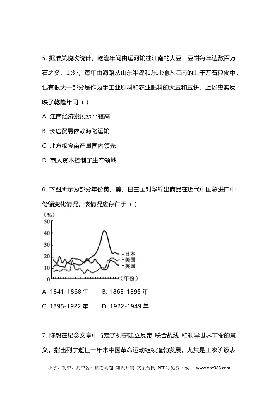 小学、初中、高中各种试卷真题知识归纳文案合同PPT等免费下载www.doc985.com2023年江苏省普通高中学业水平选择性考试历史一、单项选择题:共16题,每小题3分,共48分。每题只有一个选项最符合题意。1.春秋时期,晋国在兼并虞国等同姓方国时,也与无终戎等北方诸戎和好,以免于在同楚国争霸过程中腹背受敌。这一现象表明当时()A.北方诸戎已融入华夏族B.政治权力下移至卿大夫C.楚国吴起变法成效显著D.宗法政治体制遭到破坏2.建安十八年(213),曹操以汉献帝的名义下诏恢复古代九州之制,“省幽、并州,以其郡国并于冀州”,裁撤本为孙权控制的交州。至建安二十四年,将全国州数始终维持在九个。曹操复古改制的实践体现了()注意事项考生在答题前请认真阅读本注意事项及各题答题要求1.本试卷共6页,满分为100分,考试时间为75分钟。考试结束后,请将本试卷和答题卡并交回。2.答题前,请务必将自己的姓名、准考证号用0.5毫米黑色墨水的签字笔填写在试卷及答题卡的规定位置。3.请认真核对监考员在答题卡上所粘贴的条形码上的姓名、准考证号与本人是否相符。4.作答选择题,必须用2B铅笔将答题卡上对应选项的方框涂满、涂黑:如需改动,请用橡皮擦干净后,再选涂其他答案。作答非选择题,必须用0.5毫米黑色墨水的签字笔在答题卡上的指定位置作答,在其他位置作答一律无效。5.如需作图,必须用2B铅笔绘、写清楚,线条、符号等须加黑、加粗。小学、初中、高中各种试卷真题知识归纳文案合同PPT等免费下载www.doc985.comA.魏国在三国中占据优势B.大一统思想的历史传承C.东汉朝廷政令执行通畅D.地方行政层级持续变化3.唐《杂令》规定,公私借贷可自行签订契约,官府不干涉,但利息总量不得超过本金一倍。唐敬宗发布敕文,对“出利过本两倍”的私债,官府不负责追讨超过法定利率的债务,由此可知()A.暂时放松重农抑商的政策B.禁止民间的资本性借贷活动C.保障借贷主体和适当权益D.通过法律手段调整人身关系4.下表呈现的是宋代程颐和朱熹的思想观点。这说明理学家()A.主经学史时须重视道德教化B.研究历史注重史料搜集整理C.通过探究万物获取历史真相D.借助历史事实领悟心学理念思想家观点程颐读史须见圣贤所存治乱之机,贤人君子出处进退,便格物朱熹若未读彻语、孟、中庸、大学便去看史,胸中无一个权衡,多为所惑小学、初中、高中各种试卷真题知识归纳文案合同PPT等免费下载www.doc985.com5.据淮关税收统计,乾隆年间由运河输往江南的大豆、豆饼每年达数百万石之多。此外,每年由海路从山东半岛和东北输入江南的上千万石粮食中,也有很大一部分是作为手工业原料和农业肥料的大豆和豆饼。上述史实反映了乾隆年间()A.江南经济发展水平较高B.长途贸易依赖海路运输C.北方粮食亩产量国内领先D.商人资本控制了生产领域6.下图所示为部分年份英、美、日三国对华输出商品在近代中国总进口中份额变化情况。该情况应存在于()A.1841-1868年B.1868-1895年C.1895-1922年D.1922-1949年7.陈毅在纪念文章中肯定了列宁建立反帝“联合战线”和领导世界革命的意义。指出列宁逝世一年来中国革命运动继续蓬勃发展,尤其是工农阶级表小学、初中、高中各种试卷真题知识归纳文案合同PPT等免费下载www.doc985.com现出“领导国民革命的力量,使一般敌人惊吓恐惧”。此时的“工农阶级”()A.积极声援五四爱国运动B.致力于巩固革命统一战线C.坚持独立领导武装斗争D.推翻了北洋军阀反动统治8.在中共七大上,毛泽东强调“由减租减息转变到耕者有其田”,要派干部到城市去,“掌握大的铁路、工厂、银行”。他主张新的中央委员应该包罗各种人才,“将来还要搞大工业”。他提出要夺取北平、天津等中心城市,并表示“我们一定要在那里开八大”。毛泽东的主张()A.基于对解放战争进程的判断B.说明中国革命性质发生变化C.重在强调抗战必胜的坚定信念D.憧憬着新民主主义国家的未来9.下图海报由人民胜利折实公债上海市推销委员会于1950年11月绘制。当时创作这幅海报意在()小学、初中、高中各种试卷真题知识归纳文案合同PPT等免费下载www.doc985.comA.号召青年积极参军支前B.倡导银行储户购物消费C.动员民众支援国...
